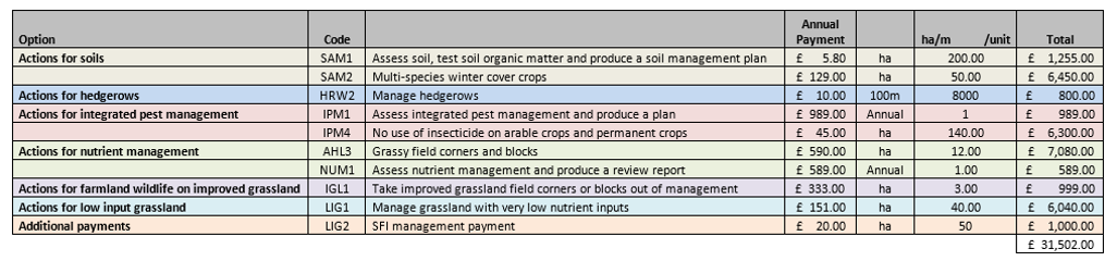 How it works: the SFI scheme seeks to provide simple options that fit in with existing cropping and help support removing difficult and unprofitable areas from production. Table summarises of options and payments on a 200ha mixed farm in mid Northumberland, with no existing CS scheme; cropping is a mix of winter and spring crops with 40ha of unproductive grassland let on licence for mowing. There are wet and unproductive areas in most fields and an objective to grow a cover crop before spring cereals to aid soil conditioning