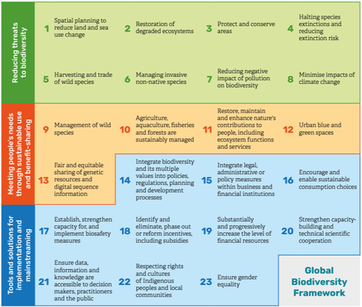 (Kunming-Montreal Global Biodiversity Framework Themes and Targets, thanks to: The Wildlife Trusts)