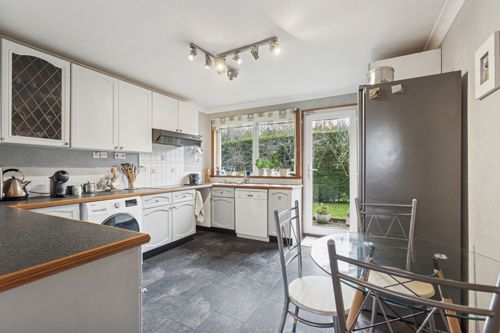 The accommodation includes a dining room with glass doors leading through to the spacious and bright living room which has wonderful views overlooking the gardens and beyond. The well-presented kitchen has a good range of integrated appliances and space for a table.