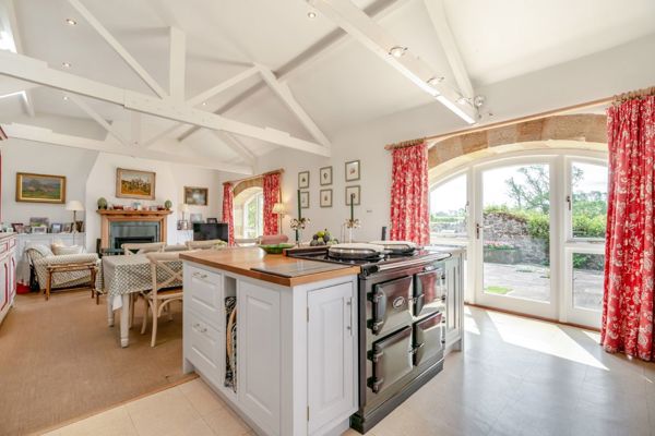 The luxurious kitchen has an electric Aga with a central island around it, and an excellent range of floor and wall units along with integrated appliances. At the other end of the kitchen is an open fire and ample space for both dining and comfortable sitting.