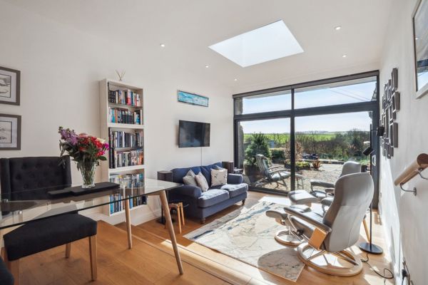 A Jotul wood burning stove compliments the painted original stone walls and creates a warm and cosy living room complete with dual aspect windows. The garden room, with full height sliding doors fitted with electric blinds and a sky light window, is a superb room from where to admire the garden and views beyond.