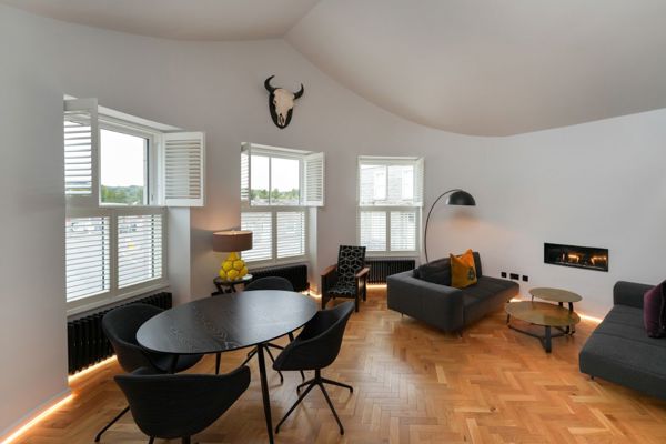 The bright open plan kitchen, dining and living area showcases the property’s standout features: high ceilings, sash and case style windows with modern shutters and the curved front elevation that floods the space with natural light.