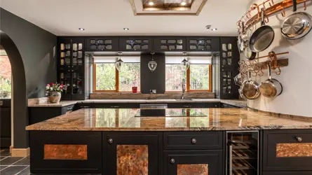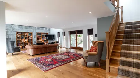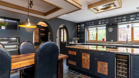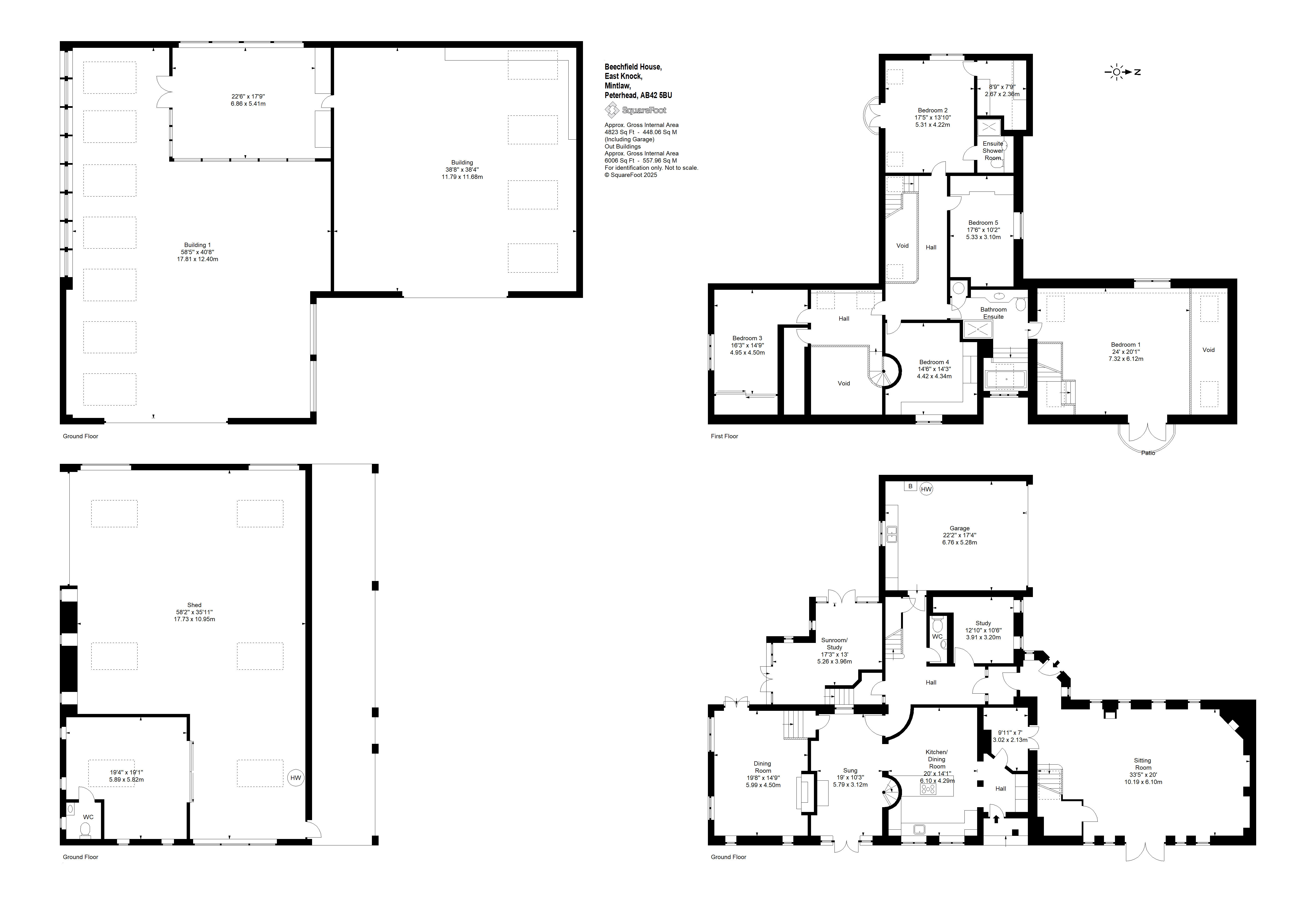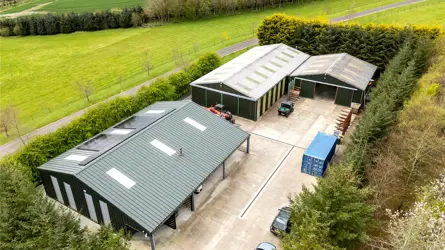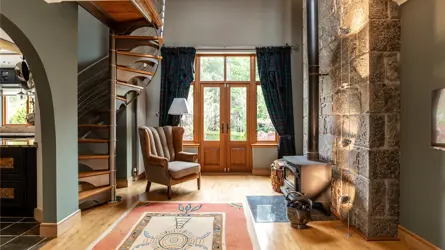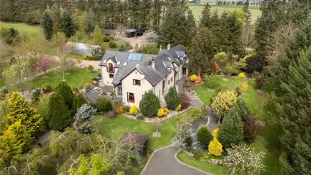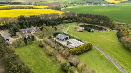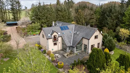 Understood to have been built in 2000, this bespoke home is a truly original property, designed and crafted by the current owner, with a wealth of superb features including, underfloor heating at ground level to the extension, Sonos music system to the living room, bedroom and bathroom. Remote controlled velux windows and blinds and a Lutron lighting system. The accommodation has a versatility second to none. The paddocks, landscaped garden grounds, outbuildings and equestrian facilities offer a wonderful outdoor lifestyle all within an extremely private setting. Located to the South of Mintlaw, ample amenities are available in proximity as are many commuting routes, with Aberdeen Airport just half an hours drive away. The mature landscaped gardens and pond offer an oasis of comfort with relaxation and entertainment uppermost.Detached and spanning over two floors, the property has been extended in 2010 and offers versatile yet luxurious accommodation at every turn. The exterior of the property is a timber pitch roof with slated roof and the build is solid concrete block with pointed granite quoins. Windows and doors are fitted with double glazed units and the facias and soffits are also timber. A blend of build materials has been used in the interior of Beechfield House including glass, metal and timber which contrast throughout many of the rooms, creating attractive decorative features.The hand crafted front exterior door sets the tone for this one-of-a-kind property and the expansive home offers multiple spaces for a large family or for those who enjoy entertaining. The vestibule opens onto a spacious hallway where a WC and study are located. A stylish Oak panel and ornate metal balustrade staircase leads to the upper level. An open doorway from the vestibule guides you to a warm and inviting sitting room where the ceiling transcends the upper floor creating a wonderful lofty ambience. The feature wall of hand-crafted wooden shelving and stonework is really special and the authentic church bell inset adds to unique essence of the home. A set of French doors leads to a stone patio. The real heart of the home is the kitchen dining room with snug set on semi open plan. A comprehensive range of contemporary wall and base mounted units host integrated appliances, offering a striking and most unique finish. A marble topped peninsular unit is the ideal social cooking and entertaining hub including inset drinks fridge and induction hob. Stepping away from the kitchen diner, the snug is a peaceful room with a set of French doors allowing access to outside and a high ingress of natural light to flood in. The sleek metal and oak spiral staircase leads to the upper level. A few steps down and the dining room is equally an attractive and most useful room. versatile in location withing the interior, this room could have a variety of uses as desired and features a working fireplace with timber surround. The elongated windows and set of French doors frame the landscaped gardens beautifully. Completing the ground floor is the large sunroom which is warm and inviting space to relax and enjoy the views to the garden grounds. Two sets of French doors allow access out on the surrounding patio area.Ascending to the upper level the hallway gives access to most of the bedroom accommodation. The exquisite master bedroom is located above the sitting room on the ground floor and features a glass balcony and view to below. A staircase connects the two rooms, and the master bedroom also benefits from access to a large balcony terrace from where the wonderful gardens can be fully enjoyed. The master bedroom also has a sleek and contemporary jack and jill en-suite bathroom. Bedrooms three, four and five are well appointed double rooms with views to the gardens and fitted wardrobe space. Bedroom two is an exceptionally large room with walk in wardrobe space as well as an ensuite shower room and access to a second balcony. With an excellent balance of practical living, contemporary design and flexible living/ entertaining spaces both inside and out along with the three significant metal clad agricultural buildings and the timber clad studio and equestrian facilities this home offers the full package.Beechfield House stands in approximately 14 acres of garden grounds and and the electric gated entrance has an intercom system. The private driveway sweeps through the grounds flanked by trees. The pond area has been allowed to remain wild and natural enticing an array of natural wildlife and birds and access roads have been carefully created to meander through the grounds leading to various peaceful areas where the tranquillity can be fully enjoyed. There is plenty of parking to the front of the house and there is a second parking area also. The expansive and extremely well stocked gardens surround the house are a true testament to the homeowner as the site was originally a bare, every hedge, shrub and tree has been planted over the last 25 years and has grown the established gardens there is today. There is a well stocked orchard with apples, pears and plums and the pond is stocked with Orfe. There is a fleet of Husquarna lawnmowers installed throughout the grounds. Fenced grazing paddocks are ideal for equestrian enthusiasts and there are timber stables and a former menage area. A timber clad studio will remain as well as a large polytunnel. Set away from the house, a large work yard includes three substantial modern metal clad agricultural buildings which offer a wealth of business opportunities, it is worthy of note that the main driveway splits to allow access to these buildings away from the main house. There is also 13.4 KW Solar Panels with Tesla battery storage. Underfloor heating to the newest building and a hardwired security and alarm system for the property and outbuildings.ACCOMMODATIONGround floor - Entrance vestibule, hall, living room, sitting room,family room, dining kitchen, sun lounge, bedroom/study an