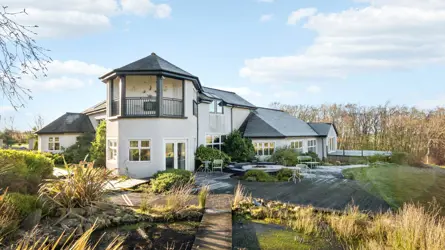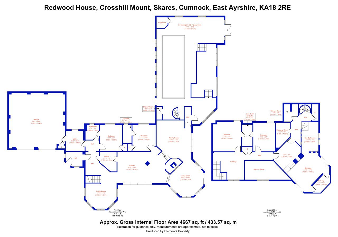Redwood House is a superb private country property located about 2.7 miles from Ochiltree, East Ayrshire. Local services and facilities are available in both Ochiltree and Cumnock (3.5 miles). Ochiltree and Cumnock have primary schooling, local shops and other services. Secondary schooling is located in Cumnock at the Barony Campus which includes schooling and early childhood centres. The County Town of Ayr is about 13 miles distant with an excellent range of amenities and facilities including cinema, hospital, a wide range of shops and supermarkets and a well regarded private school. Kilmarnock offers a wide range of amenities including schooling, cinema, hospital and an excellent range of shops and professional services and a sports centre with gymnastics and football facilities. Redwood House is an easy drive via the A70 trunk road whilst Glasgow is about 40 miles to the north via the M77 and Edinburgh is about 66 miles. There is a railway station at Auchinleck (5 miles), with regular services to Glasgow and beyond. Glasgow Airport has regular scheduled flights and is 43 miles and Prestwick Airport is 17 miles distant.At Auchinleck Estate there are enjoyable riverside walks to Wallace’s Cave and Peden’s Cave and the River Ayr gorge walk at Mauchline is close by. Auchinleck Mansion House, was built by Lord Auchinleck, James Boswell in the late 1700s. The Scottish classic-style mansion was designed by Robert Adam, one of Scotland’s most famous architects, there is a popular coffee shop (Boswell’s Coach House) within the Estate grounds. Redwood House has views towards the stunning Dumfries House Estate (about 4 miles) and is one of Britain’s most beautiful stately homes with an outstanding collection of 18th century Chippendale furniture and Coach House cafe. The house is open for guided tours, and the 2,000-acre estate, including beautiful walled gardens, an adventure playground, walking paths, is open to the public year-round. The estate is also a focus for a range of training opportunities for young people using traditional skills and crafts.With a pitched slate roof on two storeys, Redwood House is a very impressive country residence protected by extensive garden grounds. It is approached via a shared drive with pillars leading to a large gravelled parking area for several vehicles.Ground Floor: Kitchen, Dining Area, 2 Bedrooms (one en suite), Bathroom, Living / Family Room, Utility Room, Pantry.First Floor: Galleried landing, Master Bedroom Suite with Spa bath, separate shower, dressing room. 2 Bedrooms (Jack and Jill bathroom).Redwood House was designed by the current owner and has been equipped to a high standard. The ground floor is beautifully flooded with natural light, thanks to its open-plan design and south-facing dining area that frames tranquil views across the private gardens. The kitchen offers a range of fitted storage cupboards finished in cream with fitted appliances including integrated dishwasher, a large island unit with LPG gas hob, integrated oven and fitted storage. Set just off of the kitchen, there is a convenient walk-in pantry with four freezers and further storage. It has an impressive living / family room which opens out to the rear patio with a large deck seating area. Two spacious bedrooms with attached bathrooms are located on the ground floor. The utility room has a washing machine, tumble dryer and floor to ceiling cupboards providing ample storage. The ground floor has underfloor heating with panel radiators on the first floor. Stairs lead to the galleried first-floor hallway, where a further living / study area is beautifully illuminated by natural light streaming through Velux windows, creating a bright and inviting space. There are two bedrooms sharing a Jack and Jill bathroom, which then leads to the stunning master suite, a true sanctuary offering a spacious and elegant bedroom with dual doors opening onto a covered balcony seating area. From here, the outlook stretches across the landscaped garden grounds and pond, providing the perfect vantage point to observe wildlife and enjoy the changing seasons. The suite is enhanced by a deep-set spa bath with far-reaching countryside views, alongside a separate walk-in shower, w.c., wash hand basin, and a well-appointed dressing room.Redwood House is fully double glazed with ample storage throughout. The main house has lpg gas central heating with underfloor heating on the ground floor. With substantial and flexible accommodation throughout, the property can be adjusted to suit a variety of interests.Attached to the house, is the fabulous swimming pool complex which adds a resort-like dimension to daily life. This space is heated by a separate boiler. There is a gym area, shower/dressing area and a spiral staircase leads to the master suite.Whether enjoying the warmth of underfloor heating in winter or the refreshing pool in summer, Redwood House embodies a refined yet flexible lifestyle, blending comfort, sophistication, and leisure in equal measure.Patio doors lead to a large deck area providing excellent relaxing and entertaining space with views over the expansive gardens and surrounding countryside to the north and west. The well maintained established gardens wrap around the house and are mainly laid to lawn interspersed with areas of planting with mature trees and shrubs providing a wealth of colour throughout spring and summer and a garden pond.Double Garage:Concrete floor and electric doors.ACCESSThere is a Right of Access over points AB on the plan.There is an annual wayleave payment for the electricity pole.DIRECTIONSFrom Ayr take the A70 towards Cumnock. Pass through the village of Ochiltree and continue for about 1.5 miles and turn right (signed for Skares). Proceed along this road and continue up the hill passing the fork on the left hand side, Redwood House is then on the left hand side after about 0.22 mile.POST CODEKA18 2REWHAT3WORDS//w3w.co/pepper.date.extentFIXTURES AND FITT
