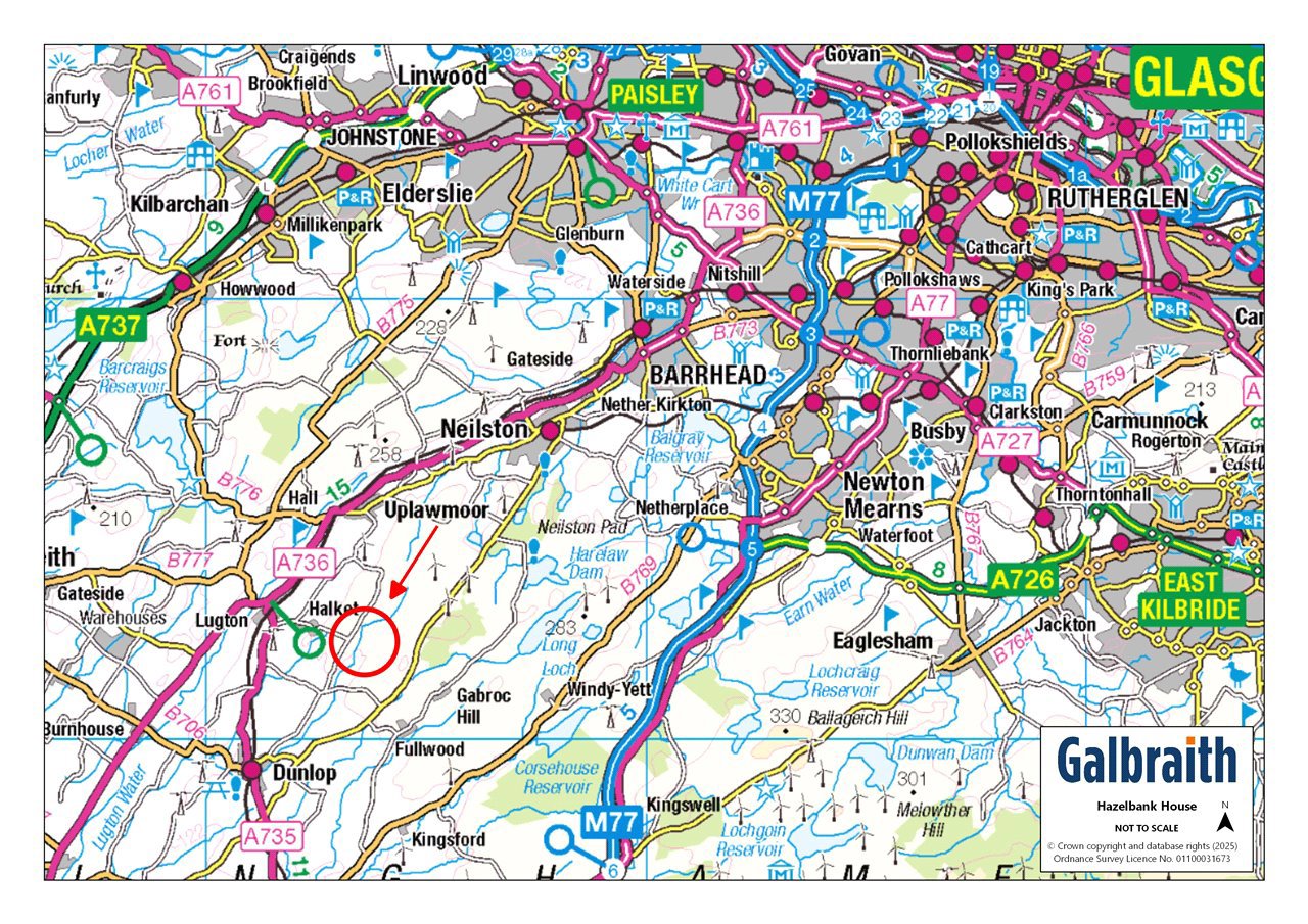 Hazelbank House is a beautifully appointed detached Georgian country house with superb equestrian facilities set in a peaceful rural situation yet very well connected location with splendid views across open countryside, boasting a purpose-built stable block, outdoor riding arena and adjoining paddocks. South facing with a wonderful open outlook across its own land, Hazelbank House is situated within a cluster of country properties about 2.5 miles north of Dunlop in Ayrshire. It is some 16 miles from Glasgow City Centre which is easily accessible via the A736 Glasgow/Irvine Road. The popular conservation village of Dunlop has a post office, village shop, bakery and restaurant, an excellent primary school and railway station with regular services to Glasgow. The house is situated close to the popular town of Stewarton (6 miles) with primary and secondary schooling and the private schools of Belmont House and Hutchesons’ are within easy travelling distance. Prestwick and Glasgow Airports are easily reachable being 24 and 12 miles distant respectively. Ayrshire is renowned for its golf courses which include Turnberry, Royal Troon and Prestwick. The Morris Equestrian Centre is about 10 miles distant. Yachting facilities can be found at the marinas in Troon, Ardrossan and Largs and some of Ayrshire’s most beautiful beaches are close by at Troon, Ayr and Irvine. Hazelbank House dates from 1826 and is built over two storeys with a single storey extension, of stone under a pitched slate roof, it was the original farmhouse for Hazelbank Farm. It has substantial and flexible accommodation including entrance hall, kitchen/dining/living area, living room, utility room, office, two bedrooms and shower room on the ground floor and three bedrooms and a bathroom on the first floor. There is a sheltered and private garden with beautiful lawns and grounds, an outdoor riding arena, 7 stables, tack room and hay store and about 9.89 acres of grazing land with stunning rural views.Internally the property comprises well-proportioned rooms, the entrance vestibule leads through a half-glazed door to an impressive and welcoming entrance hall with stone pillar, oak flooring, ornate cornicing and ceiling rose. The bright living room also has oak flooring, sash and case windows, original deep skirtings and shutters and a stone open fireplace. The heart of the home is the stunning kitchen/dining/living room with vaulted beamed ceiling, tiled flooring with under floor heating and a range of fitted base and wall units and Quartz worktops, butler sink with Quooker tap, integrated dishwasher, AEG fridge/freezer, electric Rangemaster with double oven, grill and 6 ring gas hob. The living area has a Jotul multi fuel stove set in stone backdrop with slate hearth and oak mantel. There is a glazed door to the gardens and patio area from which the fabulous views can be fully appreciated. The office is fitted with half height wood panelling. The utility room has tiled flooring, plumbing for a washing machine, tumble drier and additional fridge and freezer if required. There is access to the garden via a porch from the utility room. The single storey extension is from the kitchen where there are two double bedrooms and a fully tiled shower room with circular shower enclosure, w.c., wash hand basin, underfloor heating and heated towel rail. There is access to a small enclosed garden from this wing of the house making it suitable as a self-contained annexe if required. A beautiful sweeping staircase rises from the hall to the first floor with ornate cornicing and ceiling rose. There are three spacious double bedrooms, the master having dual aspect windows. The bathroom is fully tiled with bath, separate shower cubicle, w.c., wash hand basin, two heated towel rails and benefits from electric underfloor heating. The property is fully double glazed and benefits from ample cupboard space.GARDEN (AND GROUNDS) Gates lead to the extensive gravel drive to the front of the property where there is parking space for several cars. The extensive well-established and beautifully maintained gardens with breathtaking views are bounded by a partially walled garden and an evergreen laurel hedge, there is an area of lawn, pathways, mature trees and shrubbery providing year- round colour. The patio has steps leading down to the formal lawn and beyond to the grazing land. LANDThere are 9.89 acres of grazing land over two paddocks with the Glazert Burn running through both fields, there is also a small area of mixed woodland and a field shelter. There is access to the land from the gardens and a gate from the track. The land is between 185m to 195m above sea level and classified as a mix of 4(2) and 5(1) by the James Hutton Institute. STABLESThe superb u-shaped courtyard stable block with clock tower comprises 7 stables in total and hay store. 5 stables (3: 12’ x 12’ and 2: 14’ x 13’) of breezeblock and 2 stables (12’ x 12’), timber framed, 4 automatic drinker bowls, secure insulated tack room (11’9” x 10’6”) with saddle racks and bridle hooks and storage. The equestrian facilities benefit from outside water, electricity, a concrete yard area and parking for a number of vehicles and horse boxes. Adjacent to the stables is the all-weather outdoor riding area (about 42m x 22m) with sand and rubber surface and large mirror (2.4m x 1.2m). The stables and riding arena can be reached by a separate access from the main house.OUTBUILDINGSThe outbuildings include a lean-to Greenhouse (attached to the house) currently used as a log store. An insulated timber shed which houses the boiler and a stone built bike store.ACCESS/THIRD PARTY RIGHTS OF ACCESS/ SERVITUDES ETCThere is shared maintenance over the drive to Hazelbank House between each of the 5 residents marked A-B on the site plan. Hazelbank House has sole maintenance for the road from the House leading to the small bridge beyond the stable block marked B-C on the site plan.DIRECTIONS