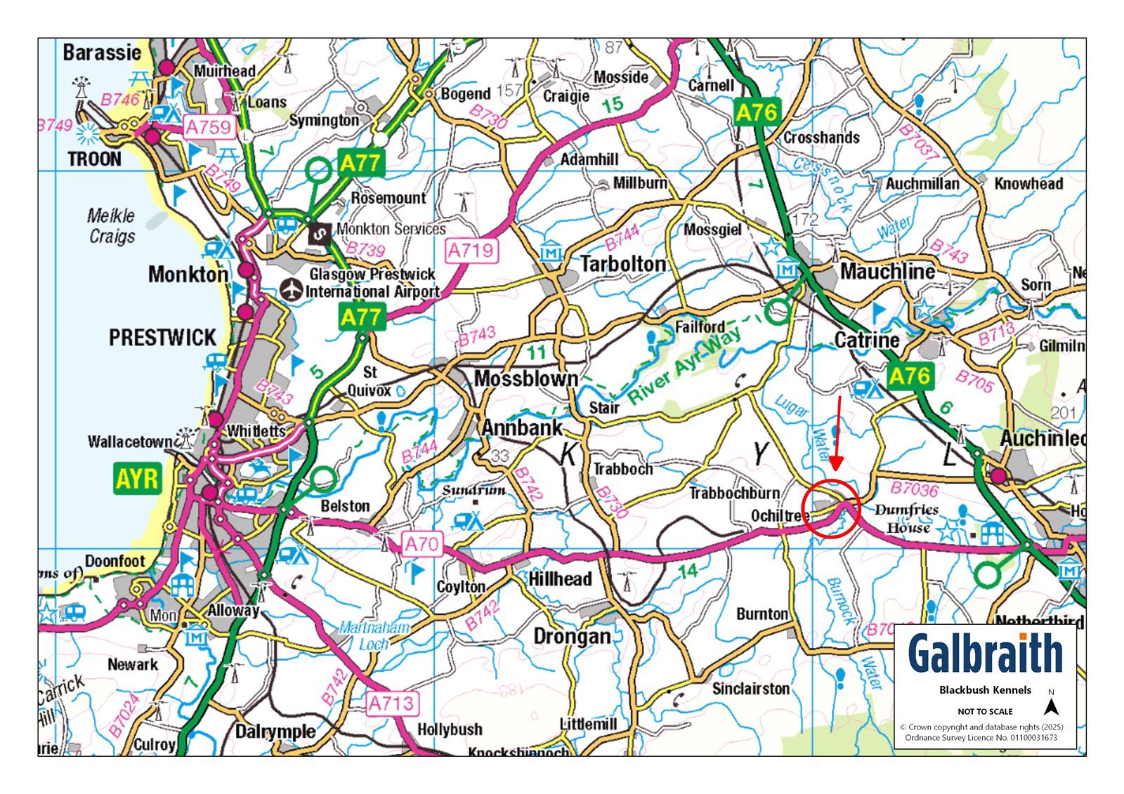 Blackbush Kennels is a Category C listed cottage nestled in a private position on the outskirts of the conservation village of Ochiltree, which has a primary school, local shop and community hub. Secondary schooling is available at Auchinleck (about 3.5 miles). The County Town of Ayr is about 11 miles distant with an excellent range of amenities and facilities including cinema, hospital, a wide range of shops and supermarkets and a well-regarded private school. Glasgow, about 39 miles to the north, is within easily commuting distance via the M77 motorway. There are railway stations at Auchinleck and Ayr with regular services to Glasgow and beyond. Glasgow Prestwick Airport is served by a good range of international flights. Ayrshire is renowned for its range of outdoor pursuits. There are a number of world-renowned golf courses including Royal Troon, Turnberry and Prestwick Golf Club. The racecourse at Ayr provides regular fixtures. Excellent yachting facilities are available at the marinas in Ardrossan, Troon, Largs and Inverkip. Ayrshire is famous as the birthplace of Robert Burns. At Auchinleck Estate there are enjoyable riverside walks to Wallace’s Cave and Peden’s Cave and the River Ayr gorge walk at Mauchline is close by. Auchinleck Mansion House, was built by Lord Auchinleck, James Boswell in the late 1700s. The Scottish classic-style mansion was designed by Robert Adam, one of Scotland’s most famous architects, there is a popular coffee shop (Boswell’s Coach House) within the Estate grounds. Dumfries House Estate (about 4 miles) is one of Britain’s most beautiful stately homes with an outstanding collection of 18th century furniture, beautiful walled gardens and coffee house. Blackbush built in the 1800’s of stone under a slate roof exudes character and period charm, with the potential for modern update to create a truly delightful home. The front door opens into a vestibule with an attractive stained-glass door into the hall. The internal layout is adaptable and offers spacious accommodation over two floors, the ground floor comprises a comfortable living room with wood burning stove set in a wooden surround, ornate cornicing, ceiling rose and laminate flooring which flows into the dining room. The sitting room has a beautiful ornate ceiling, open fire set in cast iron and wooden surround, French doors open into a study/bedroom 5. The kitchen is fitted with base and wall units, integral fridge freezer, dishwasher, electric hob and extractor fan and a lovely porcelain tiled floor. The conservatory is a wonderful space from which to enjoy the countryside views and opens into the garden. Ancillary accommodation in the form of a shower room, porch/storage area and staff w.c., puppy room, dog conservatory complete the ground floor. Stairs rise from the hall to four bedrooms, the master with fitted wardrobes and a walk-in cupboard, the bathroom is fully tiled with bath, w.c. and wash hand basin. There is a separate staircase from the kitchen to a store room.There is a double garage with roller door, power, light and water which is currently being utilised as part of the business. There is access from here to the 25 kennels. (The property has a licence for 30 kennels).The long-established and reputable boarding kennels business is available by separate negotiation with the seller. This presents a fantastic opportunity for those seeking a lifestyle change or an existing business looking to expand.GARDEN Step outside and be captivated by the breathtaking panoramic views that stretch across rolling fields and verdant landscapes from the private garden. To the rear there is a fully enclosed exercise paddock.SOLAR PANELSThere are 16 solar panels.RATEABLE VALUEThe kennels currently have a rateable value of £3,050.FLOOD RISKFlood maps of the area can be viewed at https://map.sepa.org.uk/floodmaps/FloodRisk/SearchThere is no flood risk at Blackbush Kennels.HISTORIC ENVIRONMENT SCOTLAND Blackbush is designated as a Category C Listed Building.ACCESS/THIRD PARTY RIGHTS OF ACCESS/ SERVITUDES ETCThere is a shared right of access over the private road with shared maintenance.DIRECTIONS From Ayr take the A70 towards Cumnock. On reaching Ochiltree take the first road on the left on to Main Street. Turn left (just before the ‘School Patrol’ sign) onto a private road. Blackbush Kennels is at the end on the right hand side.POST CODE KA18 2PT WHAT3WORDSTo find this property location to within 3 metres, download and use What3Words and enter the following 3 words: ///classed.garage.ironicFIXTURES AND FITTINGSNo items are included unless specifically mentioned in these particulars.VIEWINGSStrictly by appointment with the Selling Agents.