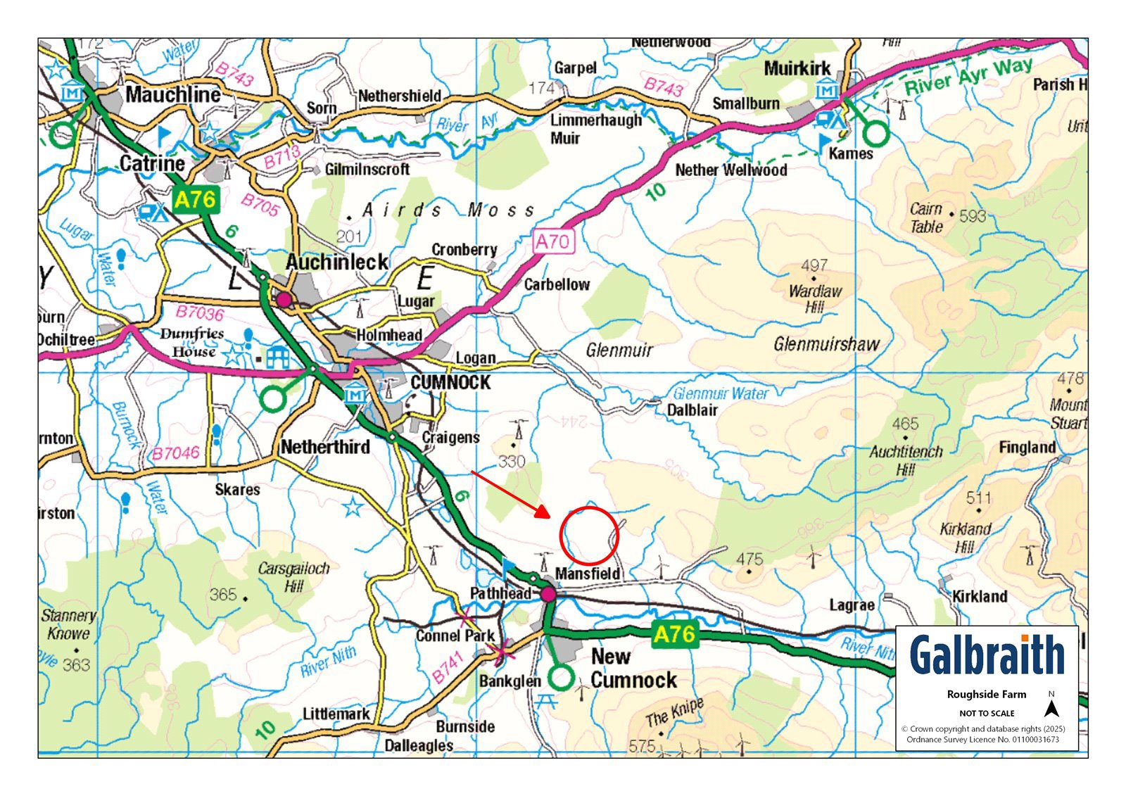 Roughside Farm is an attractive farmhouse comprising a range of modern and traditional buildings with land in an accessible location by New Cumnock. The farm is situated about 7 miles from Cumnock which has a wider range of facilities and the county town of Ayr is about 22 miles to the west. The Barony Campus in Cumnock has primary schooling, supported learning centre and secondary schooling, medical practice and local shops. The refurbished New Cumnock outdoor swimming pool (The Tamar Manoukian Pool) is open for the community to enjoy. There are excellent transport links in the area with a regular train service to Glasgow from New Cumnock and Ayr (22 miles), Glasgow Prestwick Airport is about 26 miles away with regular scheduled flights and Glasgow International Airport is approximately 48 miles. Ayrshire is renowned for its many golf courses, including the world-famous courses at Royal Troon and Turnberry. There is the popular Racecourse in Ayr and excellent yachting facilities at the Marina in Troon. Dumfries House Estate (about 9 miles) is one of Britain’s most beautiful stately homes with an outstanding collection of 18th century furniture, beautiful walled gardens and coffee house. Auchinleck Estate (12 miles) has a popular coffee shop (Boswell’s Coach House) within the Estate grounds, along with enjoyable riverside walks.The New Cumnock Access Network Paths has developed some interesting local walks in the area including the Knockshinnoch Lagoons which goes round a 130 hectare Scottish Wildlife Trust reserve, Burns Cairn and Glen Afton. Blackcraig Hill, is one of Ayrshire’s highest hills at 2,296 feet above sea level, along with three neighbouring hills all over 2,000 feet which can also be climbed. The views down the glen from Blackcraig Hill are particularly stunning on a clear day.Roughside farmhouse is a fine house built of stone under a slate roof with accommodation over two storeys. It comprises sitting room, living room, three bedrooms and kitchen with floor and wall units, integrated electric hob and electric oven. There is a stylish four-piece bathroom suite, complemented by two practical storerooms, offering ample storage or potential utility space. The farmhouse is approached via a concrete drive leading to the house, lodge and the farm buildings.Situated opposite the farmhouse, the lodge built of timber construction under a pitched roof, offers spacious accommodation including three bedrooms, living room, kitchen, shower room, and a sunroom, all enjoying lovely views across the open countryside. Adjoining the farmhouse are stone and slate traditional buildings which provide useful storage and subject to the necessary planning consents may also be suitable for conversion.Outhouse (About 5.56m x 2.32m)Attached outbuilding of masonry construction under a pitched and slated roof.Milk Parlour (About 13.74m x 6.10m)Storage area (Abut 4.64m x 2.99m)Attached structure of stone construction under a pitched roof, clad externally with slate and metal profile sheeting.Long Barn Room 1(About 17.72m x 5.08m)Room 2 (About 6.63m x 4.94m)Room 3 (About 10.05m x 4.94m)Detached structure of stone construction under a pitched and slated roof incorporating 16 solar panels.Hay Barn (About 24.27m x 5.49m)Detached steel portal frame barn of steel frame construction with metal external cladding.Hay/Silage Barn (About 16.37m x 6.86m)Detached structure of timber/steel framed construction with a metal clad external finish.The Byre (About 4.95m x 5.06m)Room 2 (About 5.03m x 4.87m)Detached structure of stone construction under a pitched and slated roof.Cow Shed (About 27.08m x 9.42m)Detached structure of brickwork construction under a pitched roof clad externally with corrugated asbestos sheeting.Arched Roof Barn Detached structure of stone construction under a barrel style roof clad externally with metal profile sheeting.Detached Stone OutbuildingDetached structure of stone construction under a pitched and slated roof.The land extends to about 26.34 acres of Grade 5(2) as per the James Hutton Institute soil classification. The land is currently used for grazing. The field to the front of the farmhouse is currently unfenced at the boundary. Prior to the sale completing the seller will erect an appropriate deer/agricultural fence.Prospective purchasers should note early discussions on a proposed wind farm development at Blackwood Farm, New Cumnock to include seven wind turbines reaching up to 200 metres in height, alongside a Battery Energy Storage System (BESS). Buyers are advised to consult East Ayrshire Council planning department directly.WHAT3WORDSTo find this property location to within 3 metres, download and use What3Words and enter the following 3 words: ///mocked.recliner.handbag