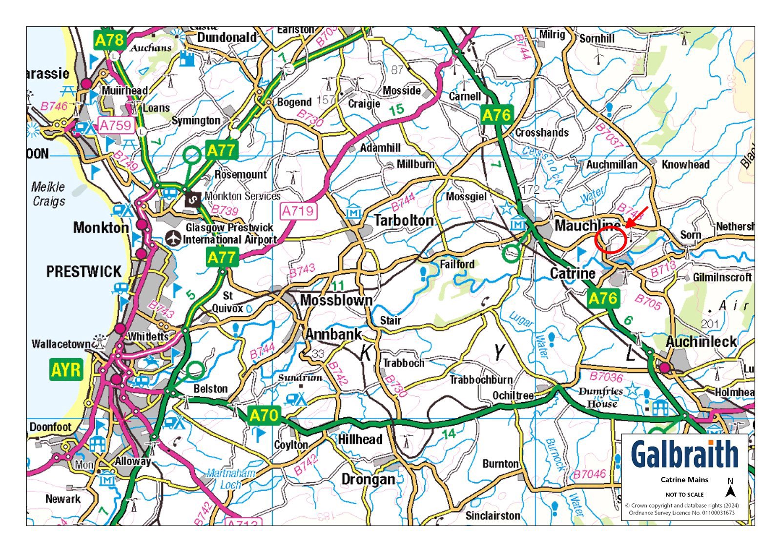Catrine Mains is a charming rural cottage set in a peaceful rural location on the edge of Catrine, a few miles outside the popular village of Mauchline in East Ayrshire. Catrine has a primary school, village pub and store while Mauchline has wider range amenities including doctors’ surgery, post office and Co-op store. Glasgow (32 miles) is easily commutable via the A/M77. Kilmarnock has a mainline railway station providing regular services to Glasgow and beyond. Prestwick and Glasgow Airports are 12.5 miles and 36 miles respectively.Ayrshire is renowned for its many golf courses including Turnberry, Royal Troon and Prestwick. There are excellent yachting facilities at the marinas at Ardrossan, Largs, Inverkip and Troon and there are also many opportunities for game sports in the region with some of south west Scotland’s best salmon and trout fishing available in the area’s lochs and rivers. Ayrshire is famous as the birthplace of Robert Burns. The River Ayr Way (44 miles) has some of Ayrshire’s most stunning and varied scenery, and the Catrine Voes is an enjoyable section of the walk leading to the delightful village of Sorn passing Sorn Castle.Catrine Mains is a stone built cottage under a slate roof requiring a degree of refurbishment. It comprises a kitchen with a Rayburn (untested), floor and wall mounted units, and opens to a large walk-in pantry. The living room has laminate flooring and stone fireplace whilst the sitting room has an attractive wood burning stove. There are two generously sized bedrooms and shower room. Adjoining the house is a former stone and slate byre (5.9m x 9.2m) which, subject to necessary planning consents, could be converted into additional living space. In addition, the cottage benefits from further buildings as outlined below:Outbuilding(About 3.7m x 10m)Stone and slate with concrete floor.Former Stable(About 5.2m x 4.5m)Stone and slate with earth floor. Electricity.Storage Area(About 5.2m x 3.3m)Stone and slate.Hay Shed(About 6.2m x 13.6m)Timer pole construction with tin cladding.GARDEN (AND GROUNDS)There is a small easily maintained garden to the front bounded by privet hedging, to the rear there is ample parking in the courtyard and to the side the garden is mainly grass.There is an additional 0.31 Ac of amenity land opposite the house.IMPORTANT NOTEAnyone interested in the additional land should discuss matters with the selling agents.