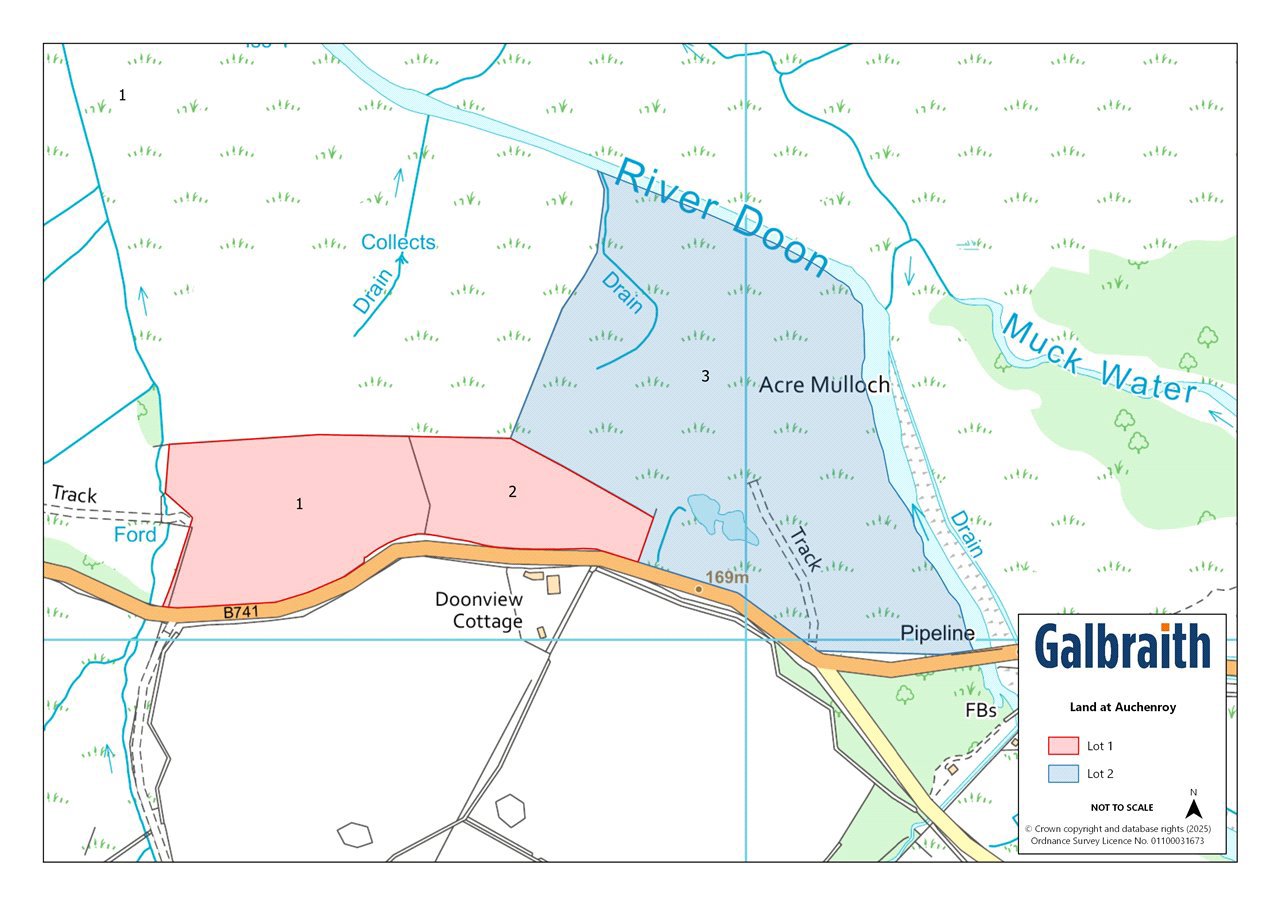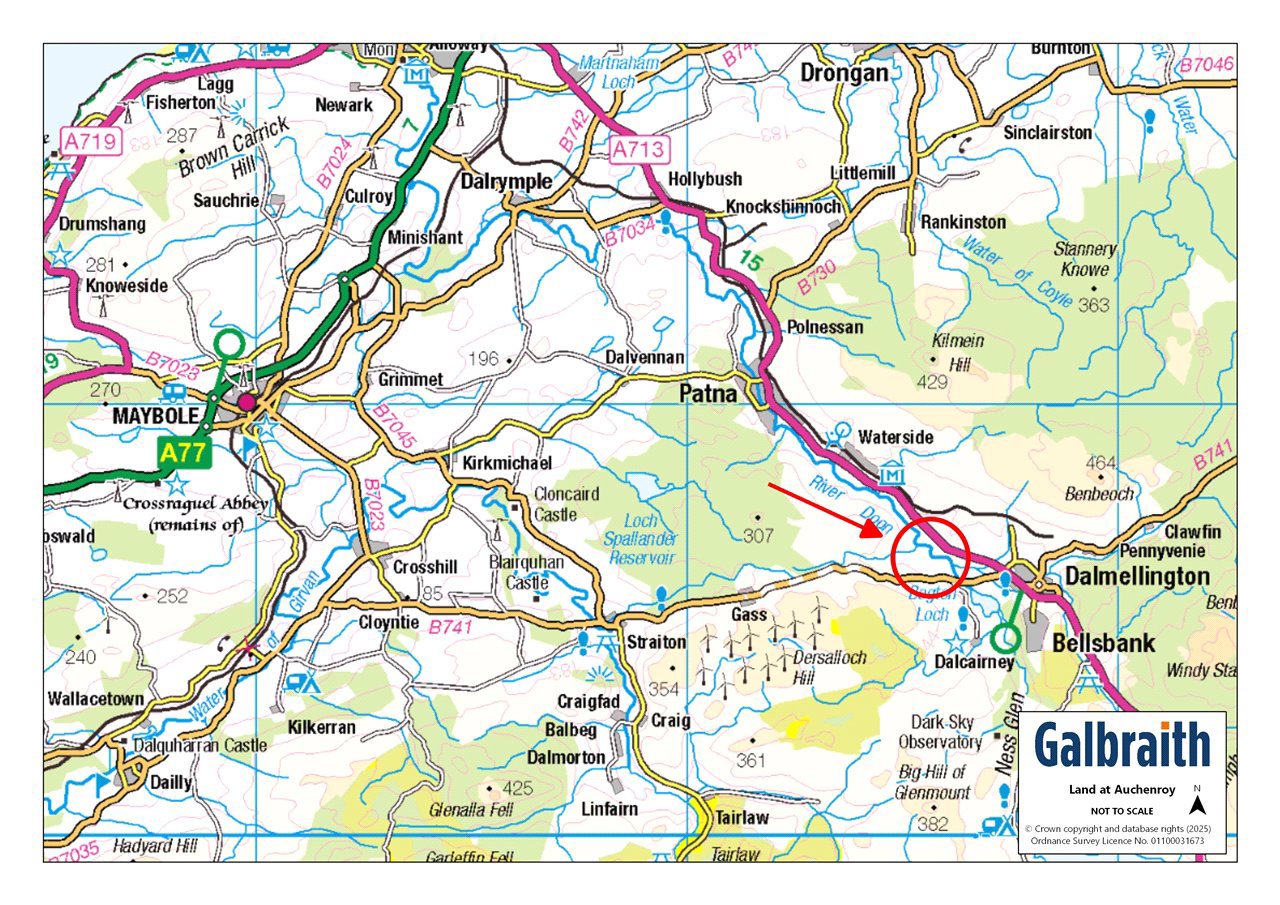 The Land at Auchenroy is situated close to the town of Dalmellington in East Ayrshire.The Land at Auchenroy extends in total to approximately 29.06 Ac (11.76 Ha) and is contained within one block. The land is graded by the James Hutton Institute as a mix of Grade 4(1), 4(2) and Grade 5(2) land and is currently used for sheep grazing purposes. A proportion of the land is served by a natural water supply and most of the boundary is in stock proof condition however the northeastern boundary is the river Doon.Lot 1The land within Lot 1 extends to approximately 9.24 Ac (3.74 Ha) in total and can be accessed directly off the B741. The land rises from 164m to 190m above sea level.Lot 2The land within Lot 2 extends to approximately 19.82 Ac (8.02 Ha) in total and can be accessed directly off the B741. The land rises from 160m to 172m above sea level.METHOD OF SALELand at Auchenroy is offered for sale as a whole or in 2 lots.IACSThe land is registered for IACS purposes. Entitlements are available by separate negotiation.NITRATE VULNERABLE ZONE (NVZ)The Land at Auchenroy is not included within a Nitrate Vulnerable Zone.LESS-FAVOURED AREA SUPPORT SCHEME (LFASS)All the land has been designated as being within a Less Favoured Area (Severely Disadvantaged).SCOTTISH GOVERNMENT RURAL PAYMENTS AND INSPECTIONS DIRECTORATERussell House, King Street, Ayr, KA8 0BE Tel 01292 291300MINERALSThe mineral rights are included in so far as they are owned.TIMBERAll fallen and standing timber is included in the sale as so far as it is owned by the seller.SPORTING RIGHTSIn so far as these rights form part of the property title they are included within the sale.DEPOSITA deposit of 10% of the purchase price shall be paid within seven days of completion of Missives. Deposit will be non-refundable in the event of the purchaser failing to complete for reasons not attributable to the Seller or their Agents.THIRD PARTY RIGHTS & SERVITUDESThe subjects are sold together with and subject to all existing rights of way, servitudes, wayleaves and others whether contained in the Title Deeds or otherwise, and purchasers will be deemed as satisfied themselves in respect thereof.DIRECTIONSFrom Ayr, take the A713 signposted for Castle Douglas. After 15 miles and upon your approach to Dalmellington, take a right turn signposted for Straiton onto the B741. Continue on this road for 0.7 mile and the land will be on your right.POST CODEKA6 7QAWHAT3WORDSTo find this property location to within 3 metres, download and use What3Words and enter the following 3 words: ///headstone.beard.learn