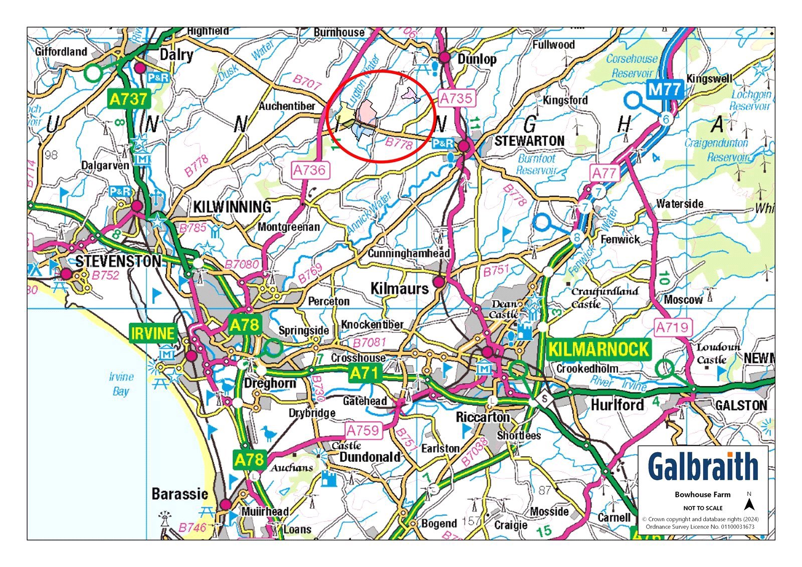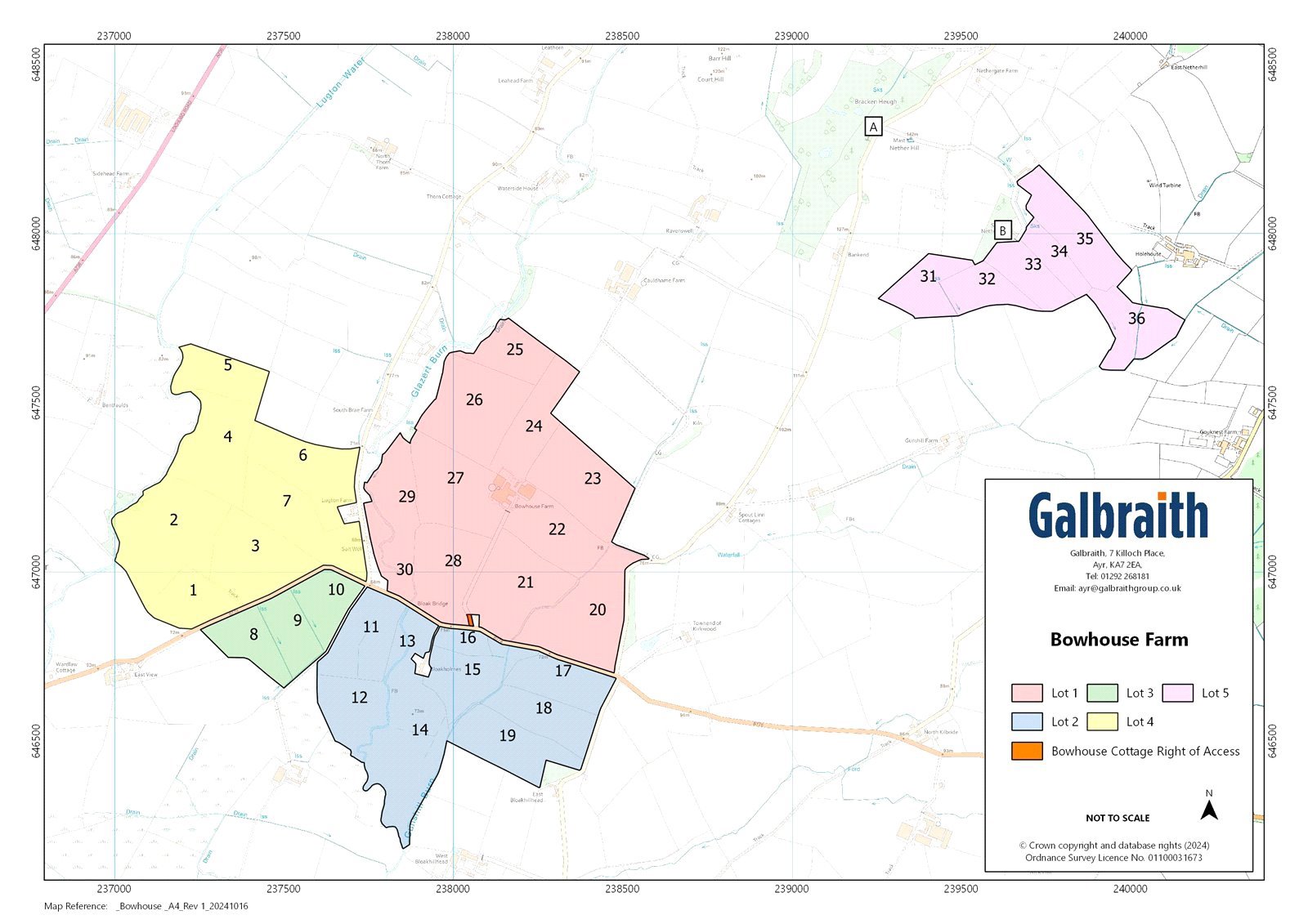Bowhouse Farm is situated in a peaceful setting close to the conservation village of Dunlop, East Ayrshire in an area suited to both dairy, beef and other mixed farming enterprises and is well placed for access to Stewarton (3 miles), Kilmarnock (7.7 miles) and Glasgow (24 miles). Dunlop has a post office, village shop, artisan shop and bakery, and railway station with regular services to Glasgow. Stewarton (about 3.5 miles) is well serviced by a good variety of local butchers, delicatessen, coffee shops, beauty salons and sports centre and enjoys a thriving community. Primary and secondary schooling are available and private schooling at Belmont House, Wellington and Hutchesons are within easy travelling distance. Glasgow and Prestwick Airports are equidistant at about 16 miles distant. Ayrshire is renowned for its world-famous golf courses including Turnberry, Prestwick and Royal Troon. There is a popular racecourse in Ayr and excellent yachting facilities at the marinas in Troon, Ardrossan and Largs. Morris Equestrian Centre (6.7 miles) is a state of the art equestrian facility with a comprehensive range of events throughout the year. DESCRIPTION Bowhouse Farm is a former dairy farm milking around 200 cows and comprises a well-presented four-bedroom traditional farmhouse, a range of modern and traditional buildings and circa 142.91 Ha (353.13 Ac) of excellent quality grazing and silage land of a predominantly ploughable nature. The majority of the land is of Grade 3 and Grade 4 quality. The farm is currently vacant and will be offered with vacant possession. METHOD OF SALEThe sale of Bowhouse Farm offers purchasers an opportunity to acquire the farm either as a whole or in five lots.Lot 1 Bowhouse Farm (Farmhouse, Steading circa 131.28 Ac)Lot 2 Land at Bowhouse (circa 83.67 Ac)Lot 3 Land at Bowhouse (circa 20.39 Ac)Lot 4 Land at Bowhouse (circa 88.86 Ac)Lot 5 Land at Netherhill (circa 45.10 Ac)LOT 1 – Bowhouse Farmhouse, Farm Buildings and Land Bowhouse Farmhouse adjoining the traditional farm steading, is of stone and slate construction and offers spacious accommodation over one and half storeys. The accommodation comprises: four bedrooms, porch, kitchen, lounge, bathroom (w.c., wash hand basin and shower over bath), sitting room, shower room and ample cupboard space.The farmhouse benefits from a garden area to the rear and ample parking within the courtyard. The services include mains water, mains electric, septic tank drainage and oil-fired central heating with the added benefit of coal fires. The farmhouse is mostly double glazed with one window being single glazed. Farm BuildingsAdjoining the farmhouse there are adjoining traditional outbuildings including a former dairy and tank room area, providing numerous useful storage spaces. The farmyard features a concrete apron with ample space for machinery and bale storage. The buildings summarised as follows: 1. Former Feedstore – Storage (14.37m x 6.7m) (Opposite farmhouse and split over three sections) – Of stone construction under fibre cement roof, stone floor with part brick walls and loft area above. There are 16 solar panels on this roof which have been installed within the last 10 years with the power being exported and a FIT payment being received. Further information is available from the Selling Agents. 2. Workshop Shed (21.2m x 8.4m) – Of steel portal frame construction, box profile tin cladding, concrete floor under a tin roof. 3. Former Byre (42.2m x 8.4m) – Of stone wall construction with part slate and part fibre cement roof with concrete floor, housing cubicles and passage with calf pens. 4. Dutch Barn & Adjoining Pole Barn (19.1m x 12.4m) – Of steel portal frame construction with part brick wall, tin cladding, concrete floor under a tin roof. 5. Adjoining Shed (6.7m x 14.6m) – Of steel portal frame construction, tin cladding, brick and stone walls, concrete floor with a section of slats. Housing former calf/bull pens & former byre stalls. 6. Former Parlour Lean-To (4.7m x 21.2m) (adjoining main cubicle house) – Housing former parlour pit and collecting area.7. Lean to Cubicle House (13.5m x 6m) – Of steel portal frame construction, slatted floor, under tin roof. 8. Cubicle House (11.5m x 35m) – Of concrete frame construction (at cost), with central feed passage, fibre cement roof, slatted floor and cubicles. 9. Adjoining Cubicle Shed (14m x 35m) – Of steel portal frame construction, with tin cladding, slatted floor, side feed passage with head locking yokes. 10. Slurry Tower – A recently constructed steel slurry tower with the capacity of approximately 425,200 gallons. There is also a redundant slurry tower adjacent. 11. Silage Pits (26.36m x 28.15m) – Two adjoining indoor silage pits with a section outdoor – of steel portal frame construction, concrete panels, fibre cement roof & cladding. 12. Tin Shed (18.23m x 4.96m) – Of steel portal frame construction, tin cladding, tin roof, hardcore floor. 13. Tin Shed (18m x 8m) – Of steel portal frame construction, tin cladding, tin roof, hardcore floor. 14. Slatted Lean-To (5.6m x 18.3m) – Of steel portal frame construction, under a tin roof with tin clad walls and side feed passage. Connects the tin shed to the main cubicle house. 15. Dairy Complex (32m x 36m) – Of steel portal frame construction, comprising a 10/20 parlour with dairying equipment removed however infrastructure remains in place as well as associated dairy equipment (tank house, pump house, W.C. etc.). Main Cubicle Apex - Of steel portal frame construction, concrete panel walls, slatted floor, tin cladding, under a fibre cement roof, housing cubicles for 180-200 cows. The Land The land at Lot 1 extends to approximately 131.28 Ac which includes miscellaneous areas (farm tracks and steading footprint – 7.86 Ac). The land is principally classified as Grade 3 and 4 by the James Hutton Institute. Most of the farmland is of a ploughable nature but is currently down to grass a