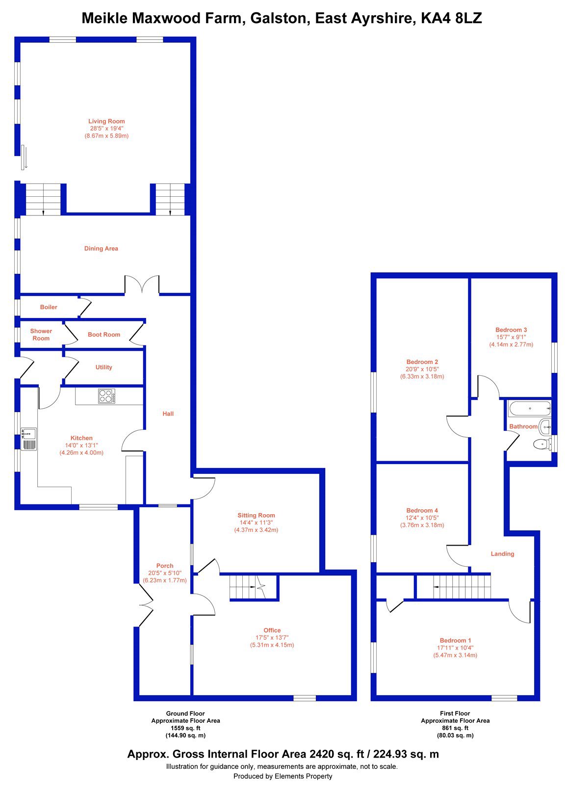 Meikle Maxwood Farm is located in a convenient semi-rural position just a short distance from the popular small town of Galston, East Ayrshire. It comprises a fine attached farmhouse with useful outbuildings including workshop, general purpose storage shed and garage, in a peaceful rural situation with stunning views over the surrounding Ayrshire farmland. It is well placed for access to Kilmarnock (6 miles) and Ayr (16 miles) whilst Glasgow (about 25 miles) can be reached easily via the M77. There are excellent transport links in the area with a regular train service to Glasgow from Kilmarnock whilst Glasgow and Prestwick Airports are 28 miles and 14 miles away respectively. Primary and secondary schooling are available in Galston and private schools at Belmont House and Hutchesons’ in Glasgow and Wellington in Ayr.Galston has a variety of local shops including a superstore. Kilmarnock offers a wider range of facilities including a retail park and cinema whilst Silverburn Shopping Centre is 18 miles distant. Ayrshire is renowned for its many golf courses including the world famous facilities at Royal Troon, Turnberry, and Galston (Loudoun Gowf Club). The Morris Equestrian Centre with fabulous equestrian facilities is 9 miles away. The surrounding rolling countryside of the Irvine Valley offers a network of country lanes, ideal for walking, cycling and hacking. The popular Burn Anne Walk is a pleasant 5 mile circuit starting from Lockhart’s Tower (Barr Castle) in Galston. There are excellent yachting facilities at the marinas at Ardrossan, Largs, Inverkip and Troon.Meikle Maxwood Farm is a handsome attached traditional Ayrshire farmhouse which has lovely rural views from which you can see the ruins of Loudoun Castle. Built on two storeys of stone and slate with a white painted finish, the current owner has lived at Meikle Maxwood Farm for some 35 years. There are outbuildings including a general purpose storage shed, workshop and garage, which could be ideal for stabling or for other business or leisure interests.Ground Floor: Kitchen, Utility Room, The Byre – Living/Dining Room, Sitting Room, Office, Porch, Boot Room, Shower Room, Boiler Room.First Floor: 4 Bedrooms, Bathroom.The kitchen/diner has a range of farmhouse style floor and wall units with integrated double oven and microwave, hob, dish washer, fridge and freezer. There is a useful utility with kitchen units and plumbing for washing machine. The byre – living/dining room, is a wonderful extensive living space providing a raised dining area and patio doors leading to the gardens and a large brick fireplace with calor gas fire. There is a cosy sitting room and office, together with a sun porch which has access to the garden. There is a shower room on the ground floor, together with boot room, boiler room completing the accommodation on the ground floor.On the first floor, there are 4 spacious bedrooms together with a family bathroom with shower over bath.The gardens are down to lawn sheltered by a hawthorn hedge with a gravelled patio seating area. There is a hexagonal summer house with slate roof from which to enjoy the lovely rural views. There is also a potting shed.BUILDINGSGeneral Purpose Storage Shed: About 15.15m x 6.058mBreeze block and corrugated frame with hardcore and earth surface, slate roof.Garage: About 6.36m x 7.049mBrick and slate with power, concrete floor. Up and over door.Workshop: About 7.85m x 5.67mStone and brick with concrete floor, inspection pit, power, slate roof, with floored area above (5.94m x 3.57m), double timber doors.LANDThere is a 6.01 acre paddock west of the farmhouse which is fenced with access from the road and the private drive.The land is graded 3(2) as per the James Hutton Soil Classification Map.RIGHT OF ACCESSMeikle Maxwood Farm is one of 4 properties accessed from a private drive.There is a Right of Access over the drive with shared maintenance.DIRECTIONSFrom Glasgow take the M77 and exit at Junction 5 and turn left onto the A719 for Galston. Proceed to the roundabout at Galston and head straight on into the town. Continue onto the B7037 and turn left onto Clockston Road and turn left at the next turning. Continue for about 0.49 miles and the entrance to Meikle Maxwood Farm is on the right hand side. Proceed along the drive and it is the second property on your left hand side.KA4 8LZWHAT3WORDSTo find this property location to within 3 metres, download and use What3Words and enter the following 3 words: https://w3w.co/enrolling.widely.tastes