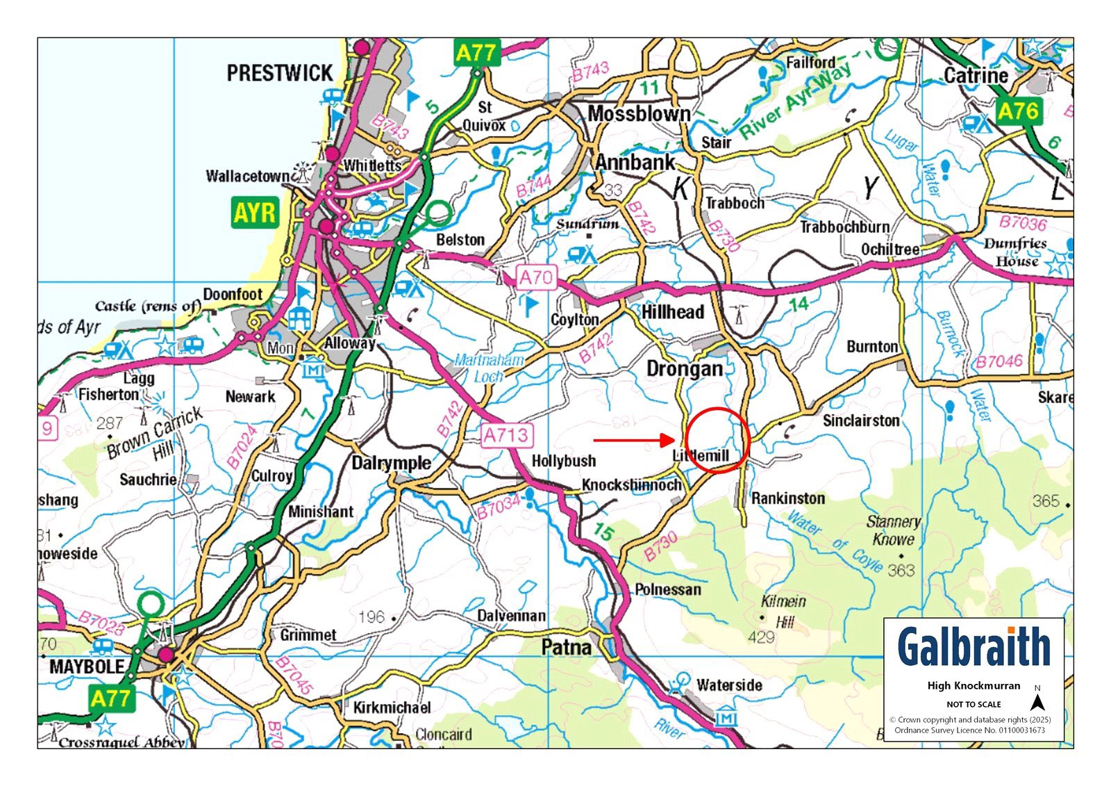 High Knockmurran Farm is situated close to the town of Drongan in East Ayrshire. The established market town of Ayr has a wide range of excellent services including cinema, retail centre, restaurant, leisure facilities and large supermarkets whilst there are basic amenities available within Drongan. Wellington School is the highly regarded private co-educational school in Ayr and there are several well-regarded state schools. Further education is well served by West of Scotland University Campus and Ayr College. Ayr has a mainline railway station with a regular service to Glasgow and beyond. Prestwick Airport, with a comprehensive schedule of international flights, is within 15 miles. Glasgow itself is easily accessible by rail and road via the M77. Ayrshire is renowned for its many golf courses including the world-famous facilities at Turnberry, Royal Troon and Prestwick courses. The popular racecourse in Ayr holds the Scottish Grand National and there are yacht marinas at Troon, Ardrossan and Largs. Salmon and sea trout fishing is available on various Ayrshire rivers including the Doon and the Ayr and the enjoyable River Ayr Way Walk is close by. This rural area is well served by the agricultural supply industry and the farm lies close to the Ayr Market.Lot 2 - Land at High KnockmurranThe Land at High Knockmurran comprises 90.29 Ac (36.54 Ha) of grazing, silage and arable land. It is classified as predominantly Grade 4(1) by the James Hutton Institute meaning the land is capable of producing a narrow range of crops, primarily grassland with short arable breaks of forage crops and cereal. Most of the boundary fencing is in a stock proof condition whilst the land is serviced by a mains water supply. The land rises from around 139m to 173m above sea level.METHOD OF SALEThe land is offered for sale in two lots or as a whole.IACSThe land is registered for IACS purposes. Entitlements are available by separate negotiation.NITRATE VULNERABLE ZONE (NVZ)High Knockmurran Farm is not included within a Nitrate Vulnerable Zone.LESS-FAVOURED AREA SUPPORT SCHEME (LFASS)All the land has been designated as being within a Less Favoured Area.MINERALSThe mineral rights are accepted.TIMBERAll fallen and standing timber is included in the sale as so far as it is owned by the seller.SPORTING RIGHTSIn so far as these rights form part of the property title they are included within the sale.DEPOSITA deposit of 10% of the purchase price shall be paid within seven days of completion of Missives. Deposit will be non-refundable in the event of the purchaser failing to complete for reasons not attributable to the Seller or their Agents.THIRD PARTY RIGHTS & SERVITUDESThe subjects are sold together with and subject to all existing rights of way, servitudes, wayleaves and others whether contained in the Title Deeds or otherwise, and purchasers will be deemed as satisfied themselves in respect thereof. Lots 1 and 2 benefit from a right of access over the private road from the B730 shown as A-B on the site plan with the neighbouring farm having a further right of access over a proportion of the road with shared maintenance obligations. Lot 2 is accessed directly from the private road into field parcel 6.DIRECTIONSFrom Ayr take the A70 in an easternly direction then at Coalhall turn right onto the B730 then continue through Drongan for about 3.5 miles then take a right turn opposite Burnside Farm then follow the private road for 0.3 miles and you will reach the farm.POST CODEKA6 7ENWHAT3WORDSTo find this property location to within 3 metres, download and use What3Words and enter the following 3 words:///forgiving.nutrients.mysteries
