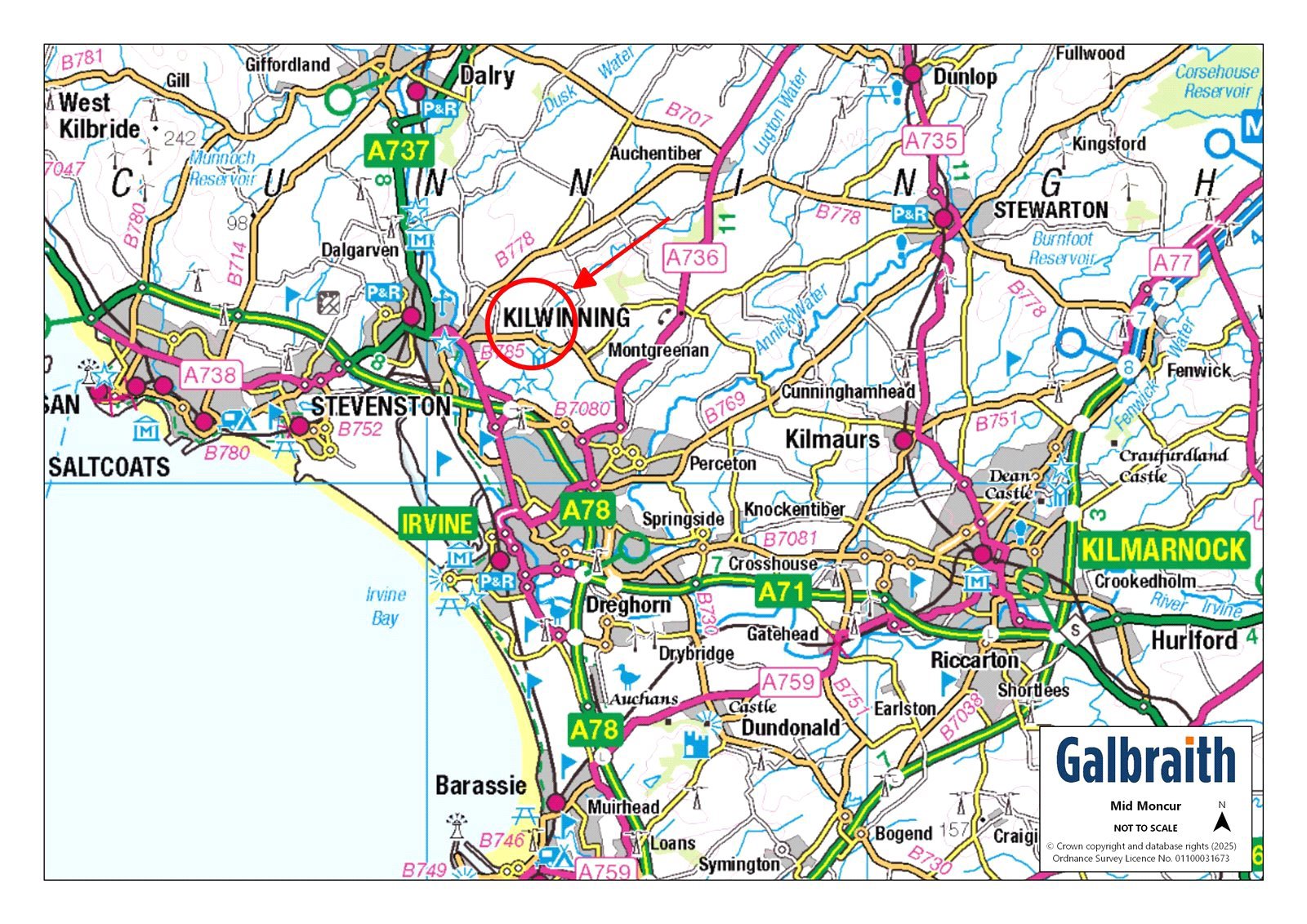 Mid Moncur is situated in a slightly elevated position close to the North Ayrshire town of Kilwinning. Locally there are an excellent range of services and facilities including primary schools and a secondary school whilst more comprehensive service and leisure facilities and retail parks are available in the nearby larger towns of Ayr, Kilmarnock and Irvine. Glasgow is easily reached via the A736 or A737 and Kilwinning also has a railway station on the main line to Glasgow with a regular train service. Glasgow and Prestwick Airports are 23 and 14 miles away respectively.The surrounding countryside is ideal for outdoor pursuits. Nearby Eglinton Country Park offers horse-riding on an extensive network of bridleways, as well as permit fishing for Eglinton Loch and the River Lugton. Ayrshire is renowned for its golf courses which include Royal Troon, Prestwick and Turnberry. Ayr Racecourse holds regular fixtures including the Ayr Gold Cup and Scottish Grand National. Sailing is popular on the Firth of Clyde with yacht marinas at Troon, Largs and Inverkip.DESCRIPTIONLot 1: Mid Moncur is a charming former farmhouse which exudes rustic charm and timeless character. It is built over two storeys of stone under a slate roof and has retained some original features including exposed stone walls, wooden beams and a vaulted ceiling. A degree of sympathetic modernisation would enhance this family home which comprises; a cosy living room with dual aspect windows, wooden flooring, wood burning stove set in a stone surround and beamed ceiling. The kitchen is of an older style and has floor and wall units under a granite worktop and opens into a breakfast room/utility area which overlooks the garden. The dining room opens into the striking vaulted ceiling sitting room flooded with natural light from the triple aspect windows and French doors to the garden, open coal fire set in brick surround and wooden mantel. There is a cloakroom with w.c. and wash hand basin on the ground floor. The staircase with iron spindles and wooden balustrade rises to the first floor which has three bedrooms (master with en suite shower room) and bathroom complete with bath, shower cubicle, w.c. and wash hand basin. The rear garden is mainly down to lawn with some mature trees and there is a 3 acre grazing paddock at the front of the propertyACCESS/THIRD PARTY RIGHTS OF ACCESS/ SERVITUDES ETCThe farmhouse and Plots 3 and 4 will have shared ownership and maintenance of the access drive (hatched black on the plan).IMPORTANT NOTEJapanese Knotweed was identified in the rear garden of the farmhouse (Lot 1) some 15m from the house. The seller has dug it out and removed it from the property.