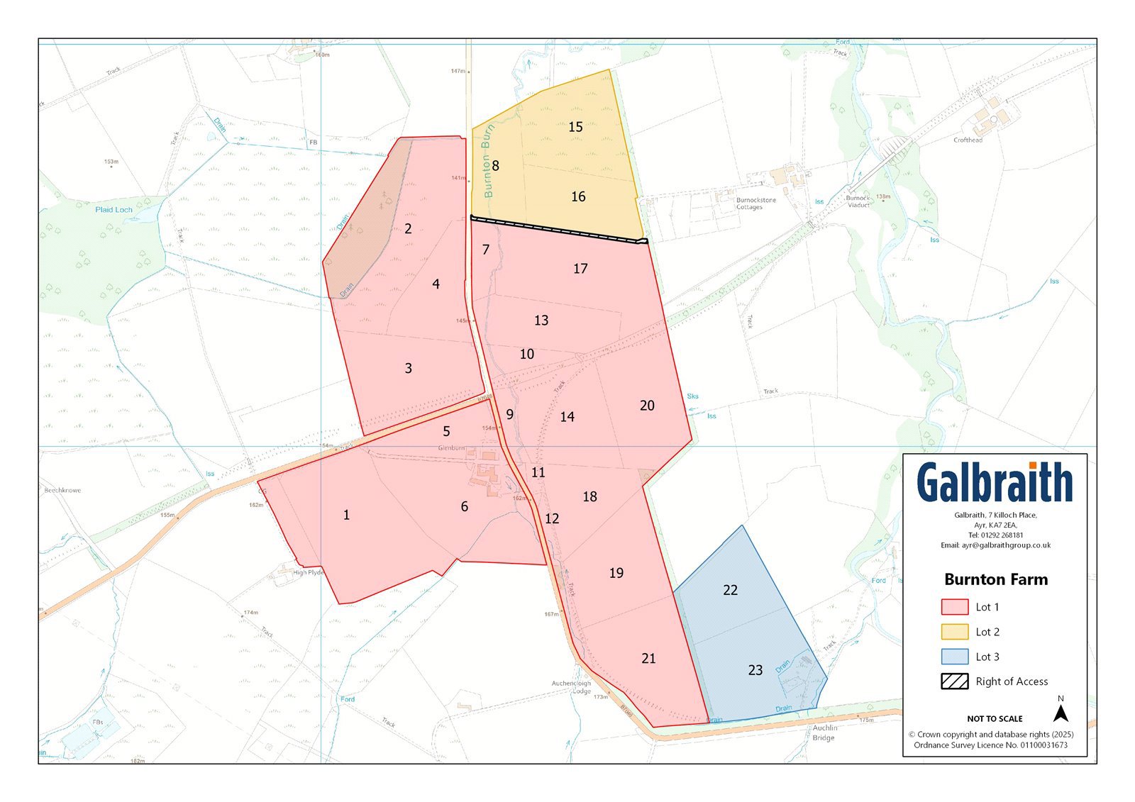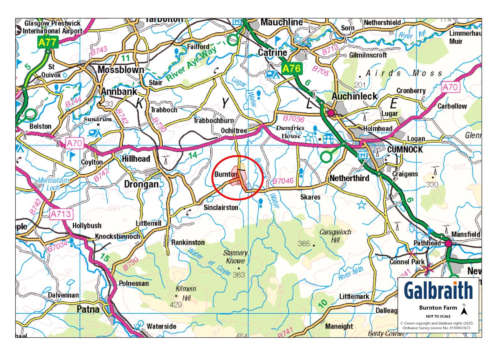 Burnton Farm is located within an accessible part of East Ayrshire, near to the settlement of Ochiltree, which has a primary school, local shop and community hub. The farm is situated in an area suited to both dairy, beef and other mixed farming enterprises and is well placed for access to Ayr (12 miles) and Glasgow (37 miles).Ayr has an excellent range of amenities and facilities including cinema, hospital, a wide range of shops and supermarkets and a well-regarded private school. Glasgow, to the north, is within easily commuting distance via the M77 motorway. There are railway stations at Auchinleck and Ayr with regular services to Glasgow and beyond. Glasgow Prestwick Airport is served by a good range of international flights. Ayrshire is renowned for its range of outdoor pursuits. There are several world-renowned golf courses including Royal Troon, Turnberry and Prestwick Golf Club. The racecourse at Ayr provides regular fixtures. At Boswell’s Coach House on Auchinleck Estate, there is a popular coffee shop and enjoyable riverside walks to Wallace’s Cave and Peden’s Cave with the River Ayr gorge walk at Mauchline close by. Dumfries House Estate (about 4 miles) is one of Britain’s most beautiful stately homes with an outstanding collection of 18th century furniture, beautiful walled gardens and coffee house. This rural area is well served by the agricultural supply industry and the farm is about 10 miles from Ayr Livestock Market.Burnton Farm is a compact dairy unit, currently milking 90 Friesians and supplying milk to Muller. The farm comprises a traditional four bedroom farmhouse, a three bedroom bungalow, an adaptable steading featuring a range of both modern and traditional buildings and circa 110.21 Ha (272.33 Ac) of Grade 4 grazing and silage land. The land is rented out on an informal basis during the winter months for sheep grazing whilst there is a small section of amenity woodland within the land ownership.METHOD OF SALEThe sale of Burnton Farm offers purchasers an opportunity to acquire the farm either as a whole or in three lots:Lot 1: Burnton Farmhouse, Glenburn Bungalow, farm buildings and land extending to 85.91 Ha (212.28 Ac)Lot 2: Land at Burnton Farm extending to 13.04 Ha (32.22 Ac)Lot 3: Land at Burnton Farm extending to 11.26 Ha (27.82 Ac)Please note that Lots 2 and 3 will not be sold prior to Lot 1.LOT 1 - Burnton Farmhouse, Glenburn Bungalow, farm buildings and land extending to 85.91 Ha (212.28 Ac)Burnton FarmhouseBurnton Farmhouse is of stone and slate construction and offers spacious accommodation over one and half storeys. The farmhouse comprises: kitchen, walk-in pantry, freezer room, games room, family bathroom, master bedroom with en-suite shower room, two further bedrooms and a box room, living room, dining room and lounge. The farmhouse also benefits from a further room that is accessed via a back stair from the kitchen. The services include mains water, mains electric, septic tank drainage and oil-fired central heating with the added benefit of coal fires and a wood burner. It adjoins the traditional courtyard, benefitting from ample parking and lawned gardens.Glenburn BungalowGlenburn Bungalow was built in 1989 and is of brick and tile construction with a later extension. It benefits from views over the surrounding countryside and offers the following accommodation: three bedrooms, living room, office, spacious kitchen and family bathroom. Glenburn bungalow benefits from lawned garden areas to both the rear and to the front, with a large entrance driveway. The services include mains water, mains electric, septic tank drainage and electric heating with the added benefit of coal fires.Farm BuildingsAdjoining the farmhouse, there is a range of traditional stone and slate outbuildings being used for a mix of calf housing and storage. In addition, the farmyard comprises the following buildings:Cubicle House (36.58m x 13.72m)Steel portal frame construction, concrete panels / breeze block walls, vent air cladding, slatted floor with central feed passage under a fibre cement roof. Housing 90 cubicles and 120,000 gallons of suspended slurry storage.Parlour Lean To (36.58 x 6.70m)Same construction as above with part concrete floor, housing a 7 aside Delaval parlour (constructed in 1997), tank room with 3000L bulk tank and electrical room. Bull pens/calving pens straw courts and collecting area.Cubicle House & Calf HouseStone and slate construction with part slated floor housing 23 cubicles. With adjoining stone and slate calf house with concrete floor, with baby calves in individual pens.Youngstock Cubicle Shed (13.72m x 8.23m)Steel portal frame construction, concrete panels, tin cladding and slatted floor, under a fibre cement roof.Adjoining Calf Shed (25m x 9.14m)Steel portal frame construction, concrete panels, tin cladding and concrete floor under a fibre cement roof. Open fronted with feed barrier.Tin Hay Shed 1 (22.86m x 6m)Steel portal frame construction, tin cladding, earth floor under a tin roof.Tin Hay Shed 2 (18.5 m x 6m)Steel portal frame construction, tin cladding, earth floor under a tin roof.High Level Slats (18.5 m x 5.3m)Brick construction under a fibre cement roof with rubber slats and feed passage.Silage Pit (30.48m x 13.41m)Earth bank walls, tarmac floor and effluent tank facility.Slurry PermastoreConstructed in 2018 with 485,000 gallon capacity.There is also a midden area with concrete panel walls within the yard as well as a grain tower and large stack yard for bale and machinery storage.The LandThe land at Lot 1 extends to approximately 85.91 Ha (212.28 Ac) in total including miscellaneous areas. Much of the farmland has been classified as predominately Grade 4(1) and 4(2) with a small proportion of Grade 5(3) by the James Hutton Institute and is contained within three blocks which are bisected by the public highway. A proportion of the farmland is ploughable but is currently down to grass and used for grazing and fodder production