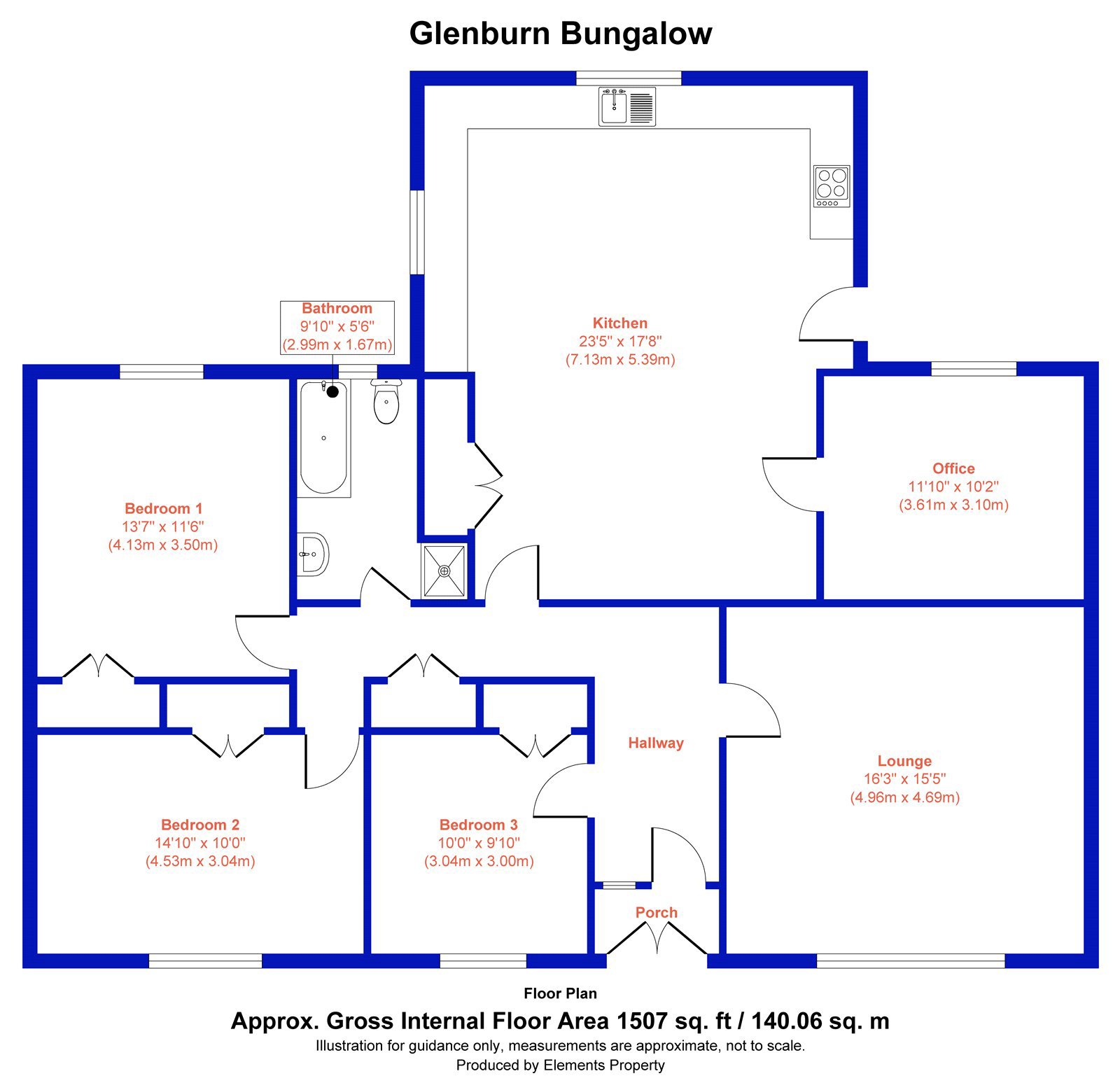 - Bungalow (three bedrooms, one public room).