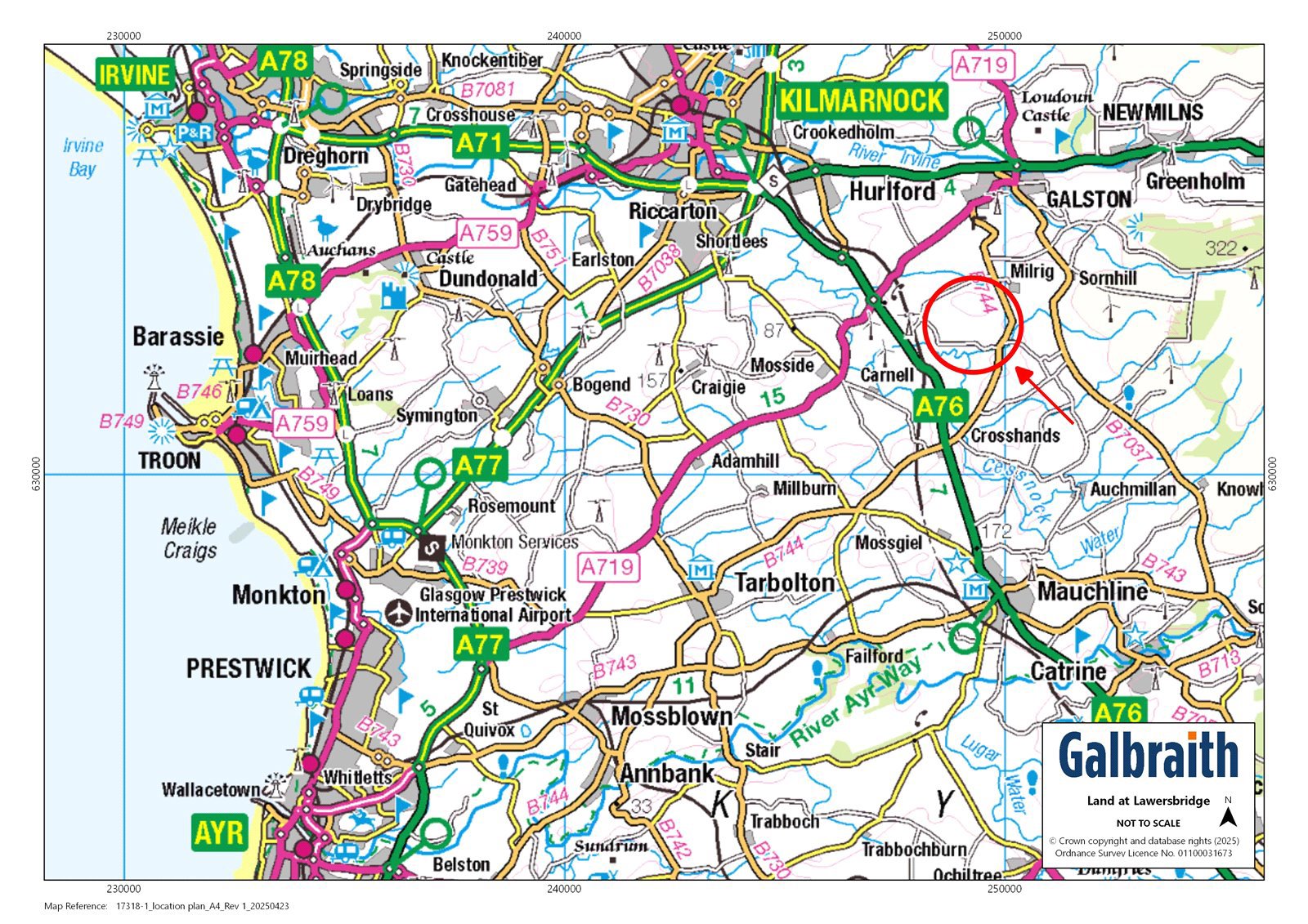 - Galston 3 miles Ayr 17 miles Glasgow 25 miles.