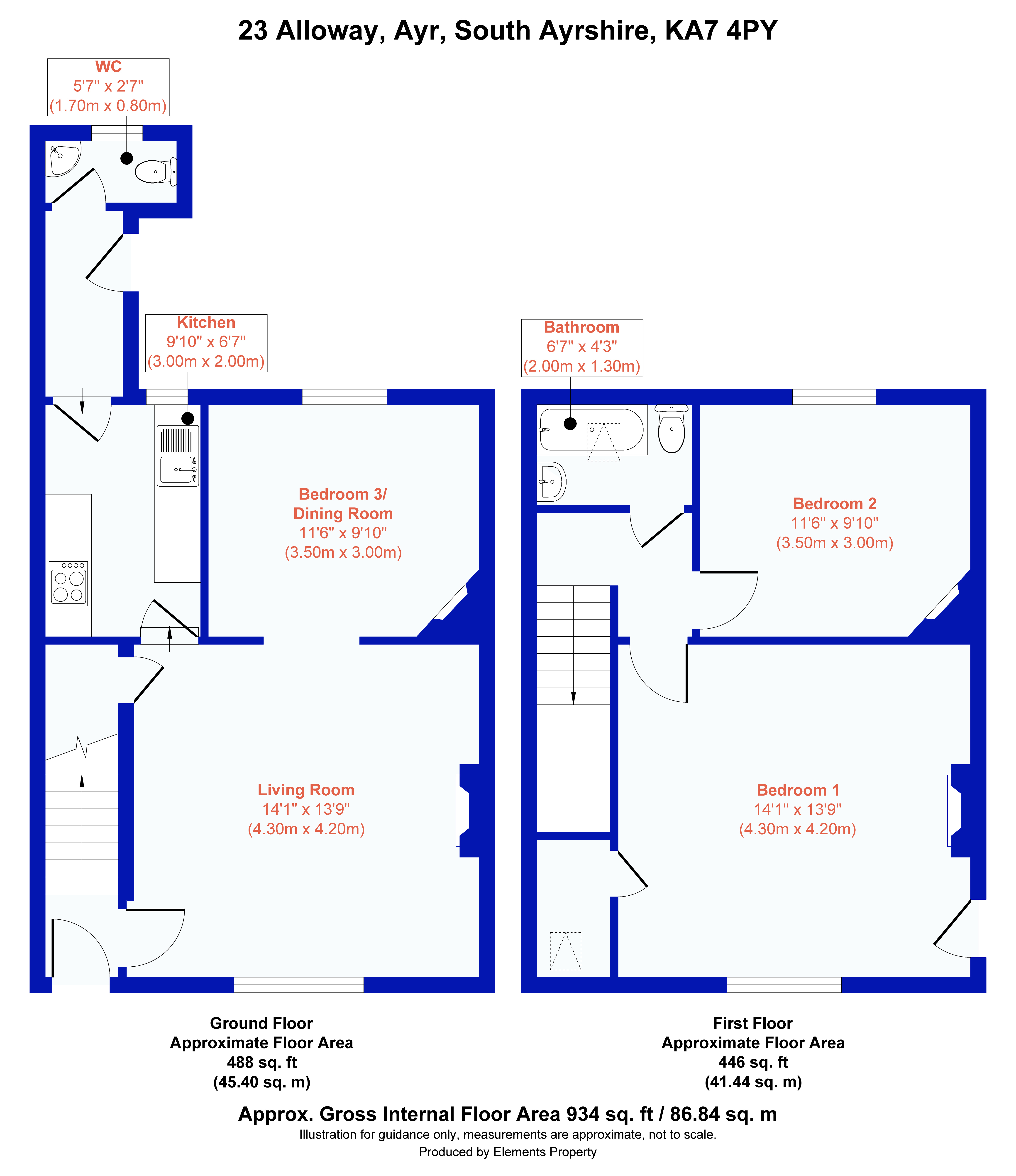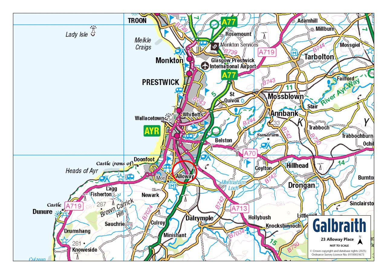 23 Alloway is a delightful, terraced house situated opposite Burns Cottage and Museum in the picturesque historic village of Alloway in South Ayrshire. There is a post office with general store, pharmacy, coffee shop, gift shop and the village hall are in the close vicinity. Alloway Primary school located within walking distance as are the church, Burns Experience, the cricket and rugby club, Rozelle Park and Brig O Doon Hotel. Ayr has a variety of high street shops, bars and restaurants as well as many professional services and recreational facilities. The popular racecourse in Ayr hosts the Scottish Grand National and there are yachting marinas at Troon, Ardrossan and Largs. A number of Scotland’s most famous Links golf courses including Royal Troon, Turnberry and Prestwick are close at hand. In addition to pleasant beach walks along the promenade and the nearby parks, there are some delightful river walks along the River Ayr including a deep wooded gorge ascending to a viewpoint known as Wallace’s Seat. Glasgow is easily accessible via the A/M77 and there is a regular train and bus service. Prestwick and Glasgow airports are 6.5 and 42 miles respectively.23 Alloway is built over two storeys of solid brick with a white render finish under a red tiled roof. There is a small off street front garden leading to the entrance. The house comprises generously proportioned rooms, the living room has an open fire set in wooden fireplace, two arched alcoves with storage below, large under stairs storage cupboard and triple windows overlooking the front. The kitchen is off the living room and is fitted with wall and base units, electric cooker and space for fridge/freezer/washing machine etc. From the kitchen there is access to the rear of the property and a cloakroom/w.c. Also off the living room is a third bedroom or dining room which has an open fire and window overlooking the garden. Stairs from the hall rise to two double bedrooms both with feature fireplaces, one with walk-in cupboard and small shelved cupboard which share the family bathroom. ACCOMMODATION Ground Floor: Living Room, Bedroom 3/Dining Room, Kitchen, w.c.First Floor: 2 Bedrooms, Bathroom.GARDEN The rear garden is mainly down to grass with some established shrubs and a patio area.Outhouse 1 (About 1.91m x 1.65m) Brick built with tiled roof. Ideal for garden storage.Outhouse 2 (About 1.84 x 0.93m)Brick built with tiled roof. Ideal for garden storage.