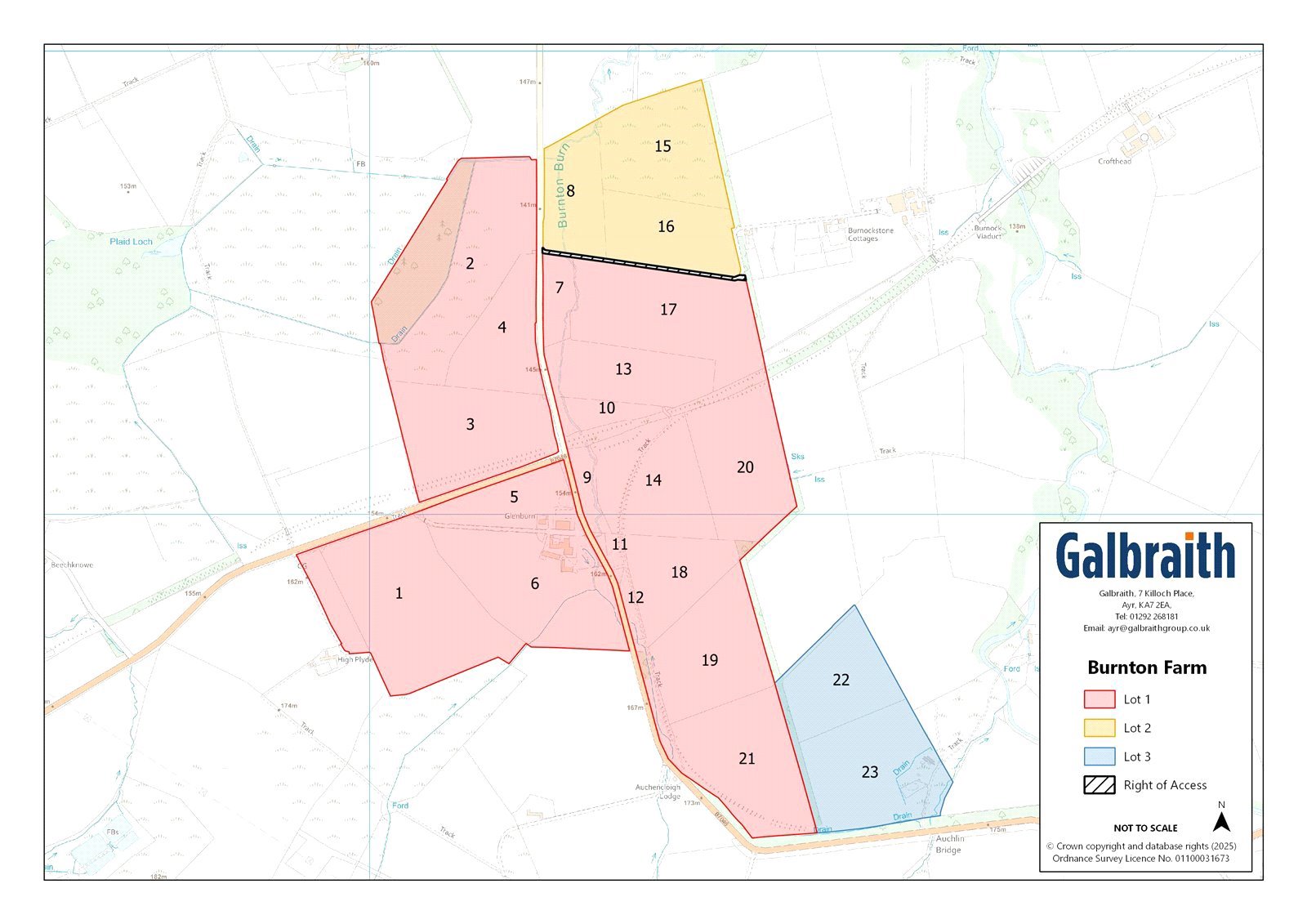 Burnton Farm is located within an accessible part of East Ayrshire, near to the settlement of Ochiltree, which has a primary school, local shop and community hub. The farm is situated in an area suited to both dairy, beef and other mixed farming enterprises and is well placed for access to Ayr (12 miles) and Glasgow (37 miles).Ayr has an excellent range of amenities and facilities including cinema, hospital, a wide range of shops and supermarkets and a well-regarded private school. Glasgow, to the north, is within easily commuting distance via the M77 motorway. There are railway stations at Auchinleck and Ayr with regular services to Glasgow and beyond. Glasgow Prestwick Airport is served by a good range of international flights. Ayrshire is renowned for its range of outdoor pursuits. There are several world-renowned golf courses including Royal Troon, Turnberry and Prestwick Golf Club. The racecourse at Ayr provides regular fixtures. At Boswell’s Coach House on Auchinleck Estate, there is a popular coffee shop and enjoyable riverside walks to Wallace’s Cave and Peden’s Cave with the River Ayr gorge walk at Mauchline close by. Dumfries House Estate (about 4 miles) is one of Britain’s most beautiful stately homes with an outstanding collection of 18th century furniture, beautiful walled gardens and coffee house. This rural area is well served by the agricultural supply industry and the farm is about 10 miles from Ayr Livestock Market.Burnton Farm is a compact dairy unit, currently milking 90 Friesians and supplying milk to Muller. The farm comprises a traditional four bedroom farmhouse, a three bedroom bungalow, an adaptable steading featuring a range of both modern and traditional buildings and circa 110.21 Ha (272.33 Ac) of Grade 4 grazing and silage land. The land is rented out on an informal basis during the winter months for sheep grazing whilst there is a small section of amenity woodland within the land ownership.METHOD OF SALEThe sale of Burnton Farm offers purchasers an opportunity to acquire the farm either as a whole or in three lots:Lot 1: Burnton Farmhouse, Glenburn Bungalow, farm buildings and land extending to 85.91 Ha (212.28 Ac)Lot 2: Land at Burnton Farm extending to 13.04 Ha (32.22 Ac)Lot 3: Land at Burnton Farm extending to 11.26 Ha (27.82 Ac)Please note that Lots 2 and 3 will not be sold prior to Lot 1.LOT 1 - Burnton Farmhouse, Glenburn Bungalow, farm buildings and land extending to 85.91 Ha (212.28 Ac)Burnton FarmhouseBurnton Farmhouse is of stone and slate construction and offers spacious accommodation over one and half storeys. The farmhouse comprises: kitchen, walk-in pantry, freezer room, games room, family bathroom, master bedroom with en-suite shower room, two further bedrooms and a box room, living room, dining room and lounge. The farmhouse also benefits from a further room that is accessed via a back stair from the kitchen. The services include mains water, mains electric, septic tank drainage and oil-fired central heating with the added benefit of coal fires and a wood burner. It adjoins the traditional courtyard, benefitting from ample parking and lawned gardens.Glenburn BungalowGlenburn Bungalow was built in 1989 and is of brick and tile construction with a later extension. It benefits from views over the surrounding countryside and offers the following accommodation: three bedrooms, living room, office, spacious kitchen and family bathroom. Glenburn bungalow benefits from lawned garden areas to both the rear and to the front, with a large entrance driveway. The services include mains water, mains electric, septic tank drainage and electric heating with the added benefit of coal fires.Farm BuildingsAdjoining the farmhouse, there is a range of traditional stone and slate outbuildings being used for a mix of calf housing and storage. In addition, the farmyard comprises the following buildings:Cubicle House (36.58m x 13.72m)Steel portal frame construction, concrete panels / breeze block walls, vent air cladding, slatted floor with central feed passage under a fibre cement roof. Housing 90 cubicles and 120,000 gallons of suspended slurry storage.Parlour Lean To (36.58 x 6.70m)Same construction as above with part concrete floor, housing a 7 aside Delaval parlour (constructed in 1997), tank room with 3000L bulk tank and electrical room. Bull pens/calving pens straw courts and collecting area.Cubicle House & Calf HouseStone and slate construction with part slated floor housing 23 cubicles. With adjoining stone and slate calf house with concrete floor, with baby calves in individual pens.Youngstock Cubicle Shed (13.72m x 8.23m)Steel portal frame construction, concrete panels, tin cladding and slatted floor, under a fibre cement roof.Adjoining Calf Shed (25m x 9.14m)Steel portal frame construction, concrete panels, tin cladding and concrete floor under a fibre cement roof. Open fronted with feed barrier.Tin Hay Shed 1 (22.86m x 6m)Steel portal frame construction, tin cladding, earth floor under a tin roof.Tin Hay Shed 2 (18.5 m x 6m)Steel portal frame construction, tin cladding, earth floor under a tin roof.High Level Slats (18.5 m x 5.3m)Brick construction under a fibre cement roof with rubber slats and feed passage.Silage Pit (30.48m x 13.41m)Earth bank walls, tarmac floor and effluent tank facility.Slurry PermastoreConstructed in 2018 with 485,000 gallon capacity.There is also a midden area with concrete panel walls within the yard as well as a grain tower and large stack yard for bale and machinery storage.The LandThe land at Lot 1 extends to approximately 85.91 Ha (212.28 Ac) in total including miscellaneous areas. Much of the farmland has been classified as predominately Grade 4(1) and 4(2) with a small proportion of Grade 5(3) by the James Hutton Institute and is contained within three blocks which are bisected by the public highway. A proportion of the farmland is ploughable but is currently down to grass and used for grazing and fodder production
