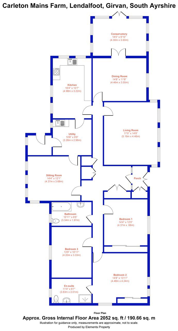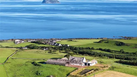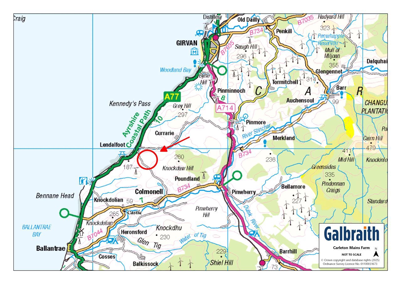 Carleton Mains Farm is a fine detached bungalow with grazing land and buildings overlooking the Mull of Kintyre with stunning sea views across Ailsa Craig, Kyles of Bute, and Ireland.The coastal town of Girvan lies about 6 miles to the north east, lying south of Ayr between the Galloway Hills and the sea and was originally a popular fishing port. The harbour, built within the mouth of the Water of Girvan, offers one of the few safe havens along the coastline, and remains active to this day. The town has a good range of local shops, supermarkets, recreational and professional services and has a local primary and secondary school. There is also a medical centre.The main county town of Ayr (about 28 miles) offers a wider variety of shopping, restaurants and sports activities. Private schooling is available at Wellington School and offers exceptional all-round education from nursery to senior school.The Ayrshire coast is famous worldwide for golfing with championship courses at Turnberry (12 miles) , Prestwick and Troon. There is also excellent sailing along the Firth of Clyde and the River Stinchar River offers salmon and sea trout fishing.Carleton Mains Farm provides a rare opportunity for a purchaser seeking an idyllic private rural location in an elevated setting with superb views across the Mull of Kintyre and beyond.The bungalow was built around 26 years ago on a single storey, with a tiled roof and render finish offering well-presented and spacious accommodation. Entering from the porch, this leads to the kitchen with fitted floor and wall units, single sink, integrated double oven and separate LPG 5 ring hob, with space for fridge freezer and dishwasher. There is a cosy sitting room with electric fire surround on a marble hearth, generous living room with bay window and spectacular views over the rolling Ayrshire farmland towards Ailsa Craig, dining room and conservatory with French doors to gravelled seating area, three bedrooms (master bedroom with en suite shower room) and family bathroom. There is a useful utility room with plumbing for washing machine and tumble dryer. The room layout and dimensions are laid out in more detail in the floor plans.Situated in a private and secluded setting, the drive leads to a large south facing courtyard. Carleton Mains Farm is complemented by useful outbuildings and there is a well maintained lawned garden with a shelterbelt of trees.OUTBUILDINGSThere are useful farm buildings forming a fine south facing courtyard:Barn: 7m x 18mStone construction under fibre cement roof, sliding door.Garage: 5.58m x 4.86mStone under fibre cement roof, power, electric up and over door.Store: 5.15m x 3.58m and 3.79m x 5.12mStone under fibre cement roof.Byre: 6.635m x 28.08m and 6.67m x 9.49mStone and brick with bays, fibre cement roof, water supply.Lean To: 3.31m x 16.41mWooden frame construction with tin cladding under fibre cement roof, earth and cobbled stone surface.General Purpose Shed: 10.58m x 26.43mSteel portal frame construction, breeze block walls, Yorkshire boarding, concrete floor under a fibre cement roof with power.The detached stone barn has the potential to convert into further living accommodation subject to the necessary planning consents.LANDThere are two grazing paddocks extending to about 4.65 Ac in total. The paddock lying west, has access to a burn. The land is principally classified Grade 3(2) and 4(2) by the James Hutton Institute.ACCESSThere is a right of access in favour of a neighbouring farmer over the drive between points A to B on the plan.DIRECTIONSFrom Ayr travel south on the A77 towards Girvan and continue through the town. At Shallochpark roundabout turn right towards Stranraer and continue for about 5.5 miles to Lendalfoot. At Lendalfoot, take the second road on the left hand side (signed Whithorn Way) and continue up the hill for about third of a mile and turn left onto the track for Castle Mains Farm (opposite the white cottage). Proceed up the drive to the farm. KA26 0JLWHAT3WORDSTo find this property location to within 3 metres, download and use What3Words and enter the following 3 words: https://w3w.co/fleet.fines.extension