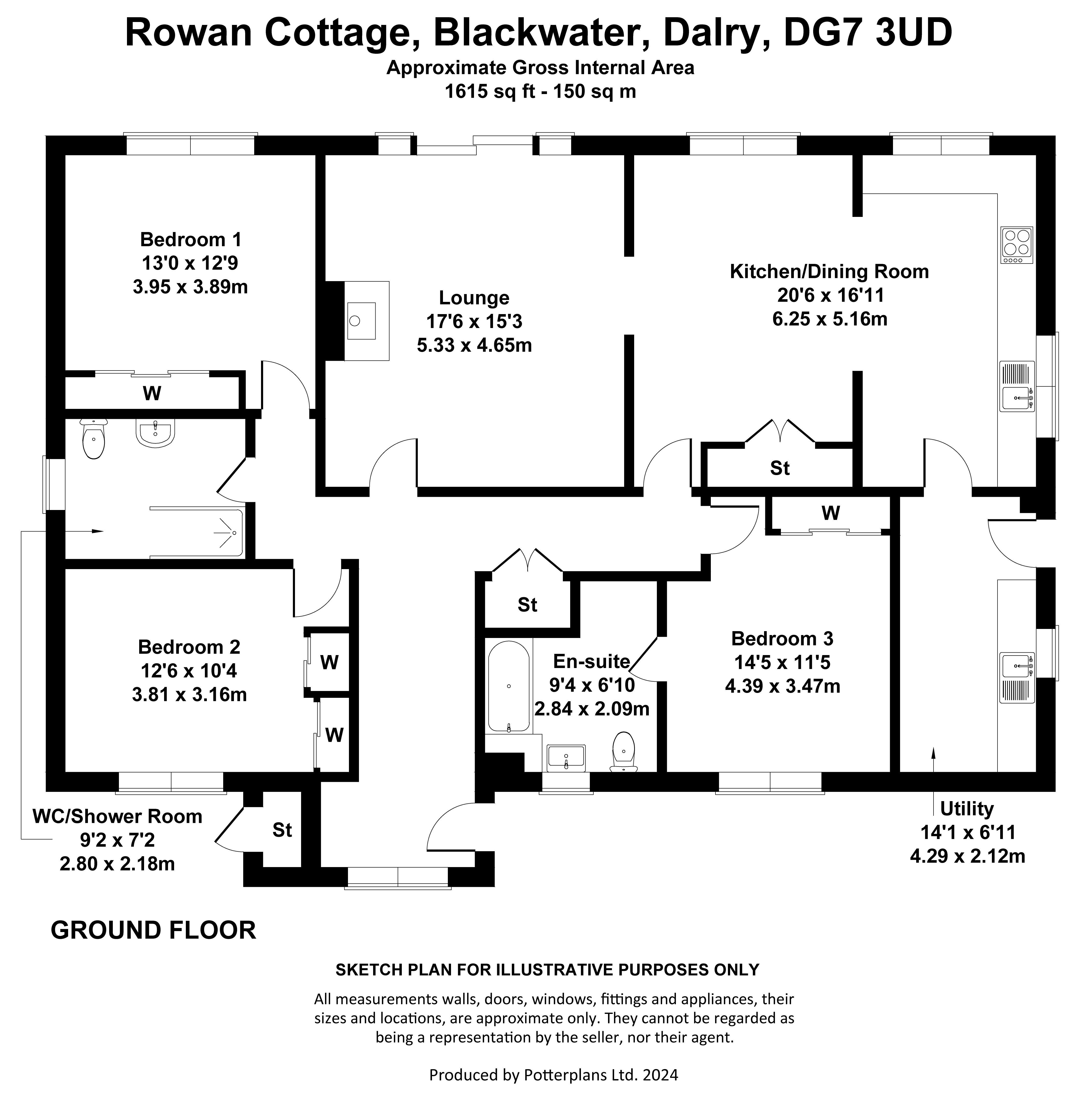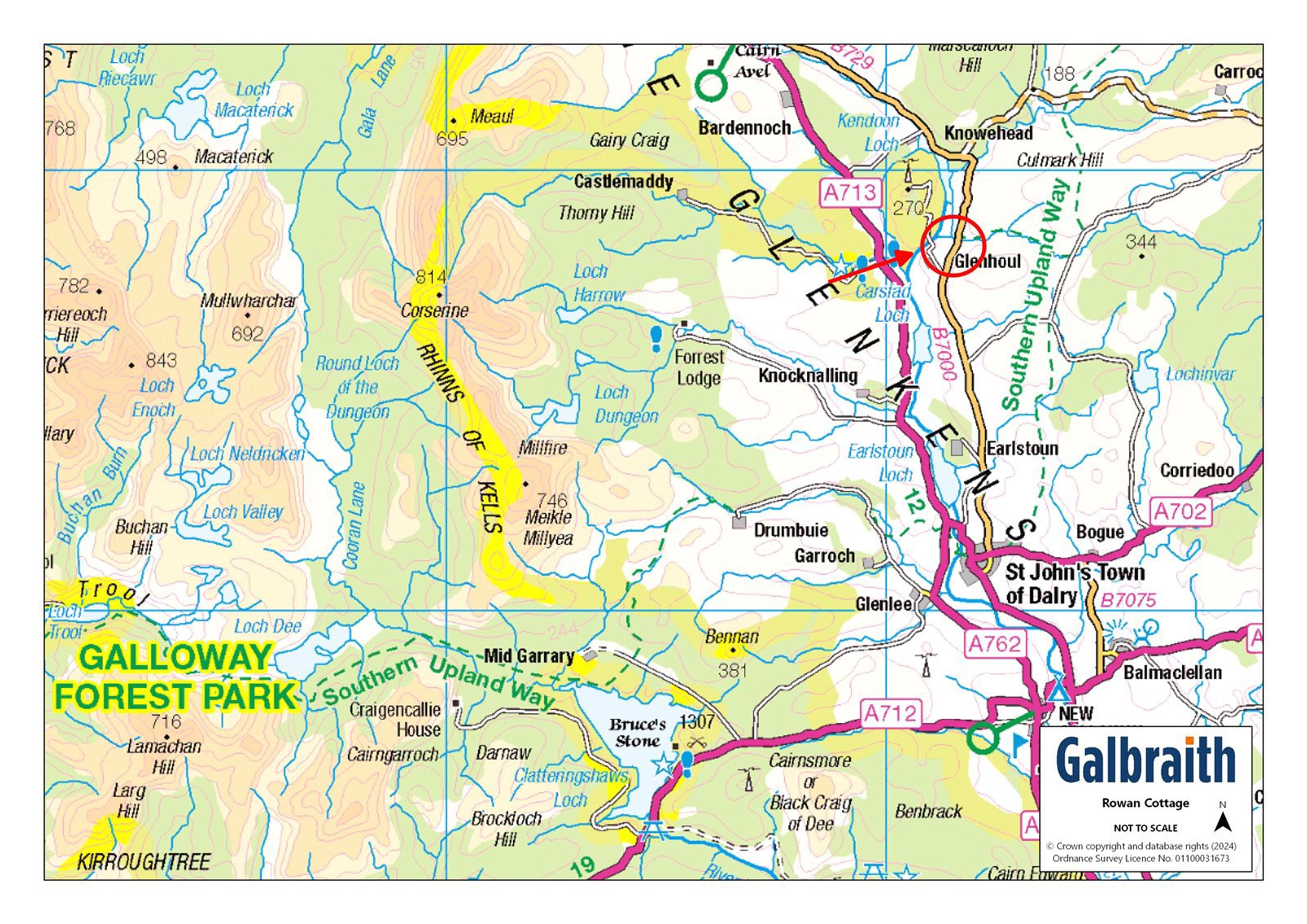 Rowan Cottage sits high just off the B7000, locally known as The “High Carsphairn” Road, looking down on the beautiful Glenkens valley (or glen as it is in Scotland) with panoramic views north and south. The property is about 5 miles north of St John’s Town of Dalry, which is a thriving village with a range of amenities including a Parish church, 24hr fuel garage with Londis supermarket, village shop/post office, 2 hotels including the very highly regarded Clachan Inn and both primary and secondary schools. New Galloway is located about 3 miles away at the northern end of Loch Ken and offers Kells primary school, The CatStrand Community and Arts Centre (which has a programme of events, workshops, and classes year round), Glenkens Medical Practice and village shop. A broader range of facilities can be found in Castle Douglas, which is known as Dumfries and Galloway’s Food Town and has two supermarkets with a third under construction at time of writing, and many local individual shops and businesses providing a varied selection of gifts, foods and services. There are both primary and secondary schools in the town along with supermarkets, health centres, cottage hospital, veterinary services and a thriving livestock market and golf course. Dumfries is the principal town in the area, and provides a wider range of schools, shops, retail outlets, and other services including the region’s main hospital, the Dumfries and Galloway Royal Infirmary. Also in Dumfries there is the Crichton Campus providing further higher education courses.The South West of Scotland is well known for its mild climate, attractive unspoilt countryside and the diversity of sporting and recreational pursuits, and is a popular tourist destination. There is good hill walking opportunities in the Southern Uplands as well as the nearby Galloway Hills, and cycling along some of the new designated cycle routes as well the Seven Stanes mountain bike routes, including Ae Forest and the Galloway Forest Park. The Galloway Forest Park which is known for its beauty and tranquillity, being the centre of the Galloway and Southern Ayrshire Biosphere and Britain’s First Dark Sky Park, which provides astronomers with phenomenal views of the stars. Loch Ken is renowned for its water pursuits, water skiing, sailing, fishing and many others, and The Galloway Activity Centre (just a short distance away) offers a variety of learning courses. DESCRIPTION Rowan Cottage is a lifestyle property capable of providing the perfect setting for a variety of uses. A spacious modern bungalow, built by the current owners, offers family accommodation including 3 double bedrooms, one with en suite bathroom, a large living room which is open to the bright and airy dining kitchen. A useful utility room off the kitchen is perfect for laundry and storing outdoor footwear. All the windows to the rear enjoy the wonderful views, with patio doors leading out from the living room. A large multi-fuel stove provides a cosy focus to the room, but also powers the central heating and hot water. A stylish family shower room completes the accommodation. There is generous storage throughout the property with large double storage cupboards both in the kitchen and generous hallway, as well has ample built in wardrobe space in the bedrooms.Outside there is a large garden mainly laid to lawn to the side and rear, which can be enjoyed from the patio. To the front is a large parking sweep, which leads in from the entrance drive. The driveway runs past the former youth hostel building, which is a useful store of approximately 180m2, with various rooms, plus a large ‘party room’ complete with bar and bench seating. A deck leads out from the party room from where the wonderful views can be enjoyed. The hostel is a fantastic space for extra storage and for teens to be entertained on wet days or summer evenings. It comes with plumbing and power.The land fans out behind the house and hostel and can be seen from the house and garden, giving peace of mind if you had grazing horses or other livestock. There is plenty of scope for building stables and field shelters.All things considered, Rowan Cottage offers a rare opportunity of a turn-key condition house coupled with land for which the possibilities are endless (along with the views!).ACCOMMODATION Ground Floor: Entrance Hall. Living Room. Kitchen with large Dining Area. Utility Room. Master Bedroom with Ensuite Bathroom. Two further Double Bedrooms. Family Shower Room.GARDEN AND GROUNDSFrom the B7000 a wide entrance opens to the driveway, which leads past the former youth hostel building and on round to the front of the house ending in a large parking and turning sweep. A second entrance has a set of timber gates leading from the front garden to the road. To one side is a log store which would be an ideal location for a garage. To the side and rear, the garden is mainly to lawn and edged with trees, all of which have been planted by the current owners. A double set of steps lead down from the living room patio doors to the patio at the rear, perfect for enjoying the garden and views on warm summer days, and for entertaining family and friends. The land, which fans out behind the house, is divided into various paddocks which can be grazed by a variety of livestock. There is a small area of woodland and two ponds. Beyond, is open farmland and countryside.
