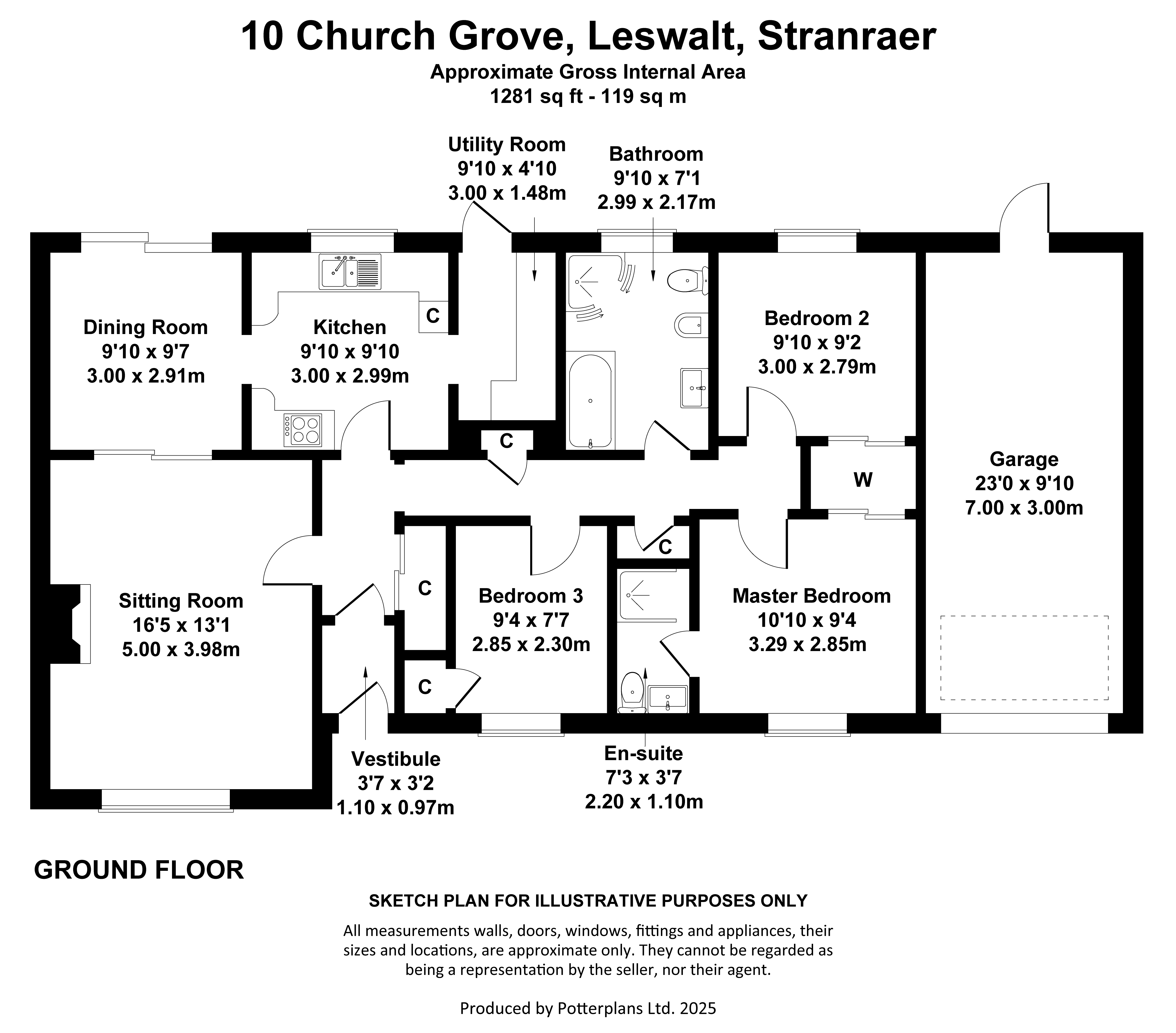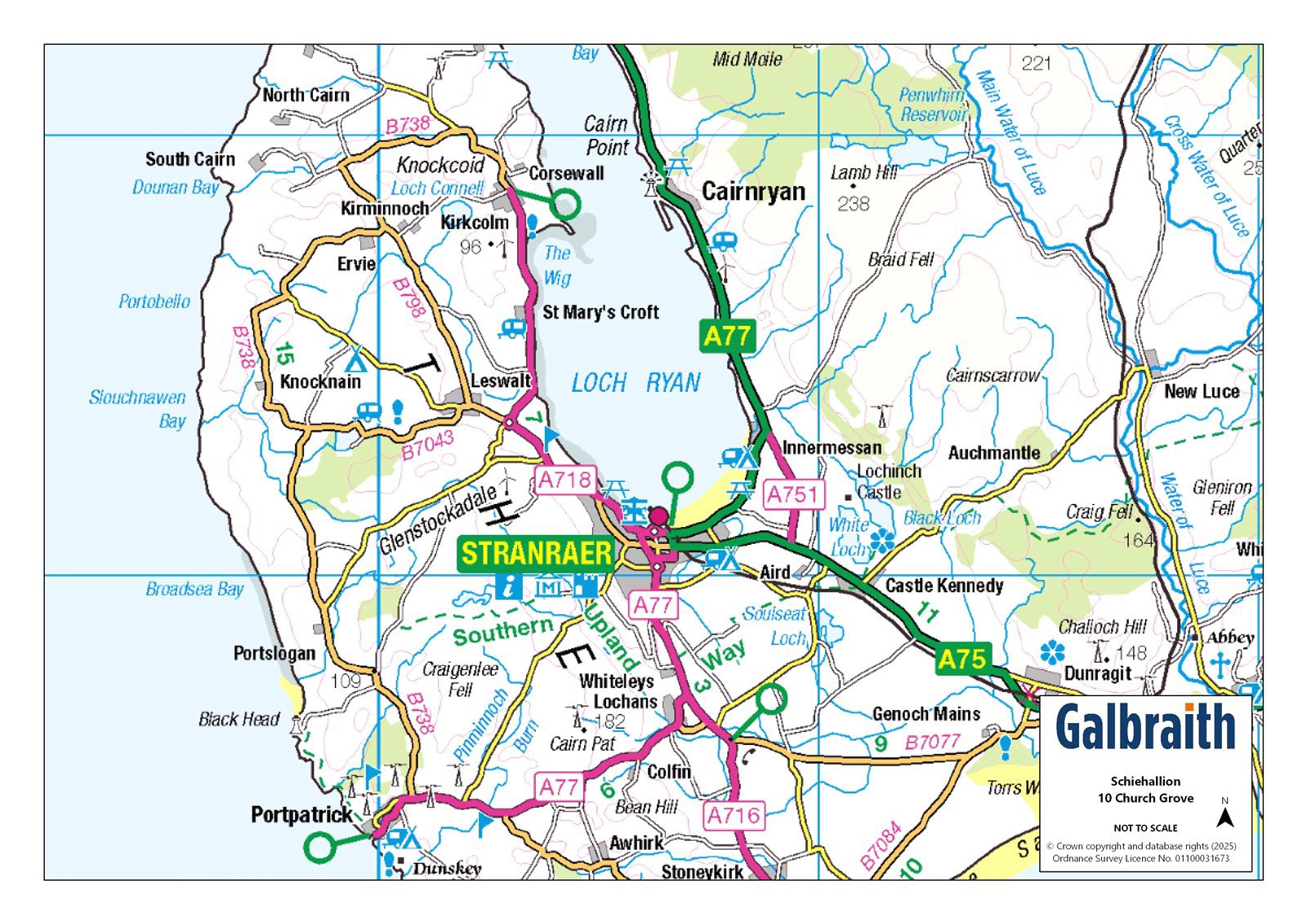 SITUATION Schiehallion is situated in Leswalt, a quiet rural village which lies between Stranraer and Portpatrick. Leswalt has a number of local amenities, all within walking distance of Church Grove, including a primary school, shop, Leswalt Parish Church and community run Aldouran Wetland Garden, a hidden gem, where you will find an abundance of wildlife and quiet walks just on the edge of the village. Stranraer, the nearest town, has a secondary school, primary schools, hospital (Galloway Community Hospital), supermarkets, shops, offices, hotels, restaurants, and a train station. The port of Cairnryan, just over 6 miles from Stranraer has two ferry operators running passenger and freight services to Northern Ireland. Trains to Ayr and Glasgow are available at Stranraer, Trains also run from the regional centre of Dumfries, 75 miles to the east. Domestic and international flights are available at Prestwick Airport, 57 miles north, and Glasgow and Edinburgh Airports, 90 and 135 miles respectively. Motorway links and trains are available at Lockerbie, 88 miles east, and Kilmarnock, 69 miles north.DESCRIPTION Schiehallion is situated in an elevated position within Church Grove, a driveway leads up to the property occupying an elevated position affording far reaching views over the village and towards Loch Ryan. The front door opens into an entrance vestibule and central hall, from which all accommodation can be accessed. The double aspect open plan sitting room and dining room is a well-appointed and well-lit room with a picture window framing views to the front and French doors opening to the patio from the dining area. The dining area is open plan to the kitchen, with a range of fitted wall and floor units, an integrated dishwasher and granite worktop. Cooking facilities are provided by a Neff gas hob and integrated electric oven and grill. An archway opens through to the utility room, with space and plumbing for white goods and access to the patio.The master bedroom and bedroom 2 have double fitted wardrobes and in addition the master bedroom has an en-suite shower room with a wet room style shower. Bedroom 3 has a fitted cupboard and could be utilised as a hobby room or home office. The spacious family bathroom has both a bath and corner shower.Additional storage space is provided in a useful cloakroom cupboard in the hall as you enter via the front door, and there are 2 further fitted cupboards in the hallway. Heating is generated by an air source heat pump and new radiators have been installed throughout. In addition there are 12 roof mounted solar panels contributing to lower electricity costs with the excess energy generated sold back to the grid via Scottish Power. The gas tank in the front garden is no longer required for the heating system, it does however still supply the gas hob in the kitchen. Once empty the tank could be removed and replaced by LPG gas.There is parking in the drive for more than one vehicle, an electric car charging point and external sockets for garden equipment. A number of dwelling houses are currently being constructed in the field to the left of 10 Church Grove, between Church Grove and Challoch Farm. For further information please refer to Dumfries and Galloway Planning Department website using reference PPA-170-2180. Garage (7m x 3m) With remote control roller door and power. ACCOMMODATION Ground Floor: Entrance Vestibule, Sitting Room, Dining Room, Kitchen, Utility Room, Bathroom, Master Bedroom with en-suite Shower Room, Bedroom 2, Bedroom 3.GARDEN The front garden is mainly laid to lawn and the elevated position of the property creates a steep incline in both the front and back garden. A planted border edges the driveway and there is an area for parking and a patio in front of Schiehallion. Directly behind the property there is an area laid to paving and a grass banking planted with some mature shrubs, lawn and an area fenced off for composting. DIRECTIONS Take the A718 (Leswalt High Road) from Stranraer and follow the road for approximately 1.7 miles, continue straight on at the roundabout and follow the B798 for 0.7 miles in to the village of Leswalt. Pass Leswalt Church on your left then turn immediately left on to Glen Road and left again in to Church Grove. Continue straight on, Schiehallion, 10 Church Grove is the last property on the right-hand side with the red brick garden wall at street level. POST CODE DG9 0JZ WHAT3WORDSTo find this property location to within 3 metres, download and use What3Words and enter the following 3 words: recovery.supplied.arranger