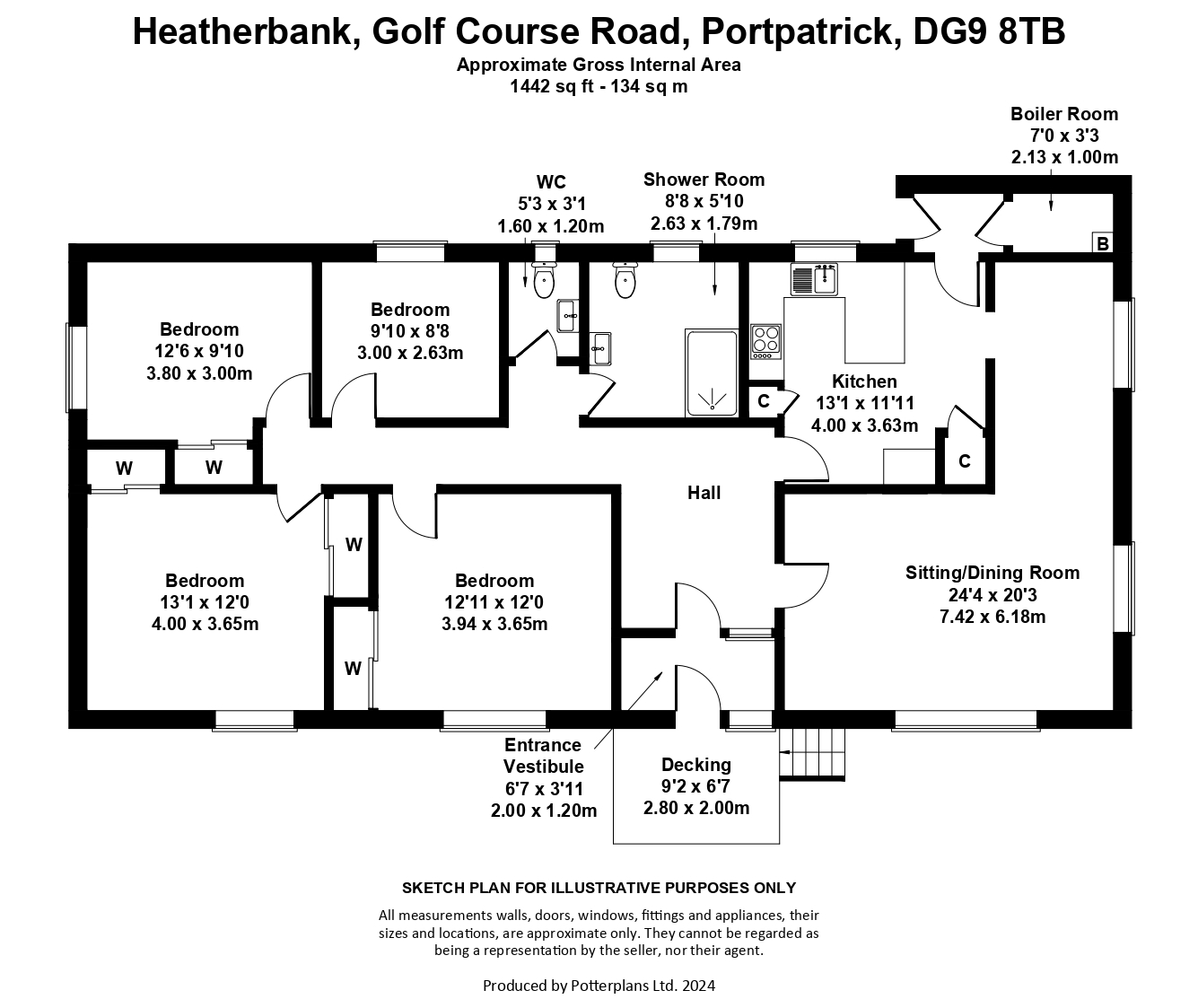 SITUATION Heatherbank is situated in an elevated position above the highly desirable seaside village of Portpatrick with views over the village and the North Channel beyond. Portpatrick, has a number of shops, a primary school, church, putting green, beachfront hotels & restaurants and in the summer you will find people dining al fresco as they admire the stunning sea view. Portpatrick RNLI Lifeboat is launched from the harbour and can be seen going out to sea for both rescues and training days. There are good walking opportunities, including walks to Sandeel Bay and Lairds Bay, and from Portpatrick you can take a short walk up to Dunskey Castle, a 16th century ruin, set around a small bay with cliffs forming the backdrop. For the more adventurous hill walkers you can walk the Southern Upland Way, with Portpatrick providing the start or end point in the West. Stranraer is the nearest major town, less than 8 miles from Heatherbank, where there is a secondary school, primary schools, hospital (Galloway Community Hospital), supermarkets, shops, offices, hotels, restaurants, and a train station. The port of Cairnryan, just over 6 miles from Stranraer, has two ferry operators running passenger and freight services to Northern Ireland. There are a number of golf courses in the area including Dunskey Golf Club, within walking distance at the top of Golf Course Road, Stranraer Golf Club, Wigtownshire County Golf Club and the famous Turnberry Golf Course is approximately 43 miles from Portpatrick. Both curling and horse riding are also very popular in the area, Stranraer & District Riding Club offers training and holds regular events, and curling is available at the North West Castle, Stranraer.DESCRIPTION Heatherbank is a charming bungalow with glorious sea views, especially from the raised decking, which provides the ideal place to sit and relax whilst enjoying the vista. The entrance vestibule opens to the main hall and the ‘L’ shaped sitting room/dining area. This double aspect room is flooded with natural light and a picture window, spanning 3.45m, frames the view and there is ample space for a sociable dining table and chairs. The kitchen adjacent has a breakfast bar, with space and plumbing below for white goods, and a range of fitted floor and wall cupboards. A new electric cooker and fridge/freezer have been installed. Additional space is provided in the ‘boiler room’ which houses an EHC electric boiler (renewed in 2022). The electrics were renewed in April 2024 and the new consumer unit is housed in a kitchen cupboard. The hall opens to all accommodation including four bedrooms, one of the rooms overlooking the garden has fitted cupboards and bookshelves and serves as a study/library. The two front facing bedrooms have fitted wardrobes and benefit from the views over the village to the North Channel beyond. Heatherbank has a spacious shower room, fitted with a double shower, and there is an additional WC cloakroom adjacent. Eleven solar panels have been installed on the roof and a small quarterly income is received from FiTS payments. The Feed in Tariff Scheme started in April 2011 and will continue until April 2036. The loft space at Heatherbank is partially floored and planning permission has been conditionally granted to raise the roof and form first floor accommodation. Please refer to Planning Reference: 23/1267/FUL on Dumfries and Galloway Council website. In addition there is storage space below the property, extending the full length of Heatherbank, with restricted head height. From the entrance on the side of the property the head height is approximately 1.6m and this reduces considerably based on the gradient of the land. Heatherbank is currently a blank canvas offering the potential to live in, whilst developing or extending further depending on the needs and requirements of the new owner. This property is situated in a highly desirable area of Portpatrick, ideal for a family or couple and offering the opportunity to work from home, living within walking distance from the sea front, local shops and restaurants. ACCOMMODATION Ground Floor: Entrance Vestibule. Sitting Room/Dining Room. Kitchen. Boiler Room. Shower Room. WC Cloakroom. 4 Bedrooms. FIXTURES AND FITTINGSAll carpets, curtains, blinds and white goods are included in the sale, no other items are included unless specifically mentioned in these particulars.GARDEN AND GROUNDSA gated entrance opens into Heatherbank, with a flower border extending in towards the property from Golf Course Road. There is ample parking for more than one vehicle and a small timber garden shed is situated on the grass. The garden is mainly laid to lawn, with a variety of mature shrubs and trees. A hedgerow provides the boundary to the front and sides, and a wall to the rear. A paved pathway continues around the property and steps lead up to the stunning elevated decking overlooking Portpatrick and the coastline beyond. DIRECTIONS As you enter Portpatrick turn right on to Heugh Road for 0.4 miles, then turn right on to Golf Course Road. The entrance into Heatherbank is the second entrance on the left. POST CODE : DG9 8TB WHAT3WORDSTo find this property location to within 3 metres, download and use What3Words and enter the following 3 words: sting.sprinkler.visitor