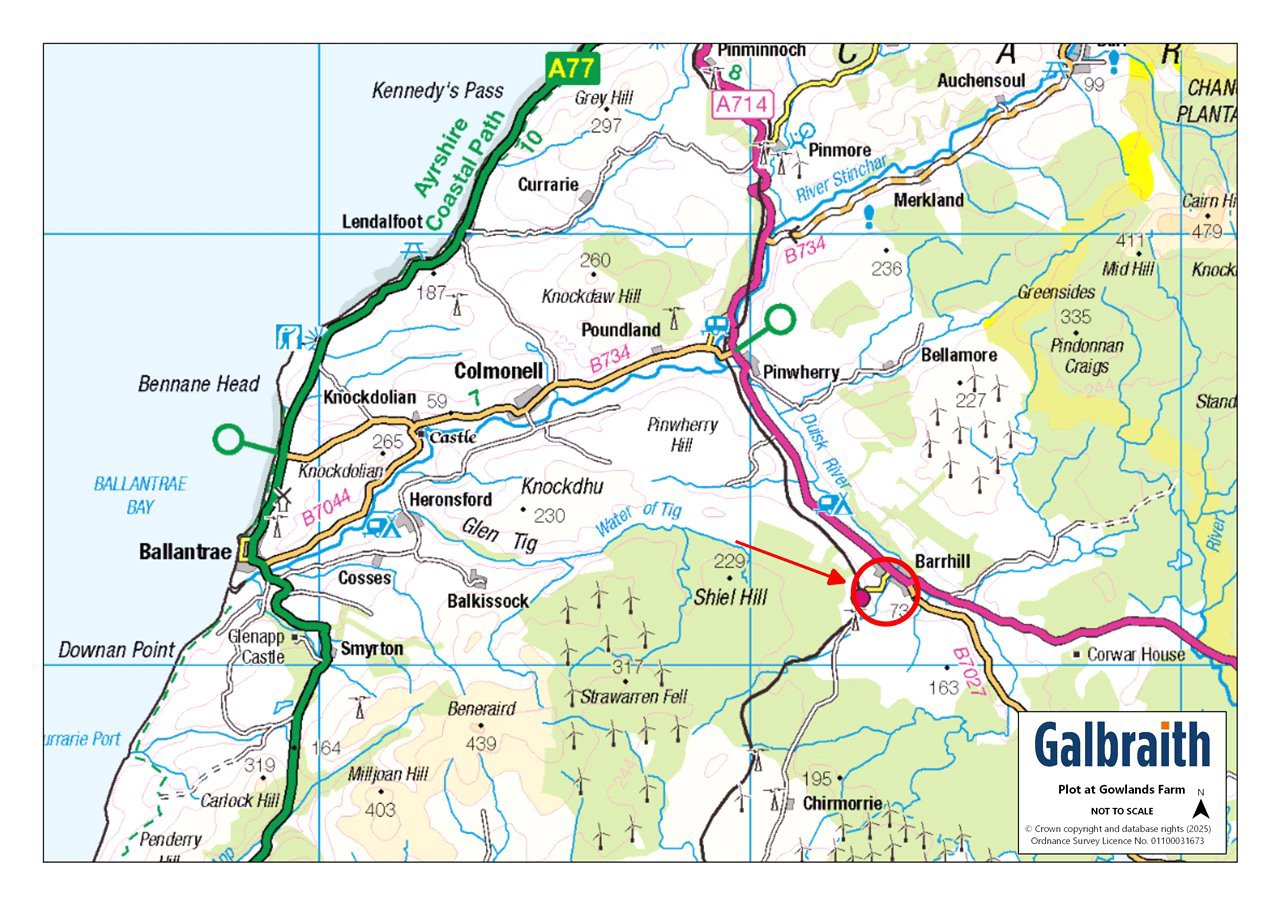 The building plot is located approximately one third of a mile south of the village of Barrhill, South Ayrshire. It is about 12 miles from the town of Girvan and 33 miles from the County Town of Ayr. Glasgow is located some 74 miles away via the M77 and Glasgow Prestwick Airport (38 miles) offers regular international flights and Glasgow Airport is (75 miles). The private airfield at Castle Kennedy is about 18 miles distant.Barrhill village has a local shop, primary school, together with early years centre, with secondary education available at both Girvan and Newton Stewart. Transport links in the area are good with a regular local bus/taxi service as well as a railway station in Barrhill with connections to Ayr, Glasgow and Stranraer. Girvan has a further range of shops, supermarkets, primary and secondary schooling and a community hospital. Newton Stewart also has a good range of shops, cafes and various services. To the north is Turnberry, with world class golfing facilities and a luxury hotel and spa. There is also an excellent 18 hole course at Girvan Golf Course. Ayr is the County Town on the Firth of Clyde with a wide range of amenities, theatre, cinema, excellent shopping, first class private and state schools together with a range of restaurants and sports facilities.The popular racecourse in Ayr is host to the Scottish Grand National and there are exceptional yachting facilities at the Marinas in Troon, Largs and Inverkip. Salmon and trout fishing are available in the area’s lochs and rivers close by. The River Stinchar is a famous salmon fishery and is renowned for its autumn run.The South Ayrshire hills are a popular destination for those seeking outdoor pursuits. There are a number of excellent designated walking routes in the area and some excellent cycle paths including the nearby Galloway Forest with the National Route 7 passing through it. The Merrick is southern Scotland’s highest mountain at 2,800ft and the long distance walking route, the Ayrshire Coastal Path runs from Glenapp (south of Ballantrae) to Skelmorlie in North Ayrshire. There are country walks in the area around Barrhill, including The Martyrs' Tomb Walk following the banks of Cross Water out the village.Planning Permission was granted on 25th April 2025 with the proposed design being arranged over one floor from the conversion of a brick agricultural shed. The building was originally the Barrhill Cattle Market. The local area has a long-standing connection to the cattle industry, particularly with the development of the Ayrshire breed of cattle.The proposed finishes include the existing brickwork structure to remain as is, with black cedral vertical cladding, black UPVC windows and doors together with black UPVC rain water goods. The plot extends to about 2.81 acres in all, with a generous drive and parking area, garden grounds and a 2.26 acre paddock to the south of the building plot.ACCOMMODATION AS PROPOSED3 Bedrooms (1 en suite), open plan Kitchen/Living/Dining Room, Bathroom, Utility Room, Porch, Plant Room.PLANNING CONSENTPlanning Reference 25/00179/PNF, decision granted 25th April 2025. A copy of the planning consent and plans are available on request from the Selling Agents.SERVICESElectricity and water are available close by.FLOOD RISKFlood maps of the area can be viewed at https://map.sepa.org.uk/floodmaps/FloodRisk/SearchThere is no risk of flooding at this site.DIRECTIONSFrom Ayr take the A77 south, signed for Stranraer. At the Shallochpark Roundabout, south of Girvan, take the second exit onto the A714 signed to Barrhill. Follow this road for about 11 miles, as you enter the village turn right onto Gowlands Terrace (signed for the railway station) and continue for about a third of a mile and the building plot is on your left hand side.POST CODE:KA26 0QFWHAT3WORDSTo find this property location to within 3 metres, download and use What3Words and enter the following 3 words: deflate.handover.hiresLOCAL AUTHORITYSouth Ayrshire Council, County Buildings, Wellington Square, Ayr, KA7 1DR. Tel: 0300 123 0900.NOTEProspective purchasers should note early discussions between Voltalia UK Ltd and South Ayrshire Council regarding a potential energy park 0.9km south of Barrhill. A similar plan was previously rejected, buyers are advised to consult the planning department directly. “If the energy park proceeds, it is not expected that the energy park or turbines will be visible from the building plot.”