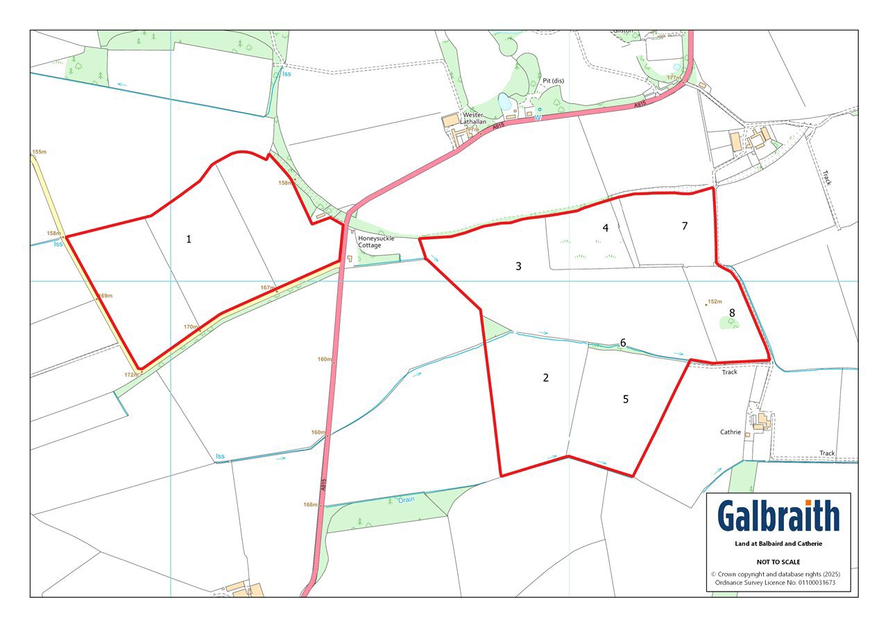 SITUATIONThe Land at Balbaird and Catherie is situated about 2 miles north east of Upper Largo, 6 miles north of Leven and 10 miles south of Cupar in the county of Fife. Cupar is a popular town with a wide range of facilities and amenities including primary and secondary schooling, supermarkets, retailers and a railway station.The city of Dundee, approximately 20 miles north, provides a comprehensive offering of city shops, services and amenities, as well as being home to Scott’s RSS Discovery and the V&A museum. It also offers two universities, swimming pool, railway station and airport, providing daily flights to London. The city of Perth is under an hour’s drive and provides a comprehensive range of services and facilities including national retailers, theatre, concert hall, swimming pool, museum as well as bus and train stations providing excellent transport networks.Fife is renowned for its productive and fertile lands capable of producing high yields of an extensive range of crops and the area is well suited to both arable cropping and livestock units. The local area is well served by a wide variety of agricultural contactors, merchants and suppliers with a successful local machinery ring which can provide additional farming resources if required. The livestock market at Stirling, about 63 miles west has regular sales.DESCRIPTIONThe Land at Balbaird and Catherie extends to 141.74 acres (57.36 hectares) in total and lies in two individual blocks on either side of the A915, the main road connecting Upper Largo and St Andrews. Principally arable, the land is classified as being Grade 3.2 by the James Hutton Institute meaning it is capable of growing a wide range of crops. It is well fenced and is both relatively flat or gently slopping rising from approximately 140m above sea level to 170m above sea level. The land at Balbaird, to the west, can be accessed directly from the public road whereas the Land at Catherie, to the east, is accessed by a private farm road over which there is a servitude right of access. The fields are of good practical size suitable for modern machinery.METHOD OF SALEThe Land at Balbaird and Catherie is offered for sale as a whole