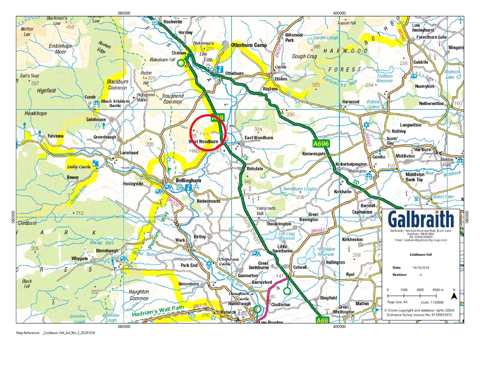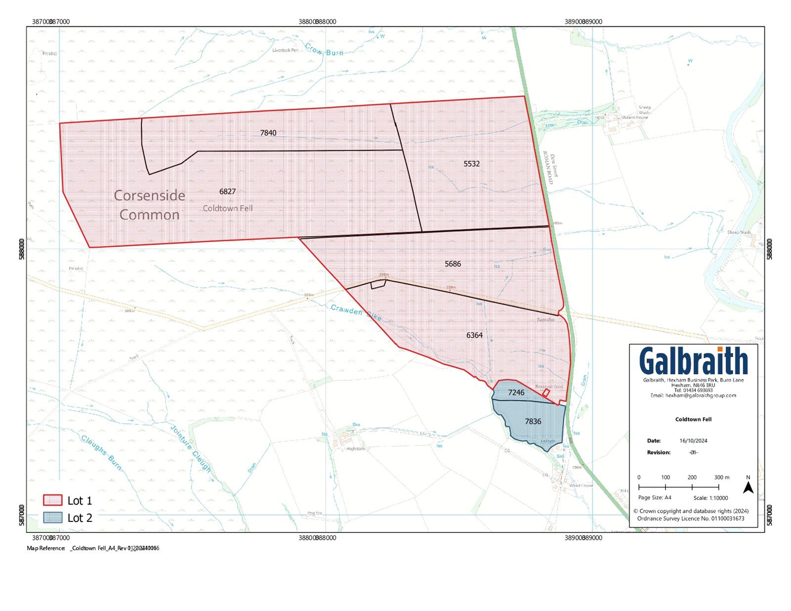 Lot 1: A Block of Permanent Pasture and Rough Grazing, Extending in Total to Approximately 125.39 Hectares (309.84 Acres). Lot 2: Two Parcels of Permanent Pasture Extending in Total to Approximately 5.07 Hectares (12.53 Acres). The Land may be suitable for a variety of uses including regenerative agriculture, rewilding projects, sporting and natural capital benefit, subject to obtaining relevant consents. LOCATIONThe Property is located adjacent to the A68, just north of West Woodburn in the county of Northumberland, approximately 20 miles north of the market town of Hexham and about 4.5 miles from the village of Otterburn and on the northern fringe of West Woodburn. The land is located within one block with part of the Property lying within Northumberland National Park. DESCRIPTIONThe sale of Coldtown Fell offers an exciting opportunity to purchase an attractive block of agricultural land which may be suitable for a for a variety of uses including regenerative agriculture, rewilding projects, sporting and natural capital benefit, subject to obtaining relevant consents. The Property is offered for sale in two separate lots or as a whole. Lot 1: The land extends in total to approximately 125.39 Hectares (309.84 acres) of Grade 5 permanent pasture and rough grazing. The soils comprise of slowly permeable, wet, very acidic upland soils with a peaty surface. The land is located in the Northumberland National Park, excluding field 6364 which lies outside of the National Park Boundary. There are some livestock handling pens located within field 6364. Lot 2: The land extends in total to approximately 5.07 hectares (12.53 acres) of Grade 5 permanent pasture, including a boundary buffer of mature trees. The soils comprise of slowly permeable, seasonally wet, slightly acidic but base rich loamy and clay soils. The land lies outside of the Northumberland National Park boundary. ENVIRONMENTAL SCHEMES The land is entered into an Entry Level plus Higher-Level Countryside Stewardship Scheme. Further details are available from the selling agents. The land is not entered into the Sustainable Farming Incentive. BASIC PAYMENT SCHEMEThe Property is registered with the Rural Payments Agency. The delinked payments will be retained by the Vendor. RIGHTS AND EASEMENTS The Property is sold subject to and with the benefit of all rights of way, whether public or private and any existing wayleaves, easements, rights of servitude restrictions and burdens of whatever kind whether referred to in these particulars or not. The Purchaser(s) will be held to satisfy himself or herself on all such matters. Coldtown Fell is located within CRoW Common Land. The unclassified road passing through The Property is designated as a Byway Open to All Traffic (BOAT). ACCESS Lot 1: The Property is accessed from the Unclassified Road passing though the Property, then from field to field. Lot 2: The Property is accessed from the public highway, then from field to field. DEVELOPMENT OVERAGELot 2 is sold subject to a development overage. The overage will be for any non-agricultural development and will run for a period of 25 years from the completion of the sale. The uplift payment will be 50% of the uplift in the land value over the agricultural value of the land at that time. Further details are available from the selling agents. VIEWINGSColdtown Fell is available to view strictly by prior appointment with Galbraith, Hexham. Tel: 01434 693693. Email: hexham@galbraithgroup.com METHOD OF SALE The property is offered for sale by Private Treaty as a whole or in two lots. Offers should be submitted to Galbraith, Hexham Business Park, Burn Lane, Hexham NE46 3RU. A closing date for offers may be fixed, and prospective purchasers are advised to register their interest with the selling agents following an inspection. The vendor and their agents reserve the right to amalgamate, withdraw or exclude any of the land shown at any time or to generally amend the particulars of sale. The agents also reserve the right to conclude negotiations by any other means at their discretion and a degree of flexibility is available to prospective purchasers. SERVICESThe Property is serviced by a natural water supply. TENURE AND POSSESSIONThe Property is held Freehold with vacant possession being obtained on completion. SPORTING AND MINERAL RIGHTS The sporting rights are included within the sale so far as the Vendors have title to them. The mineral rights are not included in the sale.LOCAL AUTHORITY Northumberland County Council - 0345 600 6400. Northumberland National Park – 01434 605555. PLANS AND SCHEDULESPlans and Schedules included within these particulars are based on information from the Rural Payments Agency and Ordnance Survey, to be observed for reference only. MONEY LAUNDERING REGULATIONS The successful purchaser(s) will have to provide the selling agents with documents in relation to the Money Laundering Regulations. Further details are available upon request.IMPORTANT NOTES1. These particulars are intended to give a fair and overall description of the property. If any points are relevant to your interest, please ask for further information prior to viewing. Prospective purchasers are advised to seek their own professional advice.2. Areas, measurements and distances are given as a guide. Photographs depict only certain parts of the property. Nothing within the particulars shall be deemed to be a statement as to the structural condition, nor the working order of services andappliances. 3. The Seller will not be obliged to accept the highest, or indeed any offer and has the right to accept an offer at any time or withdraw the property from the market. The Seller will not be liable for any costs incurred by interested parties. 4. If there are matters of particular importance please raise this with us and we will try to check the information for you. 5. Particularsprepared October 2024. 6. Photographs taken October 2024.