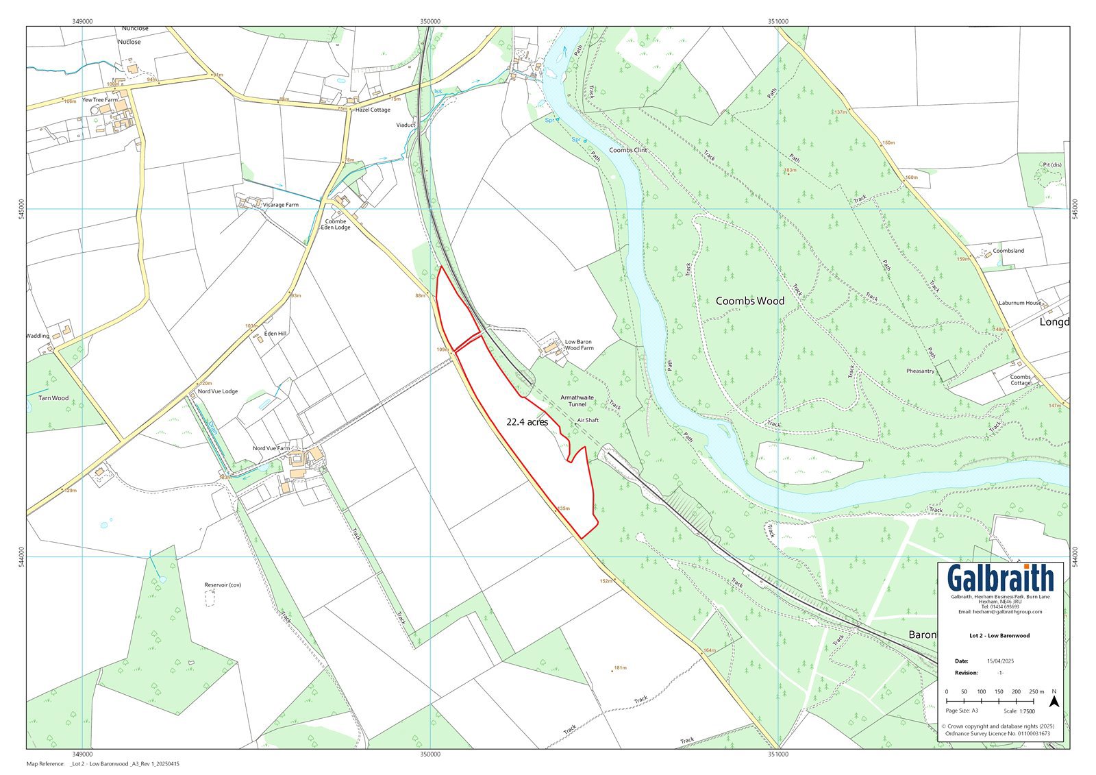 Lot 2 - Low Baronwood is a parcel of about 22.4 acres (9.06 Ha) of good grade 3 arable land ideal for arable cropping. There is easy access from the public highway. Water is by a natural supply.In addition to the arable land at Lot 2, further lots are also available for sale separately (lots 1 and 3).Lot 1 of Low Baronwood Farm forms the main part of a good and productive residential farm extending to about 89.72acres (36.30 Ha) and includes a good mix of arable, pasture and woodland parcels along the riverbank. The main access is by the private drive from the public highway although a right of access to Lot 1 for agricultural machinery will be reserved across Lot 2.The houses are situated in a heavenly location at the end of a long sweeping drive which culminates in an extensive gravelled parking area. The property is surrounded by rolling fields and open countryside with landscaped gardens and grounds. The property enjoys sensational scenery and benefits from a high degree of privacy. There are no public rights of way across the property. The main house was converted from of a range of traditional buildings in 2007 by the sellers. It is an uncommonly well-presented house with a flexible flow of accommodation which works well as a cosy and comfortable family home with a luxurious principal bedroom suite and some striking reception rooms. It is well equipped for entertaining on the grandest of scales. The house occupies a commanding position with a background of mature woodland and parkland type land leading down to the banks of the River Eden.There are various well organised and useful outbuildings which have historically been used for the storage of farming equipment.The Old Farmhouse is across the courtyard. It is a detached brick-built building with 3 bedrooms and two reception rooms. It needs repair and modernisation and could work well for those who like an additional income stream. It is restricted in planning terms to holiday accommodation. It cannot be occupied as a permanent residence.Lot 3 is an appealing block of about 49.19 acres (19.91 Ha) of productive woodland. The woodlands at Baronwood are located on the bank of the River Eden which forms part of the River Eden Special Area of Conservation and also forms part of the River Eden and Tributaries SSSI. There is also another small area of SSSI (Eden Gorge) to the southeast of the woods. The trees are growing in generally gently to moderately steep ground with areas of very steep ground. Most of the land has been worked by forestry machinery. The aspect is generally northerly. Soils are generally fertile and support a range of productive conifer as well as mixed broadleaf crops. The soft wood elements have been regularly thinned and there remains a good amount of timber to be harvested in the next five to ten years. The main section of commercial trees has a well-formed forest road with direct access from the public road and has been regularly used for timber extraction. There are currently no forest plans, felling licences in place and no outstanding grant scheme obligations. The broadleaf elements are principally amenity although good quantities of biomass will be available in the future.The neighbouring estate has a right of access. The sellers are not aware of this being exercised. The boundaries against the railway are maintained by the railway. The boundary with the neighbouring woodland owner to the south-east is not fenced. Where the woodland meets with the public highway, the drystone wall has been maintained by the seller.DirectionsFrom Carlisle, head south on the A6 and turn left for Armathwaite at the south end of High Hesket village. Take a right turn after about two miles and the land is on both sides of the drive before the railway tracks.Postcode: CA4 9TWWhat 3 Wordstrack.trunk.cyberMileagesArmathwaite 1 mile | Carlisle 12.5 miles (London Euston 3hrs 22min) | Penrith 11.3 miles | Keswick 28.5 milesLocal Authority: Eden District CouncilTenure: FreeholdViewingStrictly by appointment with Galbraith Hexham Tel: 01434 693693Email: hexham@galbraithgroup.comANTI MONEY LAUNDERING (AML) REGULATIONS Please note that under the 2017 AML regulations we are legally required to carry out money laundering checks against purchasers. To enable us to complete these checks purchasers will need to provide along with their offer either: a) originals of primary (e.g., a passport) and secondary (e.g., current council tax or Utility bill) or b) copies of the same certified and dated by appropriate professional. Failure to provide this information may result in an offer not being considered.IMPORTANT NOTES1. These particulars are intended to give a fair and overall description of the property. If any points are relevant to your interest, please ask for further information prior to viewing. Prospective purchasers are advised to seek their own professional advice. 2 Areas, measurements and distances are given as a guide. Photographs depictonly certain parts of the property. Nothing within the particulars shall be deemed to be a statement as to the structural condition, nor the working order of services and appliances. 3 The Seller will not be obliged to accept the highest, or indeed any offer and has the right to accept an offer at any time or withdraw the property from the market. The Seller will not be liable for any costs incurred by interested parties. 4 If there are matters of particular importance please raise this with us andwe will try to check the information for you. Particulars prepared April 2025. Photographs taken April 2025.