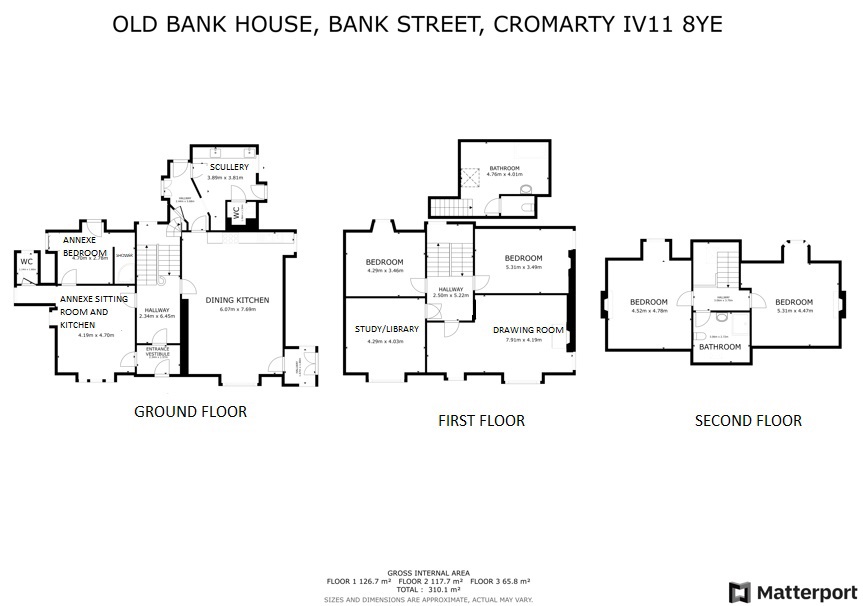 Old Bank House is a handsome B listed property in the centre of Cromarty on the Black Isle, a peninsula lying just to the north of Inverness between the Moray and Cromarty Firths. Built in the 1820’s as a bank and with connections to Hugh Miller, the famous Scottish geologist and writer, the property is of historic note in the village.Cromarty, an 18th Century former fishing village, is a charming mix of meandering lanes, fishermen’s cottages and subtantial merchants’ houses. There is a good range of independent shops, a small supermarket with post office, and primary school, as well as a community cinema, cafes, restaurants and the harbour with its ferry to the north side of the firth. Secondary schooling is available at the highly regarded Fortrose Academy and Inverness, about 40 minutes’ drive away, has all the facilities of a modern city including its airport with regular flights to the south and Europe.The Black Isle has fertile rolling countryside with a beautiful coastline of raised beaches and prominent headlands. The area has a number of way-marked cycle trails and walks, while the coastal villages offer sheltered harbours and nearby Fortrose has a links golf course.Old Bank House is in a delightful, peaceful setting in the village, within walking distance of all amenities and the harbour. Semi-detached to the rear, the house is private with its sheltered garden and secluded courtyard. The current owners purchased the property in 2007 when it was in a poor state of repair and have restored and upgraded both the interior and exterior to create an impressive, beautifully presented family house. The work carried out was extensive and included re-roofing, rewiring, replumbing, the installation of a wood pellet boiler, reconfiguration of some of the rooms, timber treatments, and complete redecoration. Where possible traditional features have been retained, restored or replaced in the same style, while small areas of original decorative features have been left exposed to echo the history of the house. The ground floor annexe, the former bank rooms, has both internal and external access and is currently incorporated into the existing accommodation but also offers potential for use as self-contained wing.