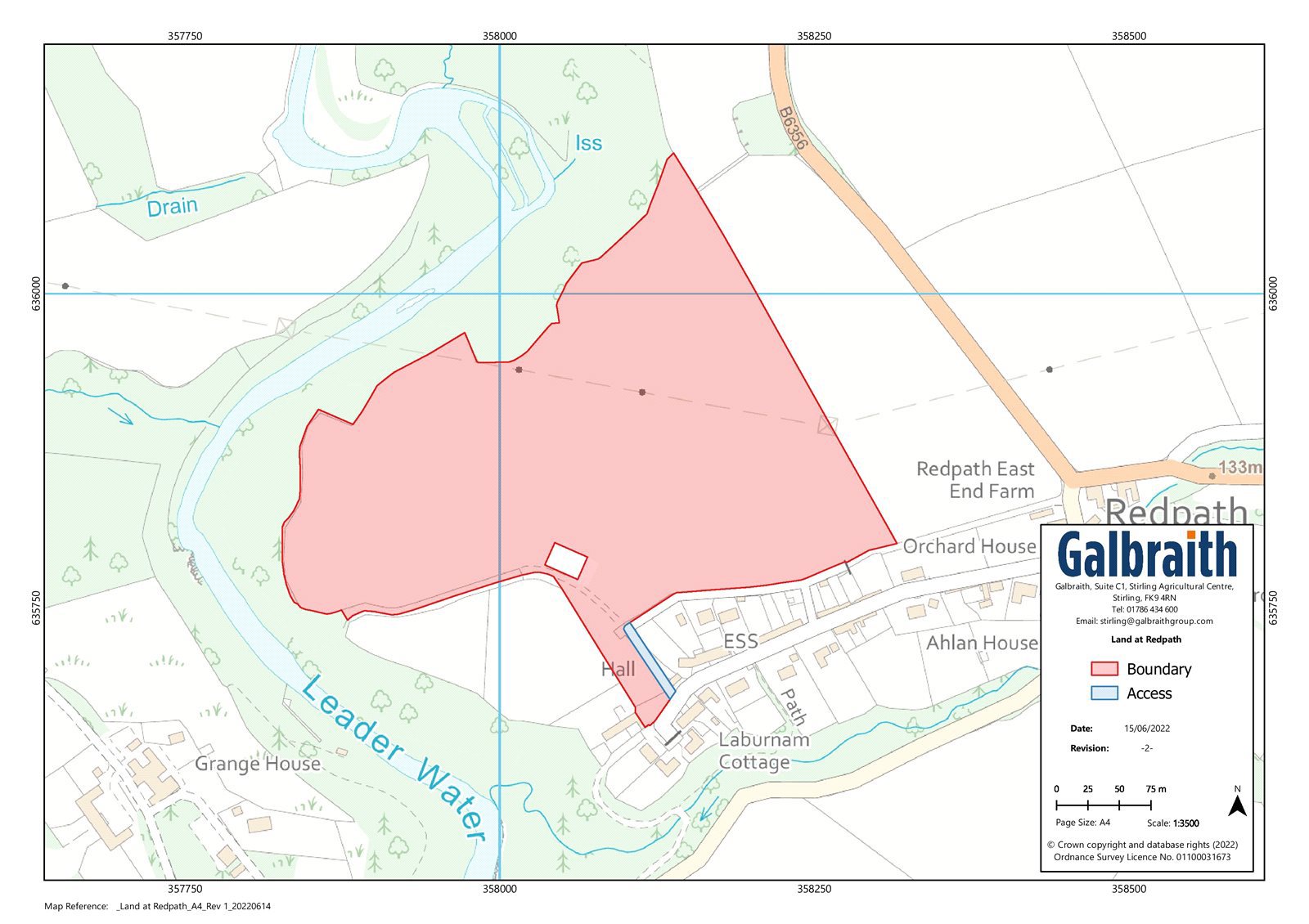 SITUATIONThe land is situated adjacent to the settlement of Redpath, a charming village set in the heart of the Borders between Melrose and Earlston. The field is easily accessible to the A68 providing good access to Edinburgh and the south. The nearby towns of Melrose and Earlston provide a wide variety of independent shops, restaurants, hotels and other professional services. The Borders Rail Link with Tweedbank is 5 miles distant.DESCRIPTIONThe Land at Redpath comprises a productive block of pasture land which extends to approximately 9.96 Ha (24.6 Acres) in total, and is situated in private position to the north of Redpath. The land is bound to north and west by an area of woodland which follows the Leader Water and lies immediately adjacent to the settlement boundary of Redpath. The land is gently sloping with a south westerly aspect towards the village of Redpath, lying between 99m above sea level at its lowest point adjacent to western boundary to 137m above sea level at its highest point on the north east of the subjects. The land has been classified as being grade 4.2 by the James Hutton Institute and has been down to pasture for a number of years and used for grazing and fodder production. There is a mains fed water trough located within the field to the south of the subjects.METHOD OF SALEThe land is offered for sale as a WholeWHAT-THREE-WORDSTo find this property location to within 3 metres, download and use What3Words and enter the following 3 words: w3w.co/rushed.sweep.waltzedSOLICITORSAnderson Strathern1 Rutland CourtEdinburghEH3 8EYT: 0131 270 7700E: Stuart.Orr@andersonstrathern.co.ukSPORTING RIGHTSInsofar as these rights form part of the property title they are included with the sale.TIMBERAll fallen and standing timber is included in the sale insofar as it is owned.MINERALSThe mineral rights are included in the sale insofar as they are owned by the Seller.DESIGNATIONSThe subjects fall within Eildon and Leaderfoot National Scenic Area. Further details are available from Nature Scot website sitelink.nature.scotThe Land at Redpath currently falls outwith the settlement boundary for Redpath village as defined within the Scottish Borders Local Development Plan (LDP) which was adopted on 12 May 2016, but given the strategic location of the land in terms of the wider settlement the land may present longer term development potential subject to obtaining necessary planning consents.A small area of the subjects of sale falls within the wider Redpath Conservation Area. Further details are available from the Scottish Border Local Planning Authority. www.scotborders.gov.ukTHIRD PARTY RIGHTS AND SERVITUDESA small area of the subjects which is adjacent to the access track is used and looked after by local residents of the village. Although there is no formal agreement in place in respect of the use of this area, the Seller’s preference is for this area to continue to be used by the local residents going forward. Further details are available from the Selling Agents.There are various rights in favour of a number of proprietors of the adjacent dwelling houses to south of farmland in relation to drainage.There is a deed of servitude in relation to a power line crossing the subjects.The owners of the houses in the former Morrison homes development also benefit from various rights over the subjects in relation to an outlying area of ground which forms a reed bed, which is bound but excluded from the subject of sale.The owners of Redpath West Farmhouse have a heritable and irredeemable servitude right of pedestrian and vehicular access over the small area of land currently used by the local residents to the south of the subjects.The subjects are sold together with, and subject to, all existing rights of way, servitudes, wayleaves and others whether contained in the Title Deeds or otherwise, and purchasers will be deemed to have satisfied themselves in all respects thereof.VIEWINGBy appointment with the Selling Agents.LOCAL AUTHORITYScottish Borders CouncilCouncil HeadquartersNewton St BoswellsMelroseTD6 0SAT: 01835 824 000