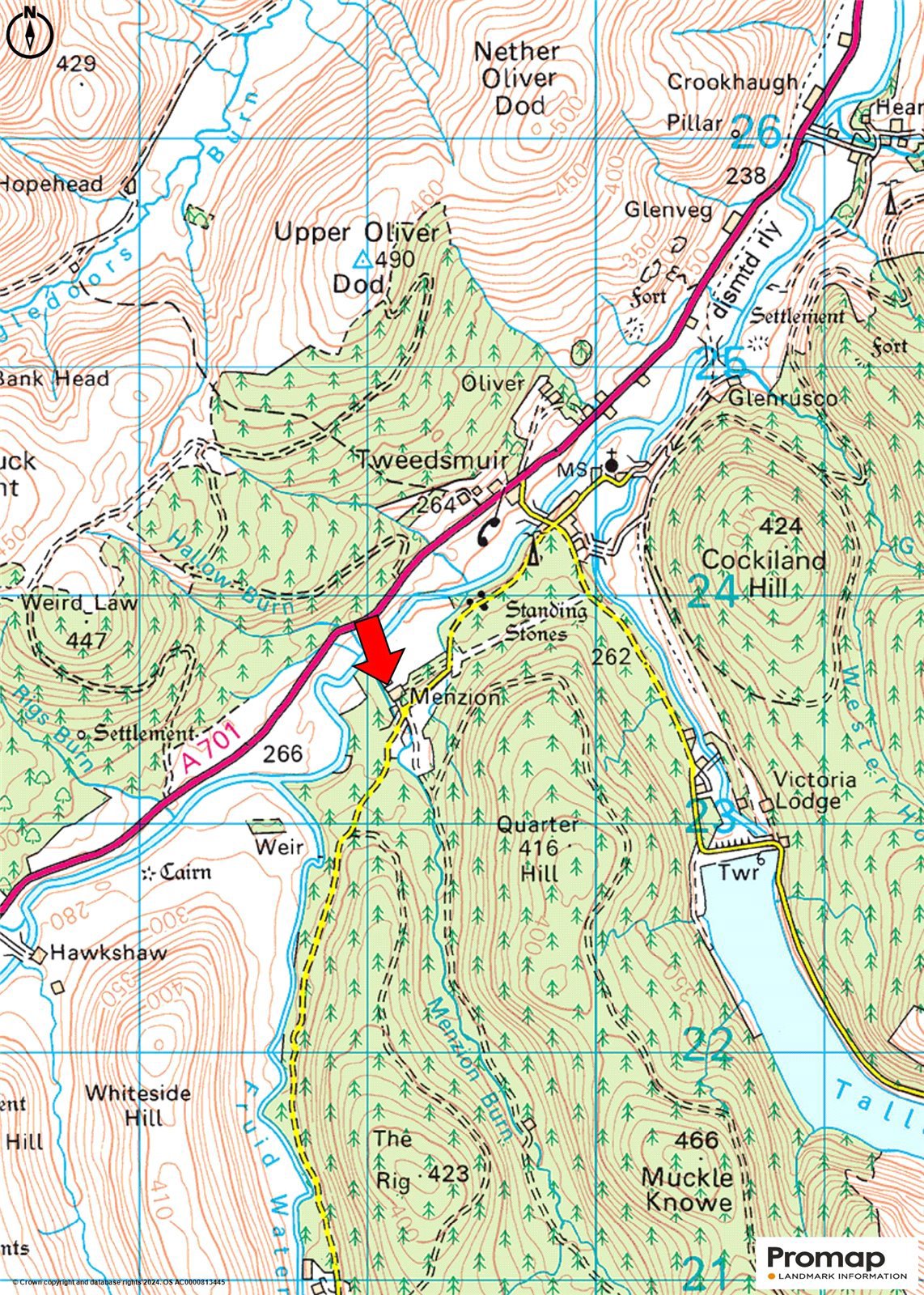 SITUATION Menzion Farm sits in a stunning location outside the pretty village of Tweedsmuir in the Scottish Borders. There is no shortage of beauty in the surrounding countryside and the property enjoys over half a mile of frontage onto the River Tweed. There are plentiful opportunities for outdoor pursuits in the area, including great routes for walking and cycling. The active community opened the Wee Crook café as a vibrant village hub in 2023 on the site of the famous Crook Inn, where Rabbie Burns used to write. Eight miles north of Tweedsmuir is the village of Broughton, with the local Primary School, Community shop, Tea Room and garage. The market town of Biggar is five miles west of Broughton and all necessary services and amenities can be found here alongside many independent retailers. Secondary school children would travel by bus to Peebles High School following their primary education at Broughton.Further afield, Peebles offers yet more retail and cultural opportunities as well as the world famous Glentress mountain bike venue. The A74 Motorway is only 16 miles away and gives direct access to the NW of England. METHOD OF SALE Menzion Farm is offered for sale as a whole.DESCRIPTION Menzion Farm is an attractive courtyard of buildings and offers opportunities for small-scale farming and equestrian use. The approximately 30 acres of pasture has been used in recent years for sheep grazing and conserved forage, and ranges from 4.1 to 5.2 according to the James Hutton Institute of Land Classification. The elevation of Menzion Farm lies between approximately 255 metres (838ft) and 276 metres (907ft). Main House: The main house was built in c.1850 and is approached from a private gravel driveway. It offers flexible family accommodation over one level, extending to 129.8sq.m. The lounge has a wealth of natural light and the stove is a focal point of the room. There are three double bedrooms and family bathroom. The dining kitchen offers a range of wall and base units and doors to both the rear garden with seating area, a perfect spot for morning coffee, and to the courtyard. The accommodation comprises: Sitting room, kitchen/dining room, 3 bedrooms, rear porch/utility, separate WC with hand basin, family bathroom. Annexe: There is a self contained annexe to the south/west of the cottage with garage/outbuilding attached, which was converted from historic outbuildings in 2009, and offering potential for holiday let and commercial income. The lounge/dining kitchen has a range of wall and base units and space for wood burning stove. The annex benefits from under floor heating. The accommodation comprises: Kitchen/living area, bedroom and bathroom, there is an internal door leading to a useful outbuilding. Garden The large garden behind the main house is laid out as two areas of lawn with mature trees and shrubs and a productive vegetable garden with fruit bushes and a greenhouse. OUTBUILDINGS To the north east of the house there are a byre and a former laundry with sinks and a WC, which are currently utilized as a workshop/store and offer further development opportunities.LAND Menzion Farm extends to approximately 12.88 Ha (31.83 Acres) in total including yards and buildings. The land comprises of permanent pasture which has been principally classified as Grade 4.1 and 5.2 by the James Hutton Institute. The land rises from approximately 255m above sea level at its lowest point to approximately 276m above sea level at its highest point. The current field configuration is of seven paddocks bordering the River Tweed behind the house. The fields are serviced with several natural water supplies and are well fenced but also with some well-crafted dry stone dykes.The land is a mixture of pasture, grazing and riverbank. The land has been successfully let out for grazing on short-term leases.