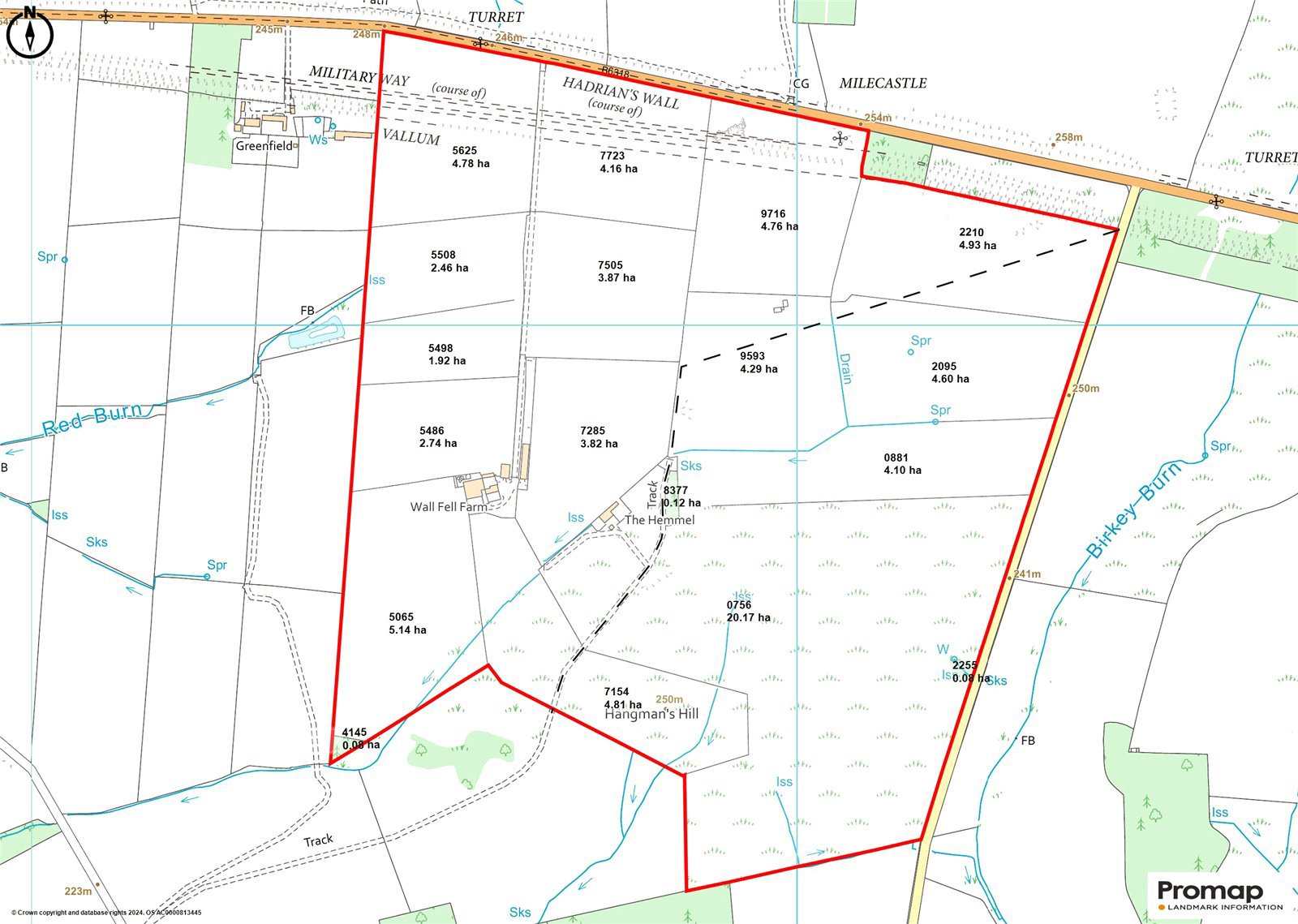 A well-shaped and scenic agricultural investment property located on Northumberland’s historic Hadrian’s Wall and extending to 214.76 acres (86.91 ha) or thereabouts. Well-proportioned and tastefully restored three-bedroom farmhouse of considerable character and with outstanding views. A mix of traditional and modern farm buildings on 3 separate sites, with potential for alternative uses 21.59 acres of arable land 64.15 acres of meadow land 53.15 acres permanent pasture 71.65 acres upland grazing 2.22 acres mixed woodland For sale by private treaty as a wholeGENERAL DESCRIPTIONWall Fell Farm is a most attractive and multi-dimensional let agricultural holding extending to around 214.76 acres (86.91 ha) lying close to Hadrian’s Wall in one of Northumberland’s most stunning locations. The area is known for its privacy, seclusion, dramatic landscapes and Dark Skies.The majority of the holding comprises Wall Fell itself, a compact and well-shaped livestock unit extending to around 191.63 acres (77.55 ha). Wall Fell occupies a striking, private location within The Hadrian’s Wall World Heritage Site, with sweeping views to the south, east and west, yet is well placed for local market towns and easily accessible from larger centres. The popular towns of Hexham and Corbridge lie within 5 miles, offering a wide range of educational, cultural and retail facilities, as well as local rail links. Newcastle upon Tyne, the regional centre with its wealth of commercial facilities, universities, international airport and East Coast main line rail connections, is less than 24 miles.The farm is well-shaped and easily accessible, with the final approach being via a section of private road off the B6318 Heddon-Chollerford road.The land lies between 230m and 250m above sea level and enjoys good access from north and south via the nearby B6318 road.The centrepiece is the main farmstead, incorporating the farmhouse itself and a mix of modern and more traditional farm buildings.There are various small areas of woodland, and substantial wildlife and ecological interest. Owing to the presence of the Hadrian’s Wall national walking Path and the proximity of Hadrian’s Wall itself, we believe there to be considerable potential for some form of tourism or leisure-related development on the farm, subject to the relevant consents.Land at Cross Bank, an outlying area of arable land and woodland, is located approximately 4 miles to the south west, a short distance to the north of the village of Acomb. This portion of land, lower lying between the 60m and 90m contours, extends to around 23.12 acres (9.36 ha), including 1.53 acres of attractive, mixed broadleaved woodland, and 21.59 acres of arable land.The Land at Cross Bank, with its ability to produce good yields of combinable crops and straw, complements the livestock operations at Wall Fell itself.TENUREThe Property is let under a first succession, 1986 Agricultural Holdings Act (AHA86)-governed tenancy in favour of Mr Richard Keen.The freehold interest in The Property, subject to this tenancy, is offered for sale as a whole.THE FARMHOUSEThe farmhouse occupies an attractive, south-facing position towards the south of Wall Fell Farm and enjoys outstanding views, especially to south and west. The mainly two-storey dwelling is believed to be principally of 19th Century construction and is constructed largely of sandstone under slate.The accommodation includes:On the ground floor:Front entrance hall with stairs off;Living room with woodburning stove (installed by Farm Tenant),Kitchen with fitted floor and wall range and electric stove and hob (all installed by Farm Tenant)Playroom (formerly office)Family bathroomRear entrance hall (W) incorporating Klover PB35 biomass boiler (installed by Farm Tenant)Utility RoomFurther hall (N)WCOn the first floor:Landing.Three bedrooms.The house has been substantially improved and modernized in recent years. Windows are UPVC double-glazed and the majority of the roof was felted and re-slated around 1989.EPC Band EFARM BUILDINGSThe farm buildings are located on three separate sites. The main farmstead is arranged immediately to the north, east and west of the farmhouse.The buildings here comprise:1. Stone under slate range, incorporating workshop, meal-house and former byre and storage areas.2. Stone under asbestos cement byre serving as storage.3. 5 bay, steel portal framed cattle building and lean-to (23.00m x 16.00m overall) having concrete floor and asbestos cement roof (walls, cladding and flooring recorded as Tenant’s Fixture).4. Lean-to cattle accommodation (23m x 5m) with fibre-cement monopitch roof (recorded as Tenant’s Fixture).5. 4 bay, steel portal framed implement shed/workshop building (18.50 m x 12.20 m) with concrete floor, steel sheet side cladding and asbestos cement roof (recorded as Tenant’s Improvement).6. Timber-framed sheep shed (46.50m x 9.15 m) with steel sheet monopitch roof and side cladding (recorded as Tenant’s Fixture). Approximately 120 metres to the east, there is a secondary building range known collectively as The Hemmel, which is recorded as redundant under the Tenancy Agreement. Specifically, this comprises:7. A 3 bay, steel framed hay barn (13.80 m x 4.90m) with corrugated steel side cladding and roof and open to south-east.8. 5-eyed, former cartshed built in stone and brick under a fibre-cement roof.9. Lean-to former livestock housing on brick piers under a fibre-cement roof.10. Stone building under a pitched, fibre-cement roof. In a striking position around 450 m to the north-east of the farmhouse, there is a largely derelict pair of buildings, also recorded as redundant under the tenancy agreement. Specifically, these comprise:11. Flanders House, a former two storey detached farmhouse, built of stone under a (now collapsed) stone slab roof.12. Adjacent, formerly lofted barn, built of stone under a (now collapsed) stone slab roof.We consider that some of the buildings may offer p