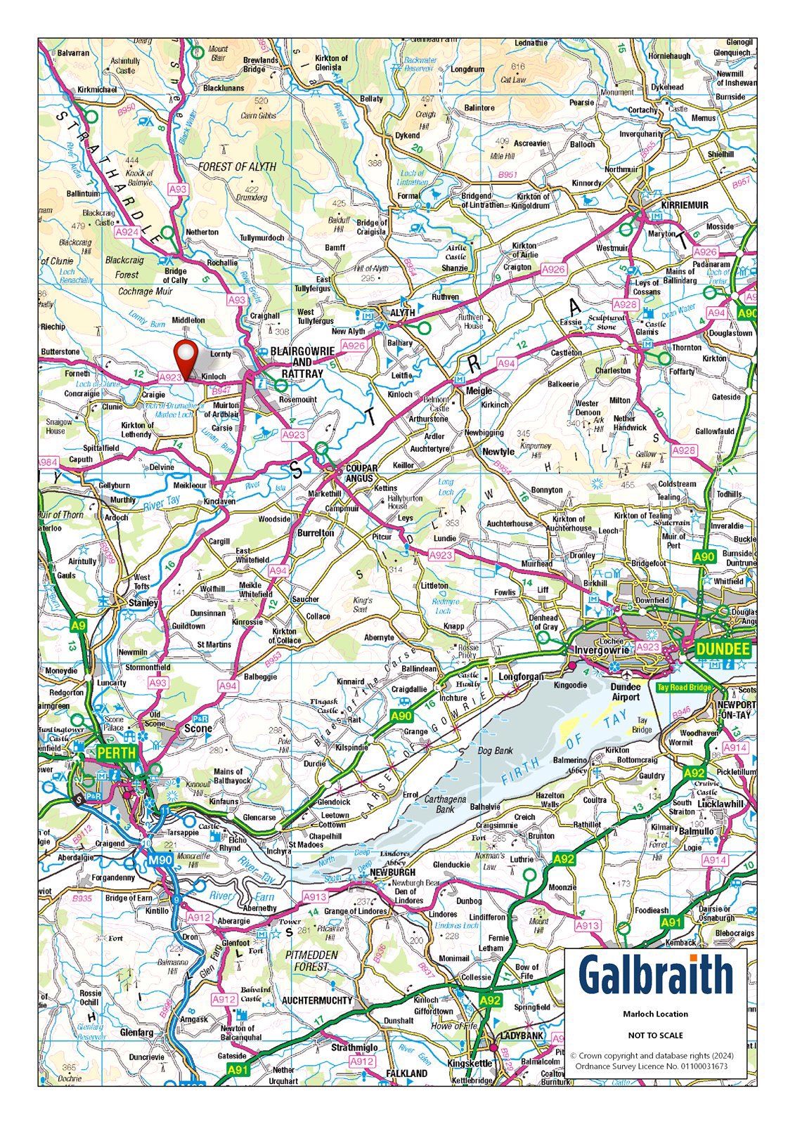 SITUATIONMarloch is situated in Kinloch, a pretty hamlet only 2 miles west of Blairgowrie. The popular and highly sought after town of Blairgowrie provides an excellent array of services including primary and secondary schooling, shops and supermarkets, cafes and restaurants, and a health centre. The fair city of Perth lies 17.5 miles to the south and the city of Dundee 21 miles to the south east, both cities have a wide range of facilities, including theatres, cinemas, restaurants and supermarkets. Perth is home to the University of the Highlands and Islands while Dundee boasts two universities and an airport with regular flights to London. Both Perth and Dundee have railway and bus stations with regular services to Edinburgh and Glasgow.The surrounding area of Perthshire offers a wealth of recreational opportunities and is well suited to the outdoor enthusiast for walking, cycling and horse riding. The area around Marloch is home to a wide array of wildlife and there is easy access to particularly outstanding and varied countryside with hills, woodland, river and rolling farmland. There are a number of golf course locally including three golf courses available in Perth, two in Alyth, Rosemount in Blairgowrie, as well as numerous championship courses at St Andrews. Shooting and fishing can be taken in the nearby area.DESCRIPTIONMarloch is an attractive 3/4 bedroom detached property offset from the main road running through Kinloch. The property is of timber frame construction with a stone front, block and harling to the rear, and under a slate roof. Upon entering, the impressive dining hall leads to ample reception spaces comprising a generous triple aspect living room with open fire, sunroom with garden access, and a dining kitchen with adjoining utility room and shower room. The ground floor also hosts a double bedroom and additional WC. A fixed staircase leads to the first floor comprising a large mezzanine, master bedroom with ensuite, double bedroom with integrated wardrobes, family bathroom, study and storage room which has scope to be an additional double bedroom.ACCOMMODATIONGround Floor: Entrance Dining Hall, Living Room, Sunroom, Kitchen, Utility Room, Shower Room, Double Bedroom, WC.First Floor: Master Bedroom with En-Suite, Double Bedroom, Storage Room, Family Bathroom, Office and Storage / Double Bedroom.GARDENMarloch is accessed via a private tarmac drive leading to a triple garage with power, extensive workshop and ample space for parking. Marloch is centrally positioned within its garden grounds which are bounded by stone walls. To the rear of the property is a wonderful outdoor patio area with space for outdoor dining and hosting friends and family. The grounds feature areas of lawn, decking, a summer house and a variety of shrubs and bushes providing ample privacy and a myriad of colour. There is also a large storage shed to the rear of the property which can be removed.