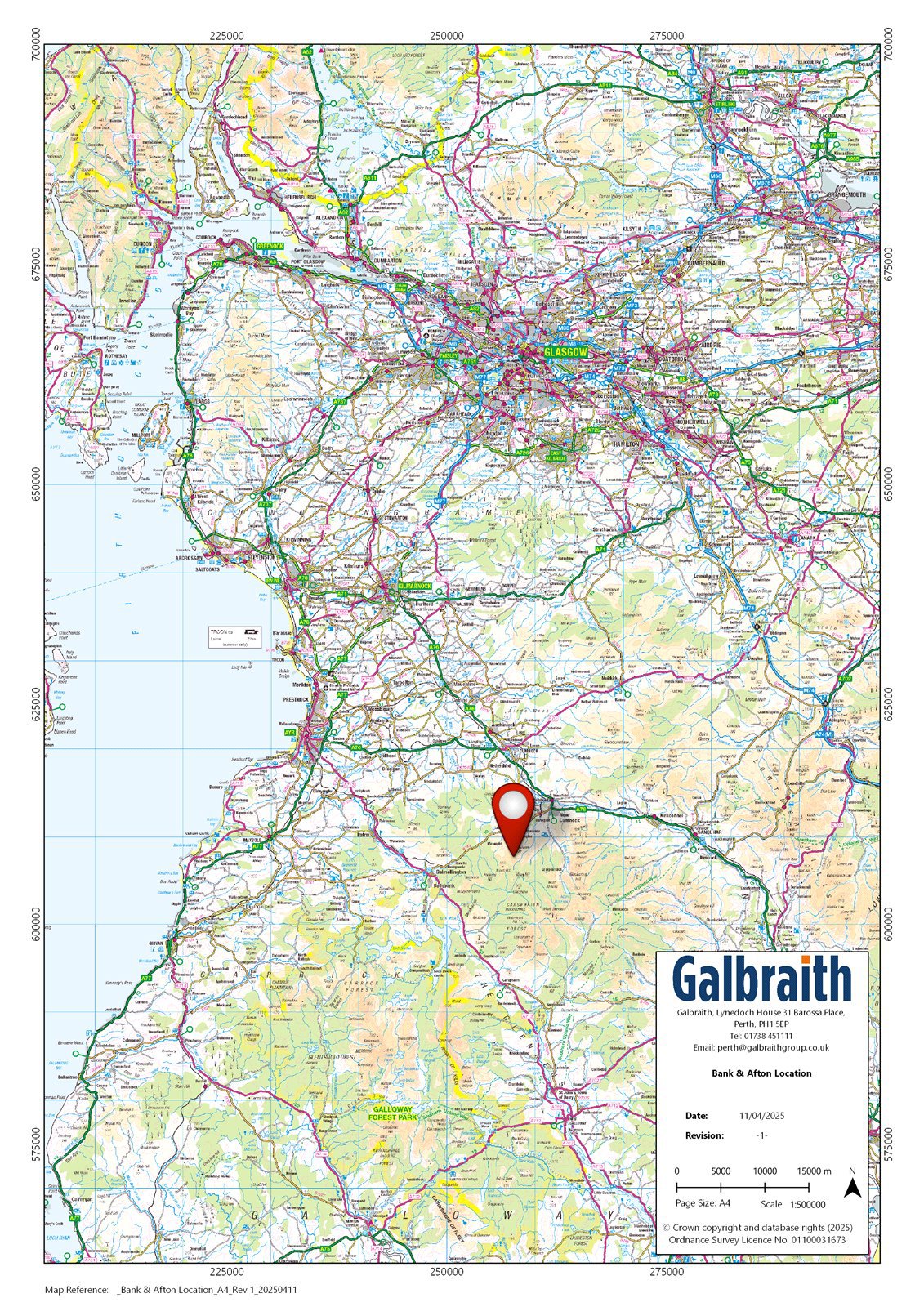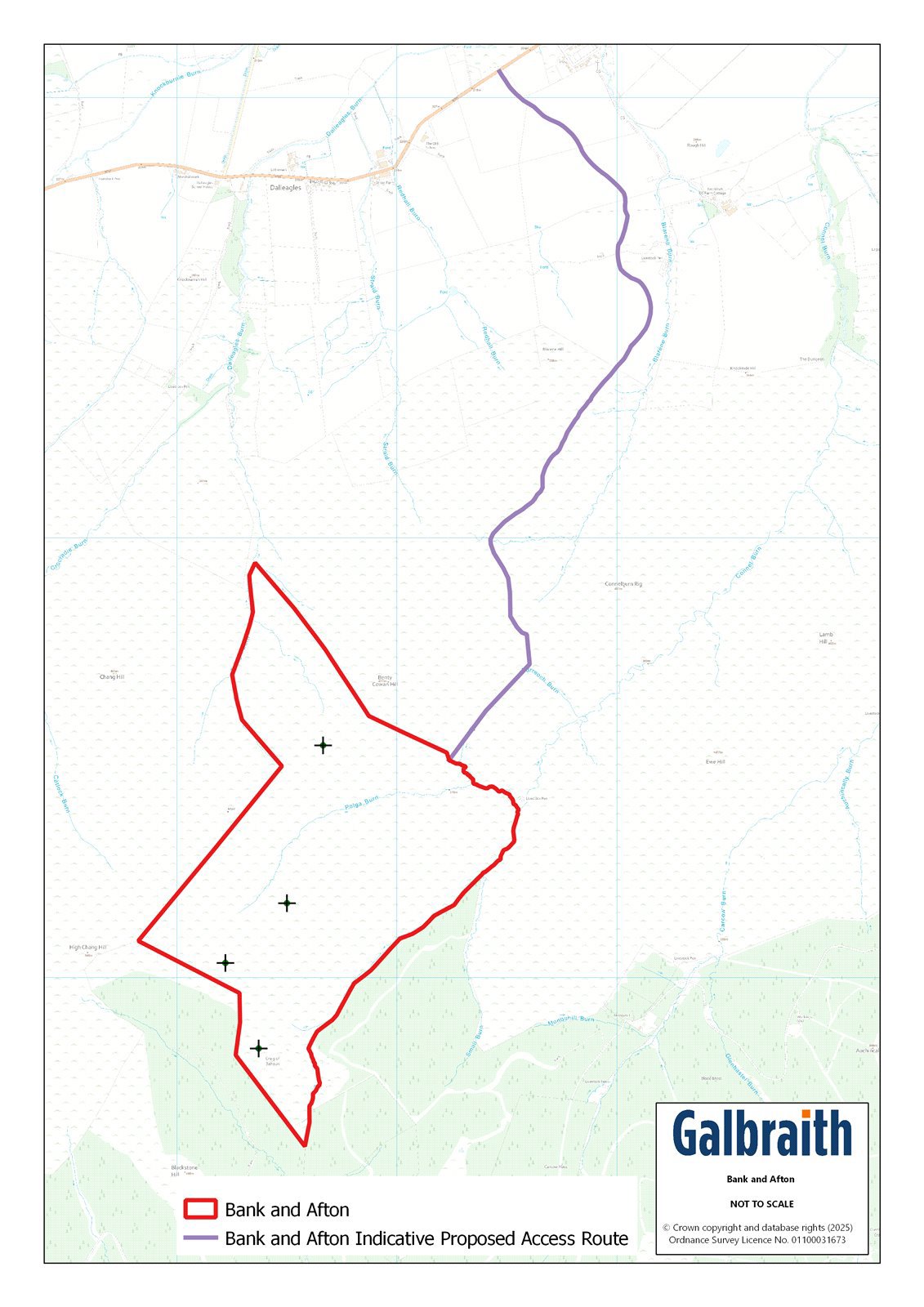 CLOSING DATE SET – 12:00 NOON – WEDNESDAY 23RD JULY 2025SUMMARY OF SUBJECTS FOR SALEThe land at Bank and Afton is located approximately 4 miles south west of New Cumnock and 7 miles east of Dalmellington in the county of Ayrshire. The city of Glasgow lies about 45 miles to the north east.The land comprises an area of upland grazing and is predominantly made up of open ground rising to about 477m above sea level around Benty Cowan Hill. It extends to approximately 174.46 hectares (431.10 acres) and is bounded to the south by a mature woodland plantation.The land is classified as Grade 6.2 and 6.3 by the James Hutton Institute land Capability for Agriculture. The land at Bank and Afton is being offered for sale with the benefit of detailed planning permission for the erection of four 4.8MW wind turbines (19.2MW) forming part of the Enoch Hill Wind Farm, a development of 16 wind turbines in total.The development has been promoted by RWE Renewables UK Onshore Wind Limited, a major renewable energy developer who are the operator of the wind farm and have a lease in place on the following terms:- Term: 32 Years from 1st March 2023 to 28th February 2055.- Rent Commencement Date: 1st Septemeber 2024.- Minimum Rent: £6,000 (index linked to the RPI from June 2018)/MW installed payable quarterly in advance = £160,297.83/annum (index linked to January 2025).- Variable Income Rent: From the Rent Commencement Date a Variable Income Rent is payable per annum as set out in the brochure less any Minimum Rent already paid for the rent year.- The Rent Commencement Date is the 1st Septemeber 2024, the earlier of when electricity is first exported commercially from the Wind Farm or 18 months from the 1st March 2023.- There are restrictions on woodland planting and erecting other structures over the wind protection zone. - The Lease makes provision for habitat managment within the property.- The Tenant is liable for decomissioning the wind farm and there is a Bond in place to cover decomissioning liabilities. It should be noted that construction work on the windfarm commenced in June 2023, with approximately 3km of road infrastructure leading from the access point on the B741 being created on land adjacent to the subjects. The erection of the wind turbines is now under way, with the expectation that the construction of the wind farm will be completed in 2025.METHOD OF SALELand at Bank & Afton is offered for sale as a whole.VIEWINGViewing is strictly by prior arrangement only. Names of parties and vehicle registration details will be required.