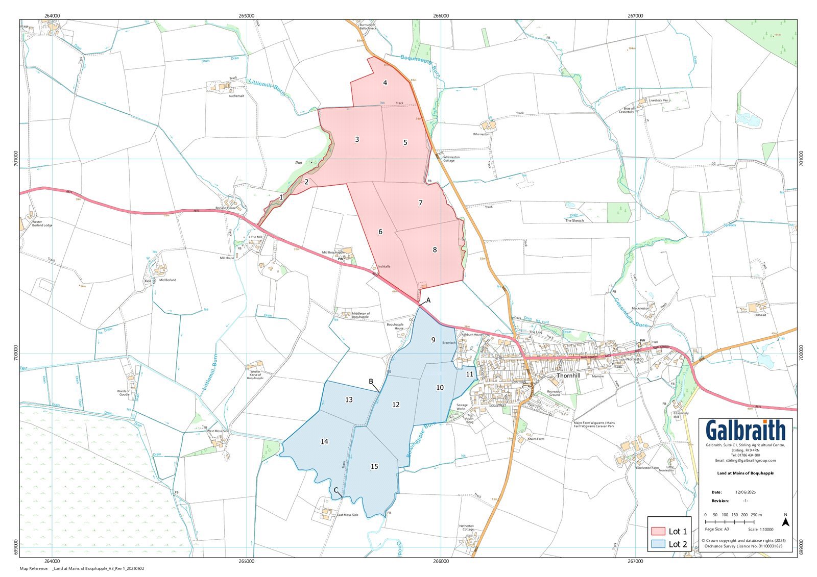 SITUATIONThe Land at Mains of Boquhapple forms two productive blocks of arable and grazing ground located next to the attractive rural village of Thornhill. Thornhill offers day to day amenities with the popular tourist town of Callander located roughly 10 miles to the north and features a wider range of services. Stirling about 10 miles to the east of the holding with Glasgow about 32 miles southwest and Edinburgh being 45 miles to the east.The land is located within close proximity to excellent transport infrastructure with the M9/M80 motorways being accessible within a 15 minute drive and the train stations of Stirling, Bridge of Allan and Dunblane all within a 20 minute drive respectively. Glasgow and Edinburgh International Airports are within an hour offering regular domestic and international flights.The scenic Loch Lomond and Trossachs National Park is within a 15 minute drive to the west of the land, offering famous scenery and a variety of recreation and leisure opportunities including a wide range of water sports. The surrounding hills are extremely popular with hill walkers and the area as a whole offer’s opportunities for mountain biking, sailing, horse riding, shooting and fishing.Agriculturally, the Carse of Stirling area is well provided for by merchants and suppliers, with the nearby UA Mart at Stirling providing a fantastic outlet for good quality livestock, which the area is renowned for producing. The Carse land itself also provides a mix of productive arable and grassland and the area is well known for growing the finest quality Timothy Hay, widely regarded as being the very best in the UK.DESCRIPTIONThe Land at Mains of Boquhapple comprises two productive blocks of arable and grassland extending to approximately 99.87 ha (246.78 acres) in total. The land is utilised for the production of grassland for fodder, arable cropping and potatoes, it has been classified as Grade 3.2 by the James Hutton institute. The land is split into two distinct parcels and lie to the north and south of the A873, with the southern block bound to south by the Goodie Water, and northern block located to the north of A873 and partially bound to the east by the B822. The subject also includes an area of hard standing and modern general-purpose agricultural shed, which are accessed via a private farm road which leads from the A873.METHOD OF SALELand at Mains of Boquhapple is offered for sale as a whole or in 2 lots.LOT 1: MODERN BUILDING AND LAND TO NORTH OF THE A873 EXTENDING TO ABOUT 54.23 HA (134.00 ACRES)Modern Store (24.38m x 15.24m)Located within Lot 1, a short distance to the north of the A873, there is a useful general-purpose agricultural shed which is of a steel portal frame construction under a box profile roof and side cladding and a stone floor. The building benefits from a mains water supply.FarmlandThe land at Lot 1 extends to about 54.23 Ha (134.00 Acres) in total and comprises a productive mix of arable and grassland with a small area of mixed amenity woodland along the western periphery and to the east of field 8. The land is generally of a southernly aspect and rises from approximately 30m above sea level at the lowest point on the southern western point to approximately 89m above sea level at the highest point along the northern boundary. The land benefits from an excellent level of farm vehicle access from either directly off the adjacent public roads or by internal farm tracks. The land has historically been in a rotation of cereals and temporary grass, with one field down to potatoes this year.LOT 2: LAND EXTENDING TO ABOUT 45.64 HA (112.78 ACRES)The land at Lot 2 is located to the south of the A873 and extends to about 45.64 Ha (112.78 Acres) in total and comprises an area of arable and pasture ground. The land currently down to mix of spring barley, temporary grass and pasture, all of the fields are of good practical size and layout well suited to modern machinery. The land is generally of a slight southernly aspect rising from approximately 12m above sea level at its lowest point along the southern boundary with the Goodie Water, to about 35m above sea level at the highest point on the northern boundary adjacent to the A873. The land benefits from a right of access over a shared private road between points A and B on the sale plan below, which is owned by a third party, and the land is split into a number of enclosures which are both readily accessible from a shared access road and from field gates which lead onto A873 to the north.PROMOTION & CLAWBACK AGREEMENTThe sale of Lot 2 is subject to an existing development promotion agreement in favour of a third party, in relation to the land forming enclosures 9, 10, 11, 12 & 15, located to the west of the Village of Thornhill. It is a condition of sale of Lot 2, that the purchaser(s) upon entry will (a) enter into a Deed of Adherence to confirm their compliance with the terms of the promotion agreement, on the same terms as the Seller in respect of Lot 2; and (b) the missives of sale will also be subject to the purchaser(s) entering into a new clawback agreement with the Seller (to be secured by a standard security) in order to secure to the Seller a clawback amount of 25% of any uplift in value (over and above agricultural value) of said enclosures 9, 10, 11, 12 & 15, arising as a result of planning permission being granted for any change of use of the said subjects, from the date of entry for a period of 25 years.A high-level summary of the terms of the promotion agreement will be made available for viewing to parties who have had a formal viewing, provided satisfactory confirmation of proof of funding and a signed non-disclosure confidentially agreement in terms satisfactory to the Selling Agent.IACSAll the farmland is registered for IACS purposes and location code is 718/0064.NITRATE VULNERABLE ZONE (NVZ)The Land at Mains of Boquhapple is not included within a Nitrate Vulnerable Zone.BASIC PAYMENT SCHEME ENTITLEMENT