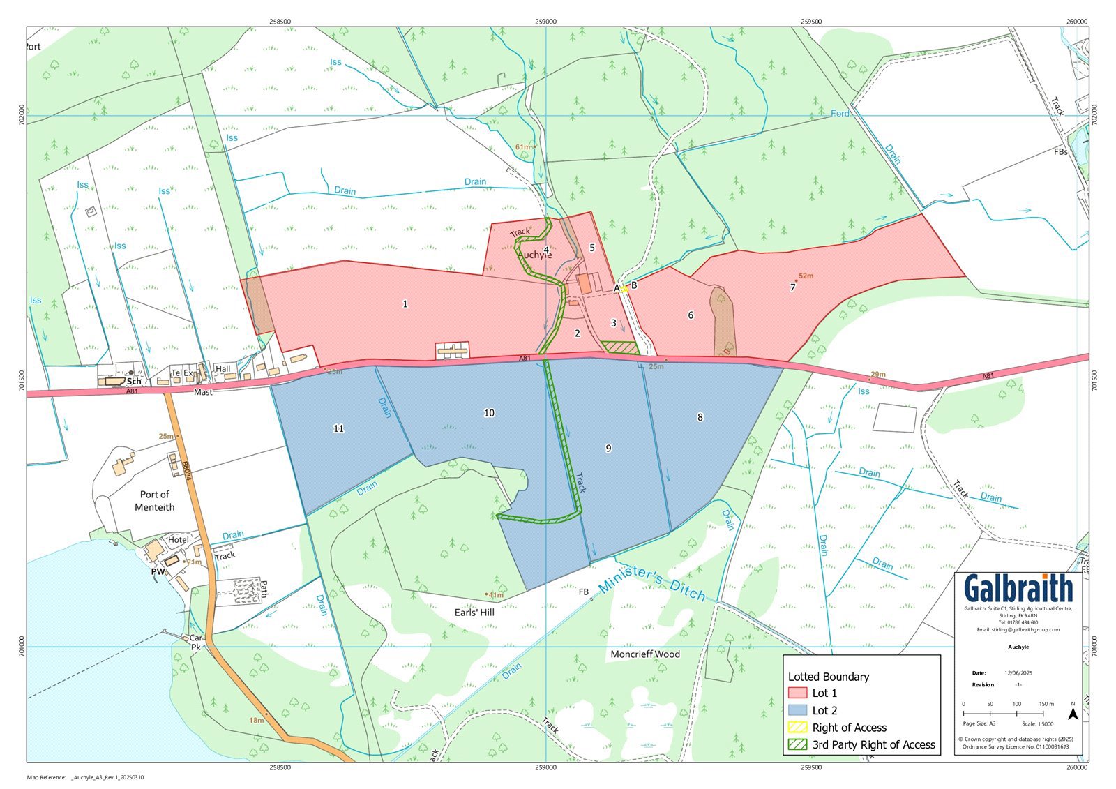 SITUATIONAuchyle Farm is located 0.3 miles east of Port of Menteith and 14.8 miles west of the city of Stirling. The farm is split by the A81 which also acts as the boundary of the Loch Lomond & The Trossachs National Park.DESCRIPTIONAuchyle Farm as a whole extends to 45.99 Ha (113.64 Acres) or thereby and comprises a 3-bed C Listed farmhouse with a compact range of useful agricultural buildings. The property is split by the A81 with the farmhouse, steading and 22.10 Ha (54.61 Acres) of land located to the north and a further 23.89 Ha (59.03 Acres) of grazing land located to the south. The property is situated in a rural yet accessible location within a short drive of A811 leading to the M9 motorway and large road networks.Glasgow Airport is located around 32.9 miles to the south and offers regular flights throughout the UK, Europe and beyond. The nearest train stations to Auchyle Farm are located in Bridge of Allan, Dunblane and the City of Stirling which provide access to a number of rail routes across the UK.The village of Port of Menteith offers access to a local primary school (Port of Menteith Primary School), with secondary schooling located 5.8 miles north in Callander (McLaren High School), in which Auchyle Farm falls within the catchment areas. Private Schooling is offered within Glasgow and Edinburgh with a wide range of highly regarded independent private schools.Callander, situated on the River Teith is located only 6 miles away and offers an excellent range of amenities. The town is very popular with tourists and provides a range of shopping and food related outlets.Agriculturally the surrounding area of West Stirlingshire provides an attractive location on the edge of the Loch Lomond and The Trossachs National Park and directly northeast of the Lake of Menteith. The farm is all down to grass and the local area is utilised for farming and forestry.METHOD OF SALEAuchyle Farm is offered for sale as a whole or in 2 lots.LOT 1- AUCHYLE FARMHOUSE, FARM BUILDINGS AND LAND EXTENDING TO 22.10 HA (54.61 ACRES)Auchyle FarmhouseAuchyle Farmhouse, an attractive house with a strong presence, is of stone construction under a pitched slate roof and has been classified as a C listed property. The accommodation over two floors comprises:Ground Floor:Entrance Hall, Utility Room, Kitchen, Dining Room, Sitting Room, Shower Room and Hallway.First Floor:3 Double Bedrooms and a Shower Room.The garden lies to the south of the property and comprises a large lawned area.Farm BuildingsAuchyle Farm provides for a compact equipped steading to the north of the Farmhouse, with a sizeable yard area adjacent. All of the farm buildings at Auchyle are equipped with mains electricity supply. The farm buildings comprise:Cattle Shed (18.25m x 25m) of steel portal frame construction under a fibre cement roof with concrete panel walls with fibre cement cladding and a concrete floor.Cattle Court (18m x 8.8m) of steel portal frame construction under a fibre cement roof with brick walls and a concrete floor.Kennels (7.3m x 5.4m) of stone construction under a pitched slate roof with a concrete floor.Store (11.3m x 5.9m) of rendered concrete block construction under a box profile sheeted roof and a concrete floor.Lean-to (13.9m x 4.4m) of steel portal frame construction under a fibre cement roof with fibre cement cladding and a concrete floor.All of the buildings are equipped with mains electricity supply and water source.The LandLot 1 Auchyle Farm extends to approximately 22.10 Ha (54.61 Acres) or thereby and sits to the north of the A81. The land is classified as a mix of Grade 3.2 and Grade 4.1 by the James Hutton Institute and is all down to grass and utilised for the purposes of grazing livetsock. The land sits approximately between 23m and 45m above sea level and with the land to the west of the farm being south facing with a gentle slope, with the land to the east being more rolling in nature. All of the land within Auchyle Farm has been classified as severely disadvantaged for the purposes of support under the Less Favoured Area Support Scheme (LFASS).Within Lot 1, all of the field parcels are bound by stockproof rylock fencing. There is a right of access to field parcels 6 & 7 (east of the steading) across the existing forestry track as hatched yellow on the attached sale plan between points A to B. This track is in third party ownership and is utilised for access to the forestry to the north. There is a 3rd party right of access across the property, hatched green on the sale plan.It is worth noting that there is a potential development gap site within the field to the west of Auchyle farmhouse & Steading, within Lot 1. It has been intimated to the existing owner that the there is a possibility that this area of land may be suitable for rural residential development in the future as outlined in the proposed Local Place Plan, although this would be subject to obtaining the necessary consents.LOT 2: LAND AT AUCHYLE EXTENDING TO 23.89 HA (59.03 ACRES)The land within Lot 2 Auchyle Farm extends to 23.89 Ha (59.03 Acres). The land sits in a ring-fenced block, lying to the south of the A81. The land within Lot 2 Auchyle has been classified as predominantly Grade 3.2 and Grade 4.1 by the James Hutton Institute with a small area of Grade 5.3 to the south and west of the property. All of the land within the lot is currently permanent grassland and has been utilised for the purposes of grazing livestock. The land within this lot has been classified as Severely Disadvantaged for the purposes of support under the Less Favoured Area Support Scheme (LFASS). There is a 3rd party right of access across the property, hatched green on the sale plan.