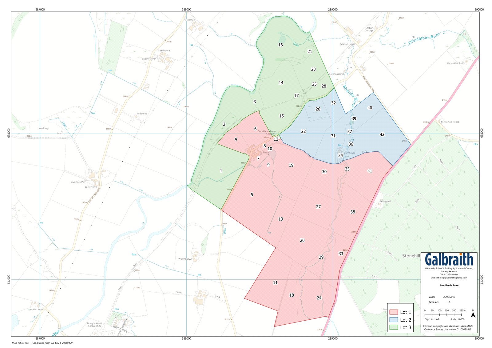 SITUATION Sandilands & Burnhouse Farms comprises a productive arable and grassland unit extending to 163.02 ha (402.81 acres) which is currently run as a beef, sheep and arable farm. The property is situated in a rural yet accessible location within a short distance of the market town of Lanark and is also only a few miles off the M74 motorway, one of Scotland’s busiest transport links. The town of Lanark offers access to both a local primary school and secondary schooling along with a wide range of amenities, most importantly Lanark Auction Mart, a veterinary practice who covers farm and equestrian disciplines and agricultural merchants and suppliers. The area is also well off for agricultural machinery dealerships for the supply and repair of machinery. Agriculturally the surrounding area of South Lanarkshire provides an attractive location with a combination of productive pasture and arable ground with rolling hills in the distance. METHOD OF SALESandilands & Burnhouse Farm is offered for sale as a whole or in 3 Lots. DESCRIPTION Lot 1: Sandilands Farmhouse, Sandilands Cottage, Farm Buildings and Land extending to 90.11 Ha (222.65 Acres) SANDILANDS FARMHOUSE Sandilands Farmhouse is a traditional stone-built farmhouse under a pitched slated roof with UPVC double glazed windows and benefits from a biomass Boiler and Solar panels. The farmhouse offers a spacious and flexible accommodation, which has had some modernisation in recent years, over two storeys. The accommodation comprises:Ground Floor: Utility, Washhouse, Woodchip store, kitchen with AGA, office off the kitchen, pantry, sitting room, dining room, lounge & w/c. There is also a loft up a staircase in the adjoining outbuildings, forming part of the house. First Floor:3 double bedrooms & family bathroom with bath & shower. The farmhouse benefits from a well-managed area of landscaped garden with a greenhouse, lying to the east of the farmhouse. SANDILANDS FARM COTTAGEOf traditional stone construction, under a pitched slate roof, with uPVC double glazed windows, the cottage provides for accommodation over a single floor, comprising Kitchen, bathroom, sitting room, double bedroom and 2 single bedrooms. The property would benefit from modernisation throughout, however, appears to be wind and watertight. FARM BUILDINGSThe farm buildings at Sandilands are situated within close proximity to the farmhouse and are split by the public road. The buildings comprise of a mixture of traditional and modern farm buildings. The farm buildings comprise:Byre (40.45m x 4.7m)Traditional stone construction with a timber truss roof structure, over clad with box profile sheeting with a concrete floor and 25 cow cubicles. Parlour (8.15m x 6m) Housing a redundant parlour within the traditional stone structure as above, with fixed cattle handling facilities.Feeding Area (38m x 9.5m)Of steel portal framed construction with mixed stone and concrete walls with a pitched corrugated fibre roof, a concrete floor and feeding bunkers with direct scraping access to the outdoor slurry lagoon.Cubicle Shed (31m x 6.55m)Of mixed stone and concrete construction under a pitched box profile roof with a concrete floor including 47 Cubicles Traditional Range (21.75m x 13.15)Located centrally within the main farm steading, of traditional stone construction, under a pitched slate roof this building has former byres and stores and is used for storage of small tools and implements with the addition of grain bruising equipment. Hay Shed (31m x 5.55m)Of steel portal framed construction, under a curved corrugated tin roof with a compacted stone and earth floor with Yorkshire Boarding side cladding. Slurry StoreConstructed in 2018, of concrete construction with a 1005m3 (221,068 Gallon) capacity. The lagoon is well fenced and has infrastructure capable of slurry extraction without breaching the gate or fence. Grain Tower – 150ton capacityNORTH OF ROADTractor shed – (18.35m x 9m)Of steel portal framed construction under a pitched corrugated tin roof with corrugated tin side cladding and a compacted stone floor. Cattle Reid (30m x 13.5m)Of brick construction under a pitched corrugated fibre roof with a concrete floorGP/Cattle Shed (13.8m x 5.9m)Of steel portal framed construction under a curved corrugated tin roof, with corrugated tin cladding and a laid brick floor. This shed has a lean-to (18 m x 6m) of steel portal framed construction under a mono pitched corrugated roof, Yorkshire Board side cladding, concrete block walls and a concrete floor. The shed has the addition of fixed cattle handling facilities.Cattle Shed (22.7m x 13.6m)Of steel portal framed construction under a pitched corrugated fibre roof with concrete block walls with a mixed earth and concrete floor with internal feed barriers. There is a small lean-to (9m x 4.3m) of steel portal framed construction under a mono pitched corrugated fibre roof with concrete block walls, corrugated tin side cladding and an earth floor. Silage shed (18.5m x 9.35m) Of steel portal framed construction under a curved corrugated tin roof with mixed brick and concrete block walls with corrugated tin side cladding and a concrete floor. Outdoor silage pit with open ends (30m x 12m approx.)Steel H beams with concrete panels and a concrete floor with effluent tank to the north. There are also some smaller sheds used for general storage of small items of equipment. THE LANDThe agricultural land within Lot 1 Sandilands extends to approximately 90.11 Ha (222.65 Acres). The land is predominantly classified as Grade 3.2 by the James Hutton Institute with a small area of Grade 4.2. The land is rolling in nature with some localised steep areas and bankings. The soil within Lot 1 is generally deep brown earthy soils. The land within Lot 1 is predominantly permanent grassland however it should be noted that there are some areas of land within this lot which is currently being utilised for the growth of seed potatoes and spring barley. The major