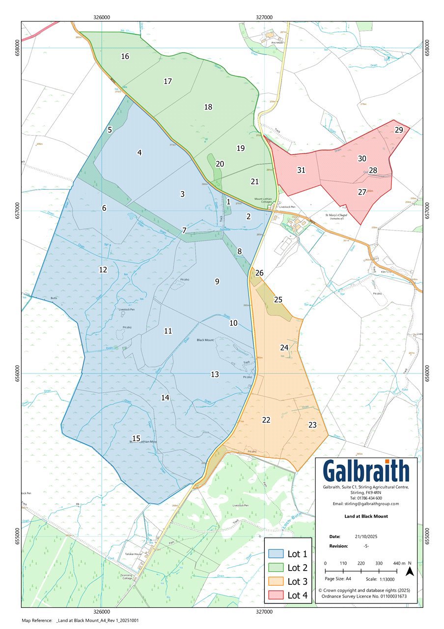 SITUATIONThe Land at Black Mount is situated in a scenic and accessible rural location within Midlothian, close to the settlement of Howgate and 3.5 miles to the southeast of the popular town of Penicuik. The land benefits from direct access onto adjacent public roads and is only 7.5 miles south of the Edinburgh City Bypass, offering excellent transport links to both the north and south of the country. Penicuik provides a range of day-to-day amenities including a variety of retail and business services, and primary and secondary schools. The large retail and industrial park at Straiton, which is located about 7 miles to the north, offers a wide selection of services and major retailers including IKEA and Costco.The nearby train station at Gorebridge, around 7 miles from the property, provides fast rail connections to Edinburgh and beyond. The City of Edinburgh offers a broader range of services, including financial centres, retail and business facilities, and regular mainline railway connections, international airport services are available from Edinburgh Airport.This part of Midlothian is renowned for its high-quality mixed farming units, and the Land at Black Mount offers a mix of fertile soils capable of producing good yields across a variety of arable crops and areas of pasture and grazing land well suited to the rearing of livestock. The area is well served by a range of agricultural merchants and suppliers, with several agricultural contractors available to provide additional farming resources if required. The excellent road network provides easy access to a number of livestock markets located in Lanark, Stirling and St Boswells offering a choice of outlets for livestock purchases and sales.DESCRIPTIONThe Land at Black Mount offers a versatile block of mixed arable and livestock farmland extending to approximately 346.32 Ha (855.76 Acres) in total and is located within a highly accessible location within rural Midlothian. The land is split into four separate blocks by the B6372 and the minor public road which leads south from the A6094 and Rosslynlee Trout Fishery, and comprises a productive mix of arable, pasture and grazing ground with a number of areas of woodland providing shelter and amenity to the holding. The land benefits from direct access onto adjacent public roads, which link onto the A701 to the west or the A7 to the east. The land has been principally classified as Grade 4 and 5 by The James Hutton Institute with some smaller areas of Grade 3 and is of a varying aspect rising overall from 253m to 280m above sea level. The arable land has historically been farmed on a mixed arable operation, with cereals and temporary grass all grown as part of the rotation.METHOD OF SALEThe Land at Black Mount is offered for sale as a whole or in 4 lots.LOT 1: ABOUT 223.61 HA (552.55 ACRES)The land within Lot 1 comprises a contiguous area of arable, pasture and grazing land which extends in total to about 223.61 Ha (552.55 Acres) and is bound to the north by the B6372 and to the east by a minor public road which leads to the small hamlet of Cockmuir. The land comprises a productive mix of arable and silage ground with a large area of grazing ground located to the southwest of holding which forms part of the Mount Lothian Moss and has been designated as an area of peatland. The land has been classified by the James Hutton Institute as mix of Grade 3.2, 4.1, 4.2 and 5.3 with some areas of the grazing land forming class 3, 4, and 5 peatlands. The land within Lot 1 is varying aspect rising overall from 261m on the southern boundary to 280m above sea level at its highest point on the northwest boundary. The more productive enclosures are all laid out in a good size, well suited to use by modern machinery and can be accessed directly from the adjacent public road or via internal farm tacks. The majority of the grazing fields benefitting from access to natural source water supplies. The land benefits from small areas of conifer and broadleaved woodland providing shelter and amenity to the holding. Please note an area of conifer woodland has recently been clear-felled, all the felled timber will be retained by the seller.LOT 2: ABOUT 57.27 HA (142.66 ACRES)The land within Lot 2 comprises a productive block of farmland which extends in total to about 57.27 Ha (142.66 Acres) and is located to the northeast of the B6372 and is bound to the east by the minor public road which leads to Rosslynlee Trout Fishery and the A6094. The land predominantly comprises a productive mix of arable and silage ground with smaller areas of pasture and broadleaved woodland. The land is generally of a southeasterly aspect and rises from 253m on the northeastern boundary to 273m above sea level at its highest point adjacent to public road. The land has been classified by The James Hutton Institute as a mix of grade 3.2, 4.1, and 4.2 and the enclosures are all laid out in a good size and well suited to use of modern machinery with direct access available from the B6372 public road. The grazing fields benefitting from access to natural source water supplies.LOT 3: ABOUT 39.39 HA (97.33 ACRES)The land within Lot 3 extends in total to about 39.39 Ha (97.33 Acres) and is located to the south of the B6372 and is bound to the west by a minor public road which leads to the small hamlet of Cockmuir. The land comprises a mix of arable, silage and grazing ground with a small area of peatland. The land is enclosed on the northern boundary by an area of conifer and broadleaved woodland. Please note an area of conifer woodland has recently been clear-felled and all felled timber is to be retained by the seller. The land is generally of an easterly aspect, rising from 256m on the eastern boundary to 271m above sea level at its highest point adjacent to the public road. The land has been classified by The James Hutton Institute as Grade 4.1, 4.2 and 5.3 and all of the enclosures benefit from direct access onto the adjacent minor publ